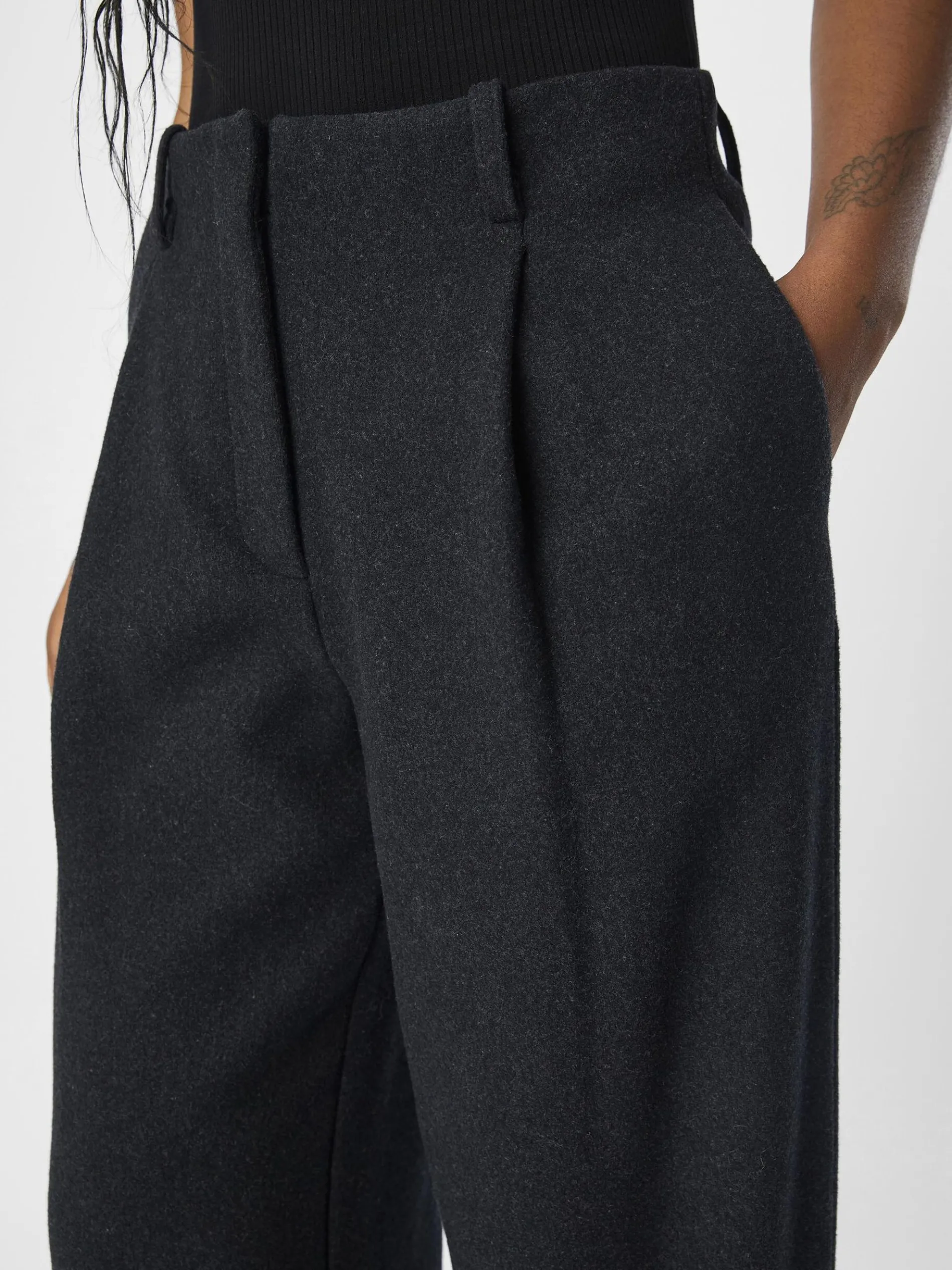 – High-waist barrel-fit broek- Wolmix- Riemlussen- Plooien aan de voorkant- Ritssluiting met haak- en oogsluiting- Barrel fit