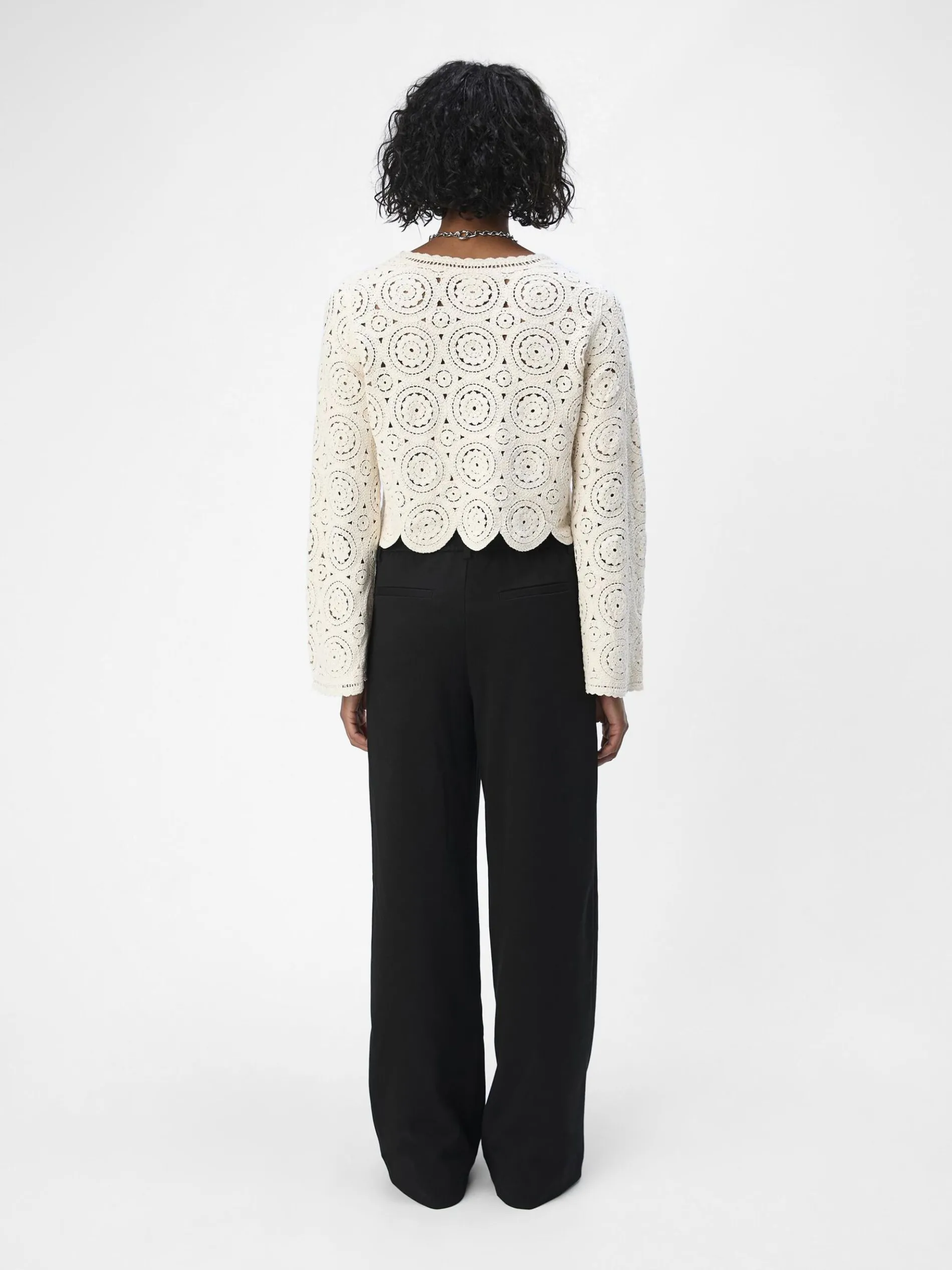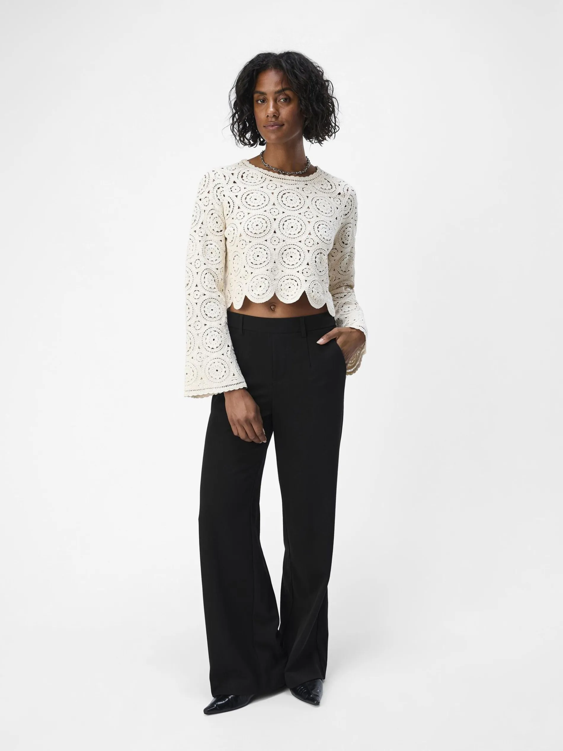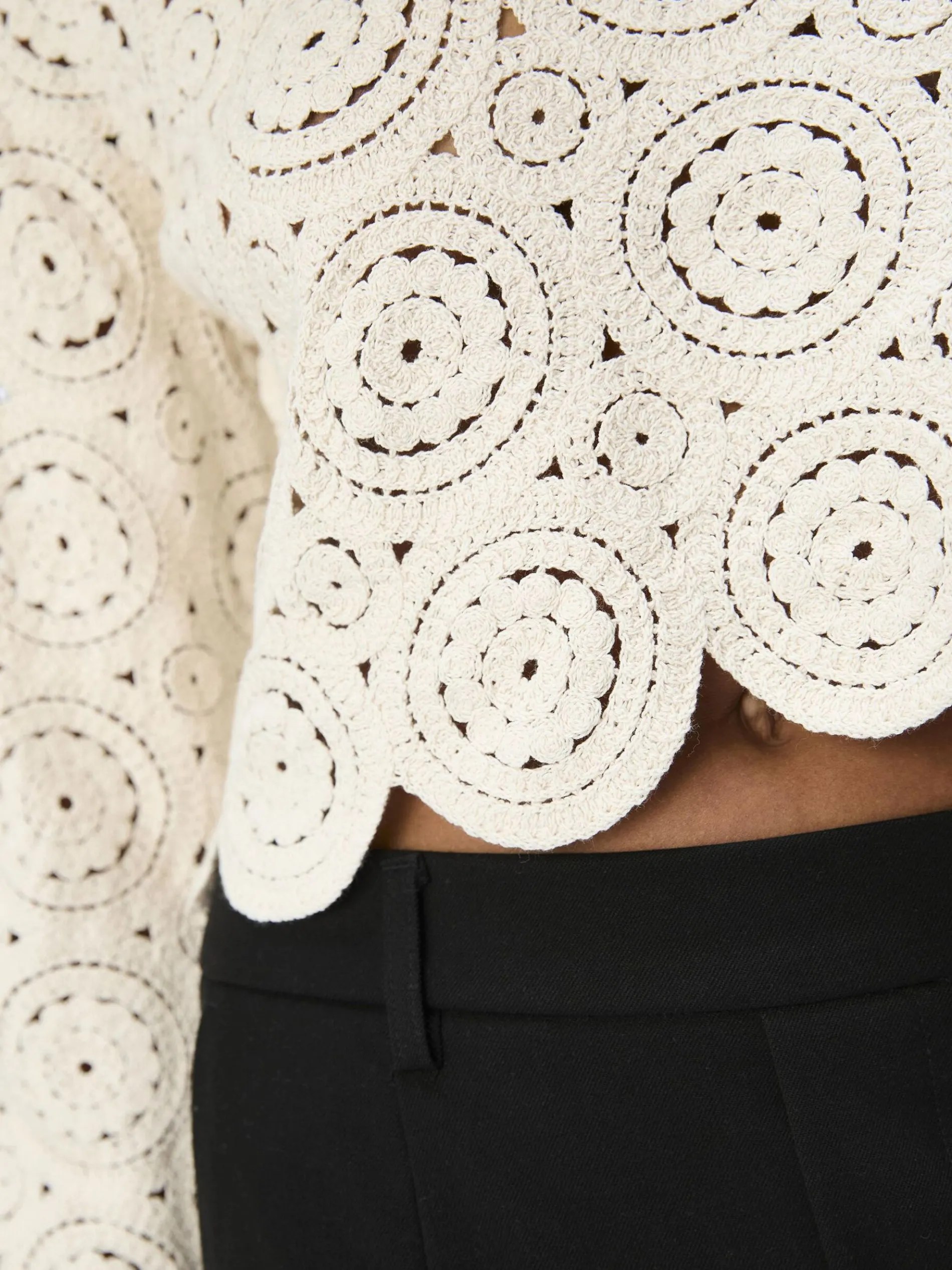 – Geborduurde trui met ronde details- Ongevoerd opengestikt ontwerp- Geschulpte zoom- Lange mouwen met iets verlaagde schoudernaden- Cropped fit