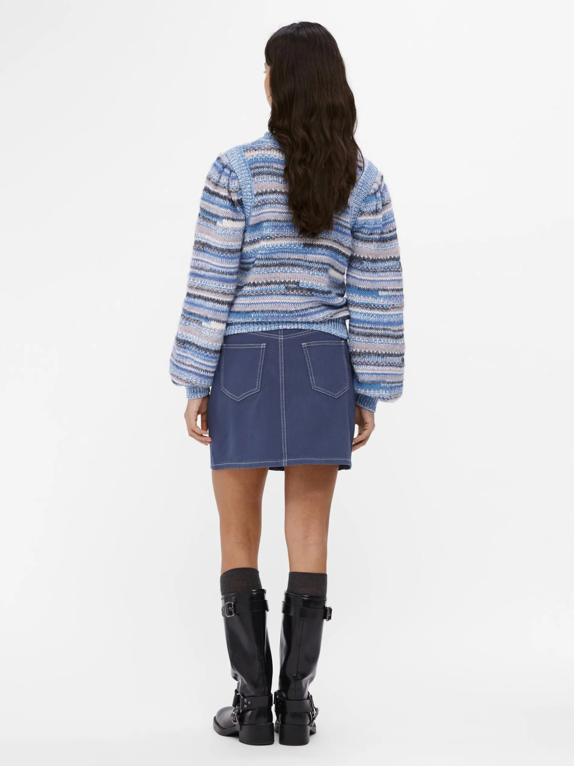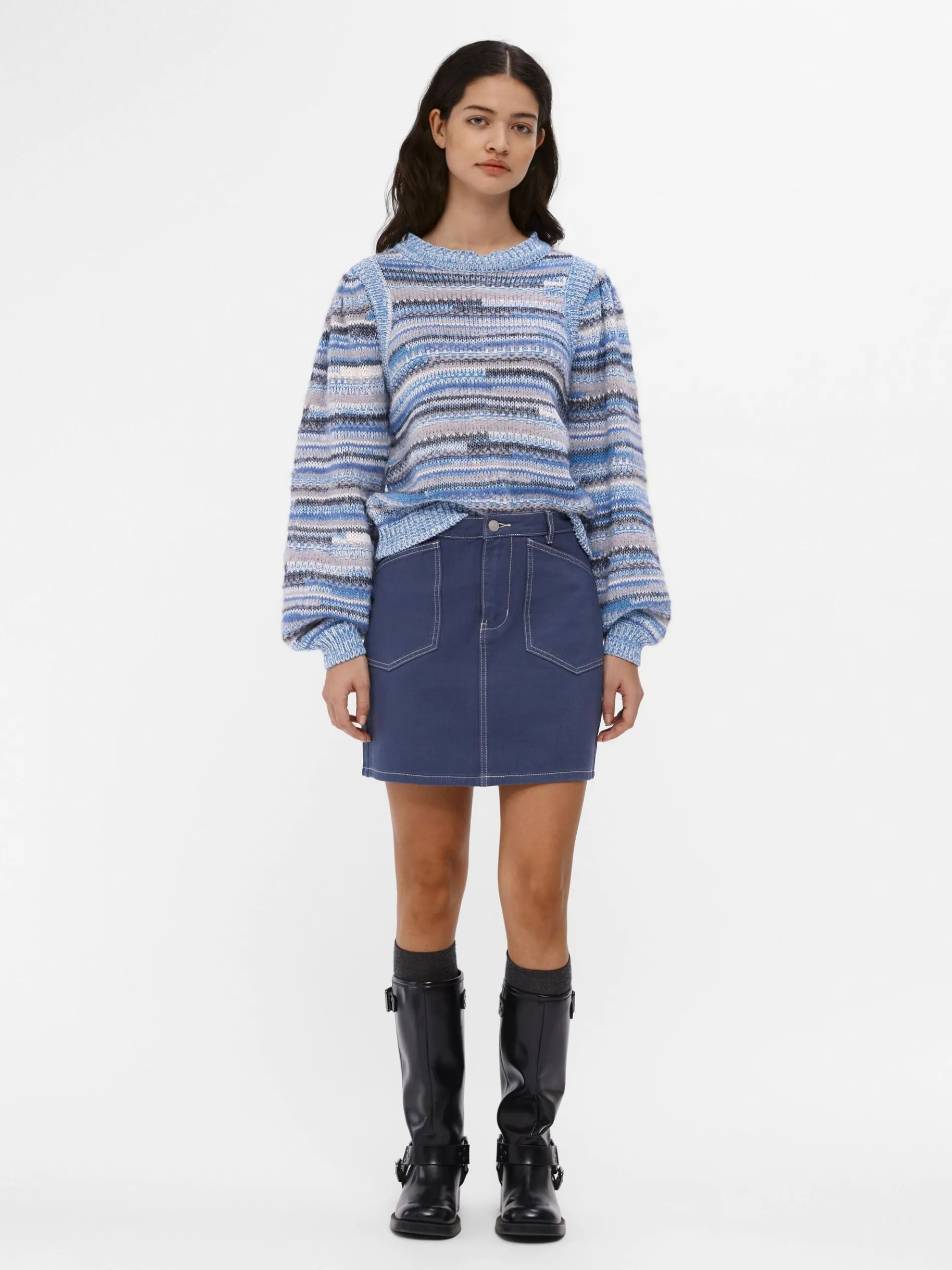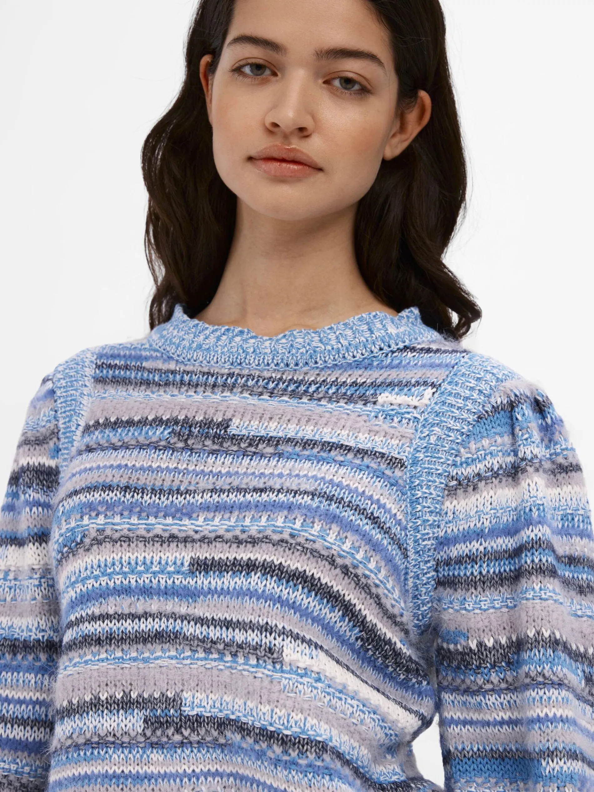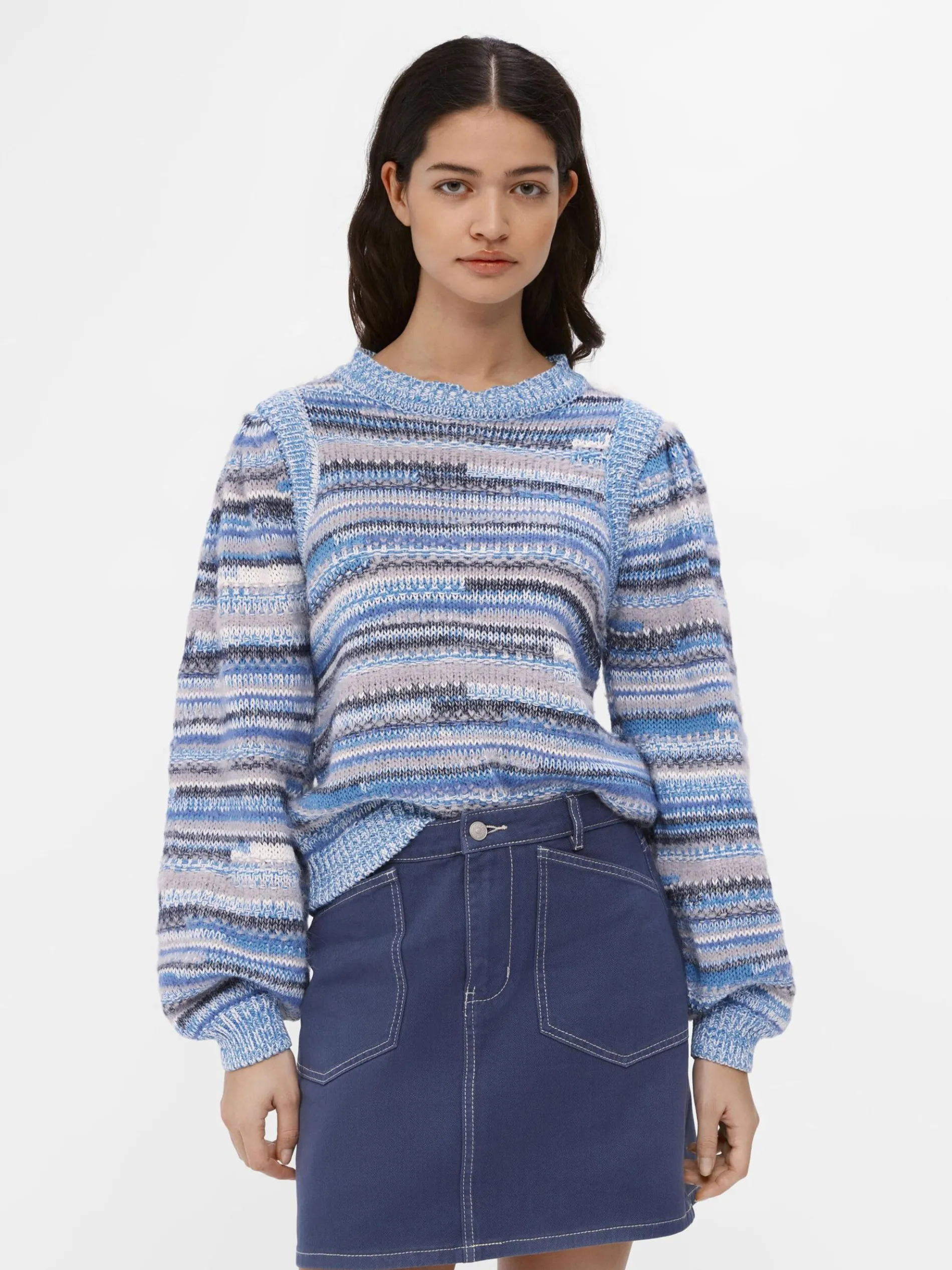 – Gebreide gemêleerde trui- Ronde hals- Lange volumineuze mouwen- Geribde contrasterende boorden- Regular fit