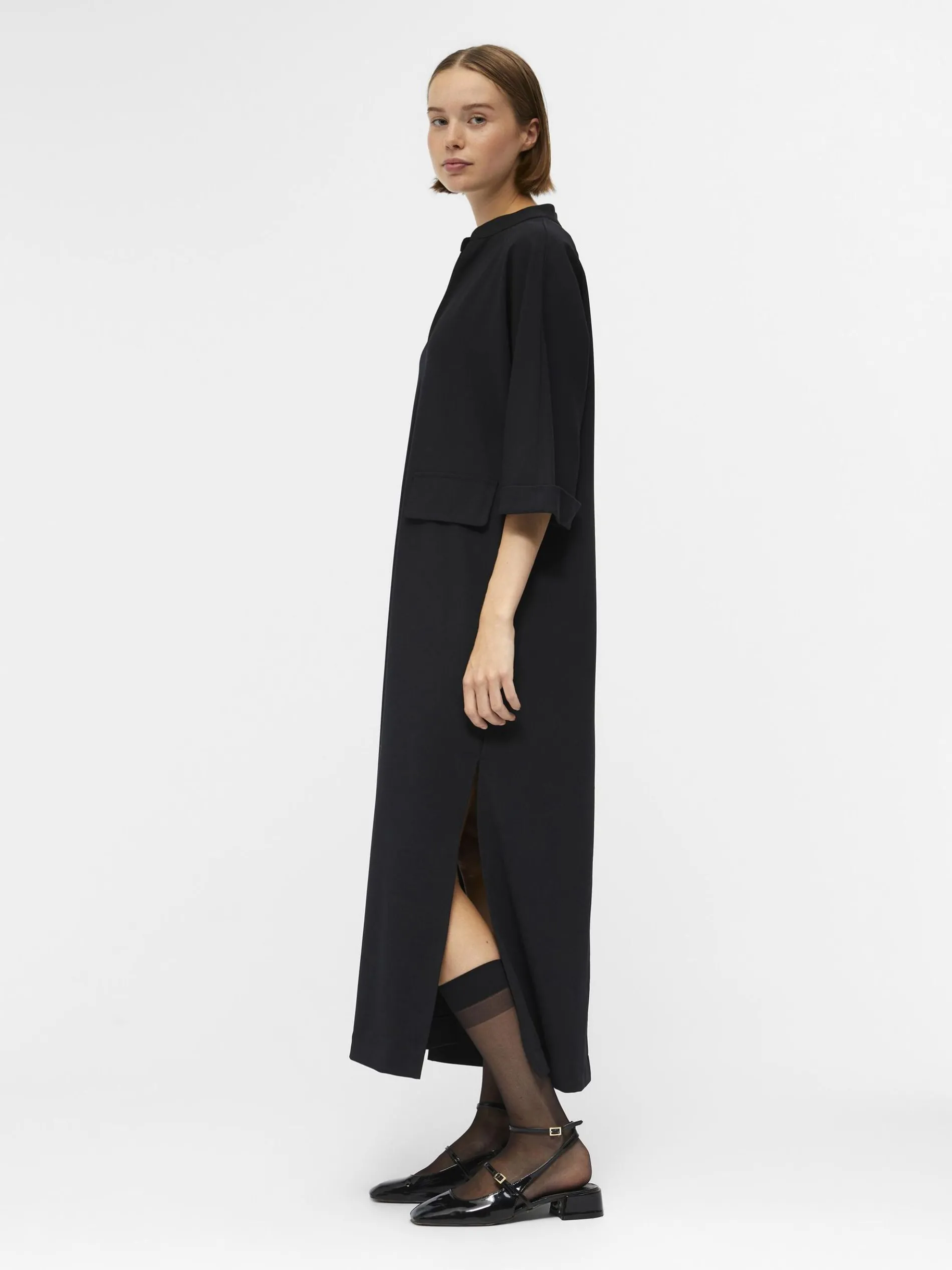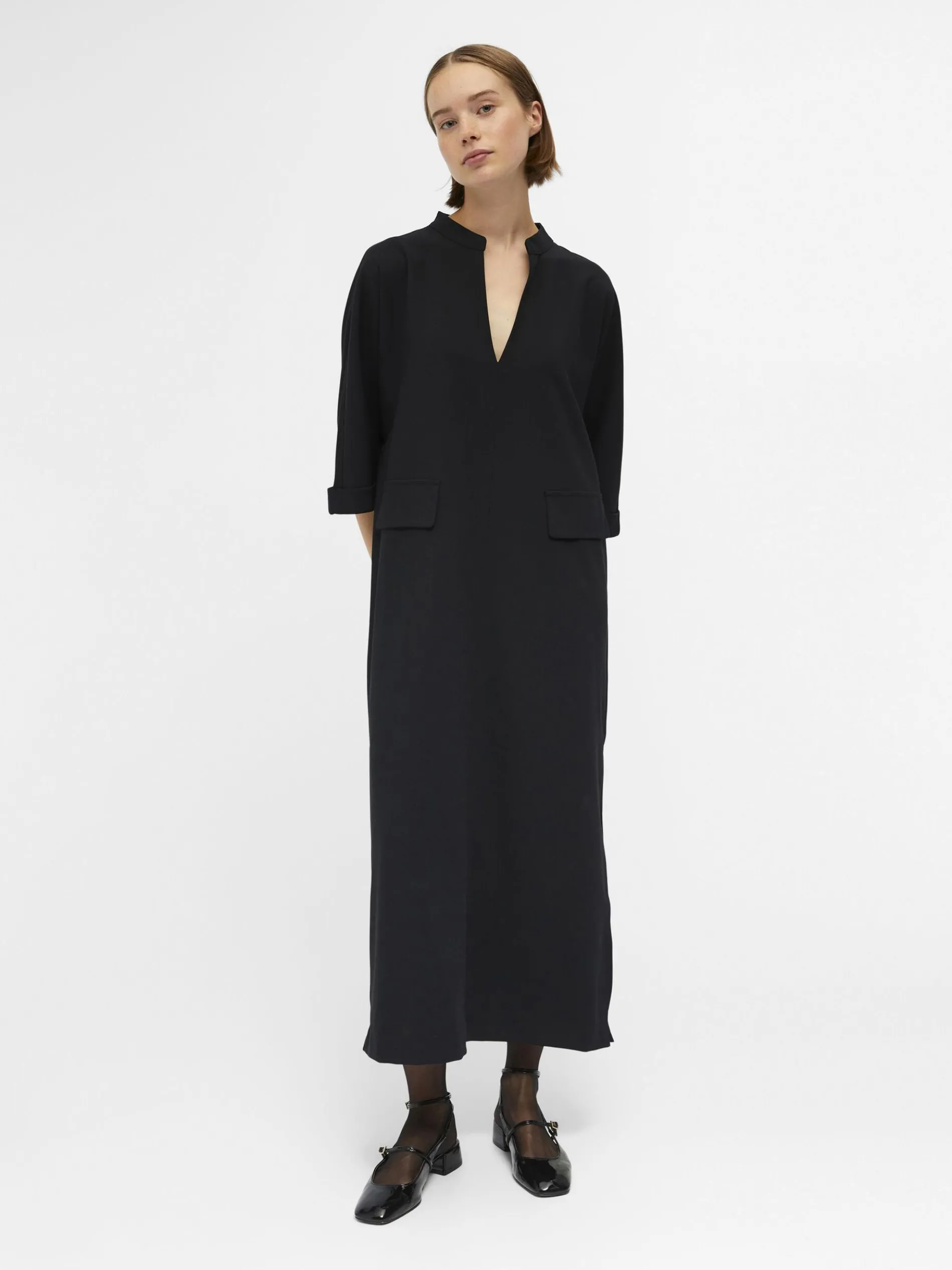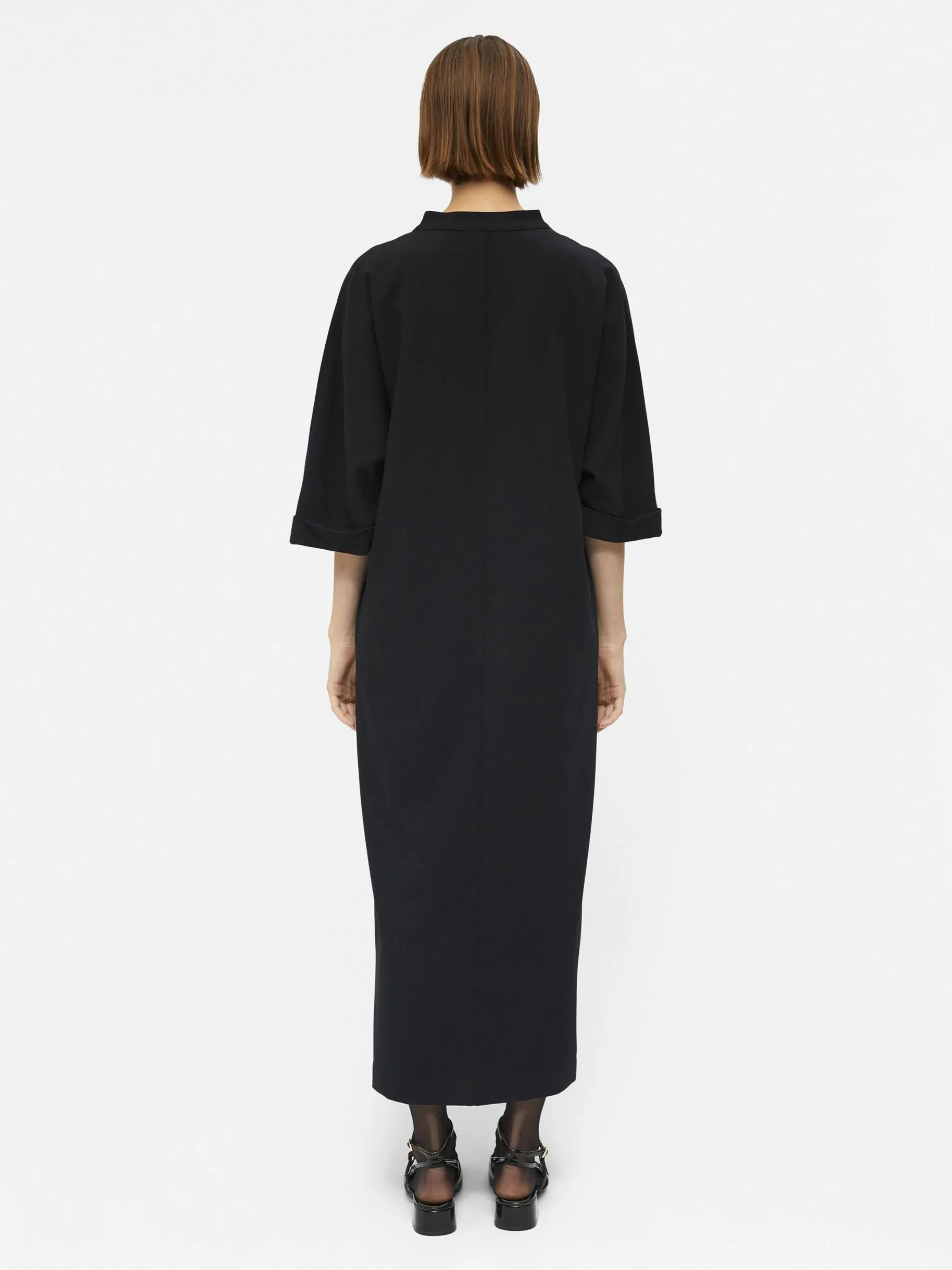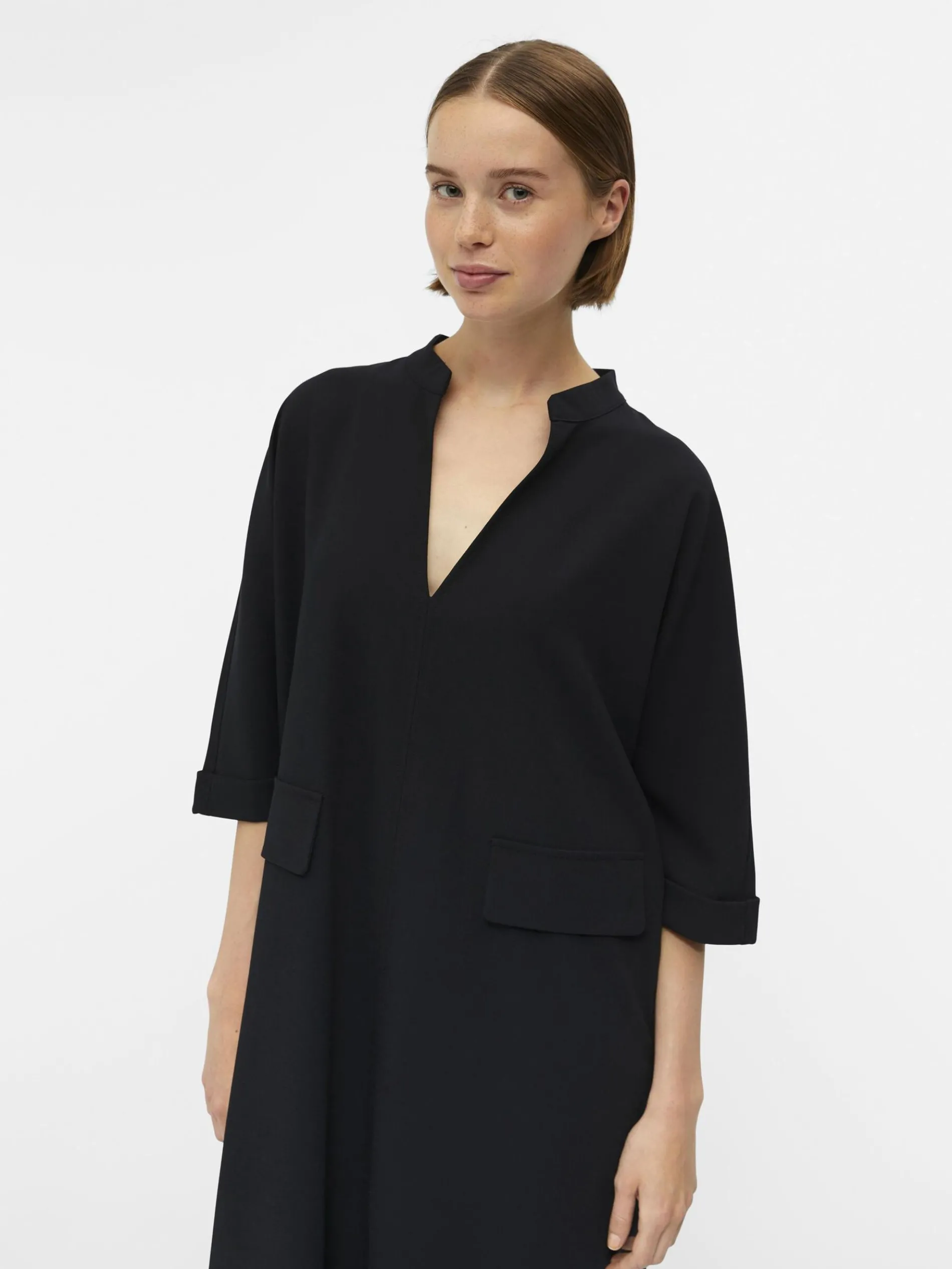 – Midi-jurk met V-hals- Baseball kraag- Korte mouwen met omslag- Paspelzakken met klep aan de voorkant- Split aan de zijkant- Loose fit