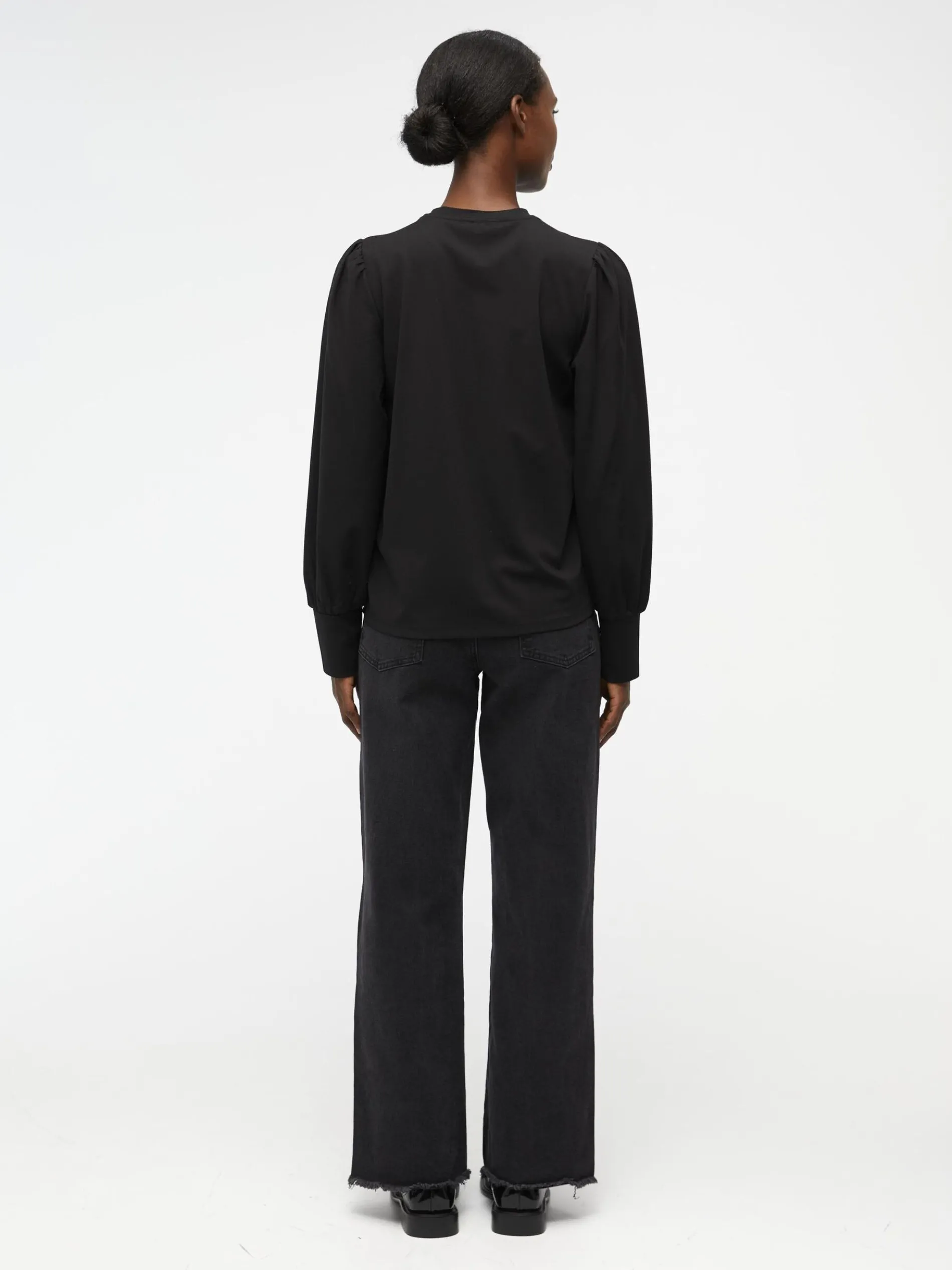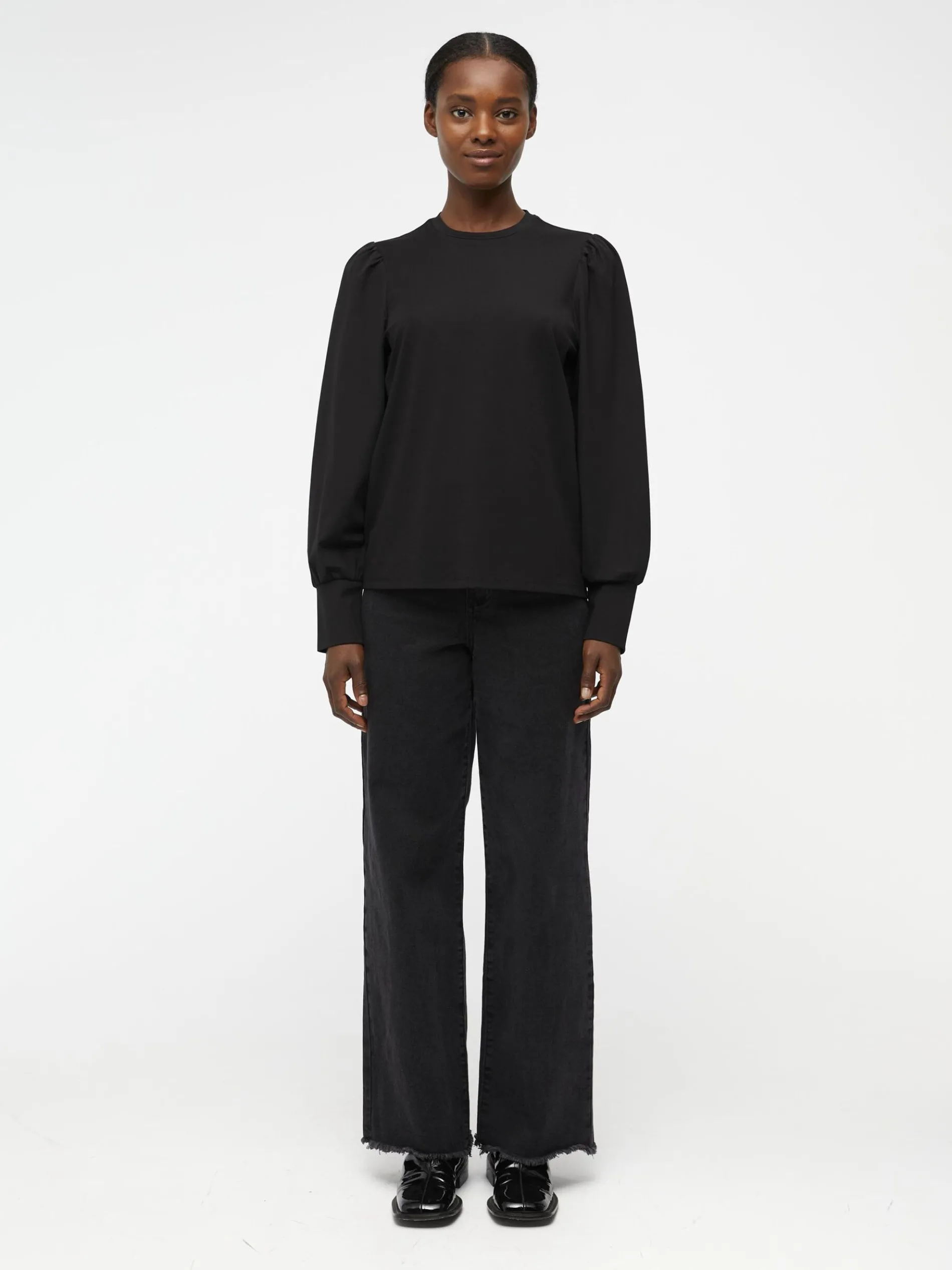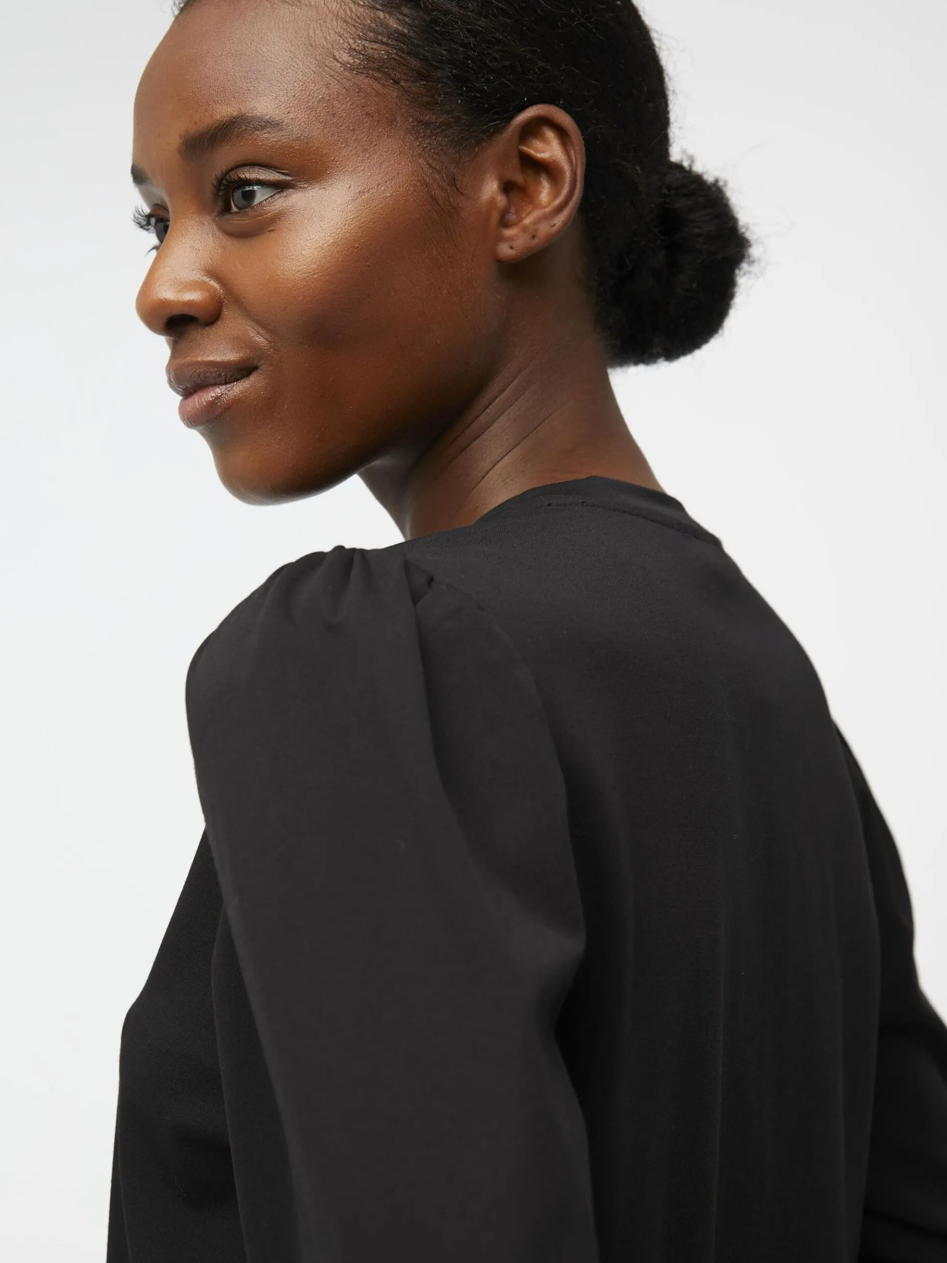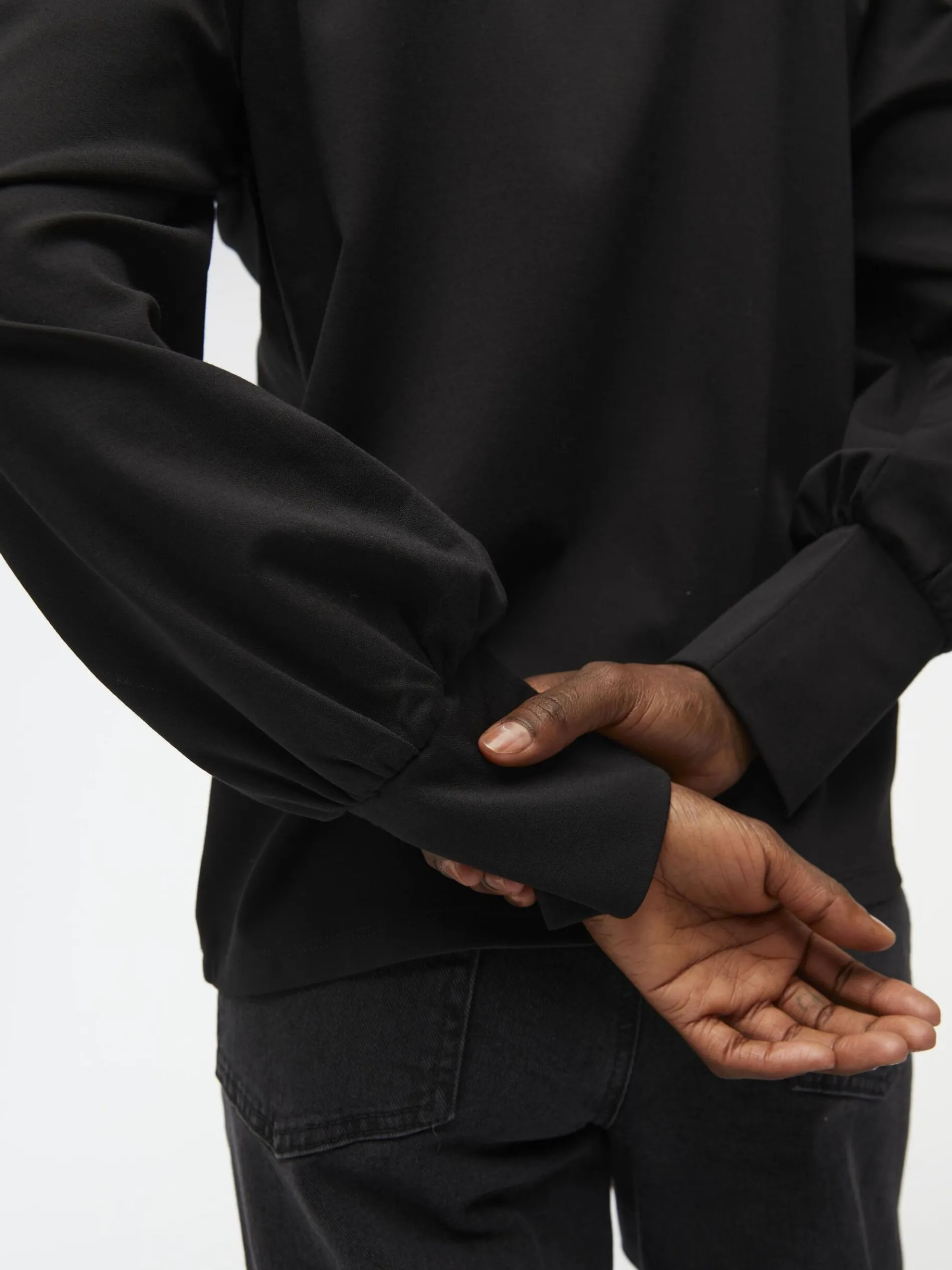 – Ronde hals- Lange volumineuze mouwen- Extra lange nauwsluitende manchetten- Stretchy stof- Gemaakt van een milieuvriendelijkere stof- Regular fit- Model draagt maat 36