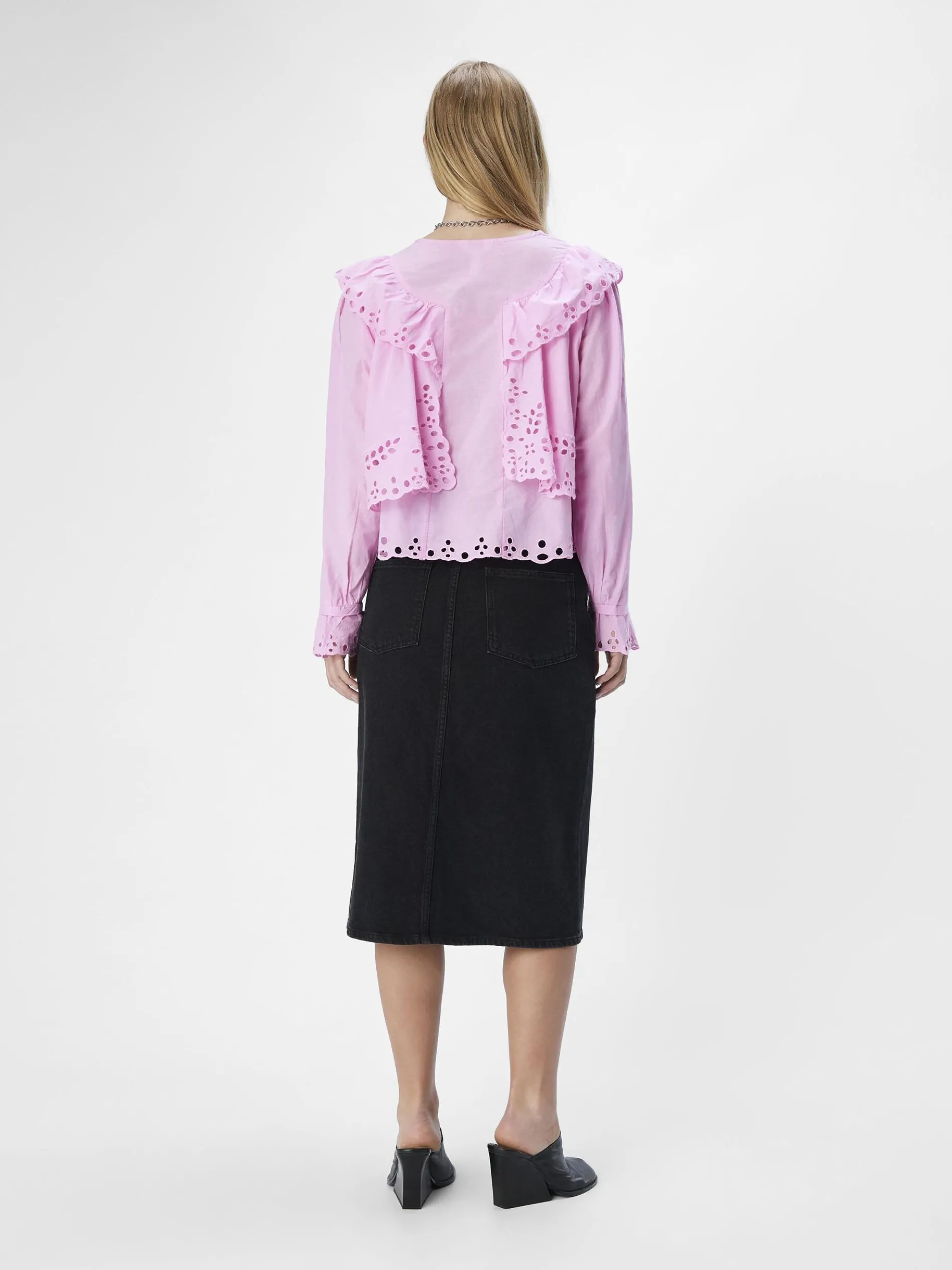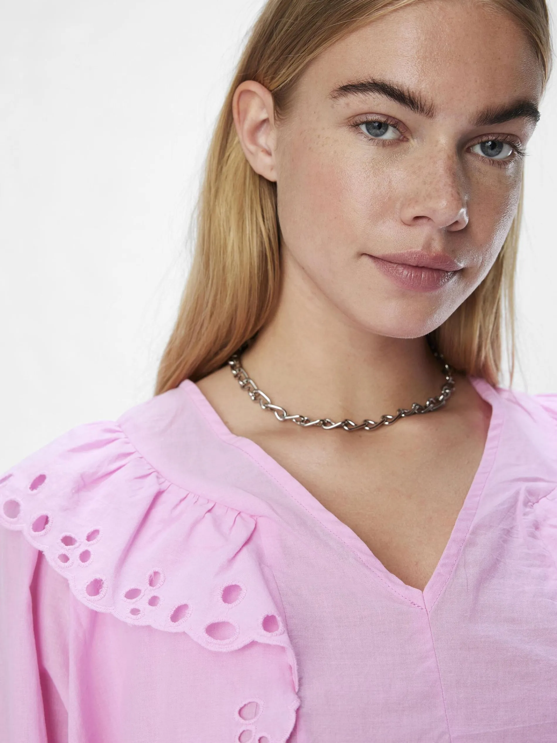 – Top met broderie anglaise- V-hals- Met ruches- Lange mouwen- Loose fit
