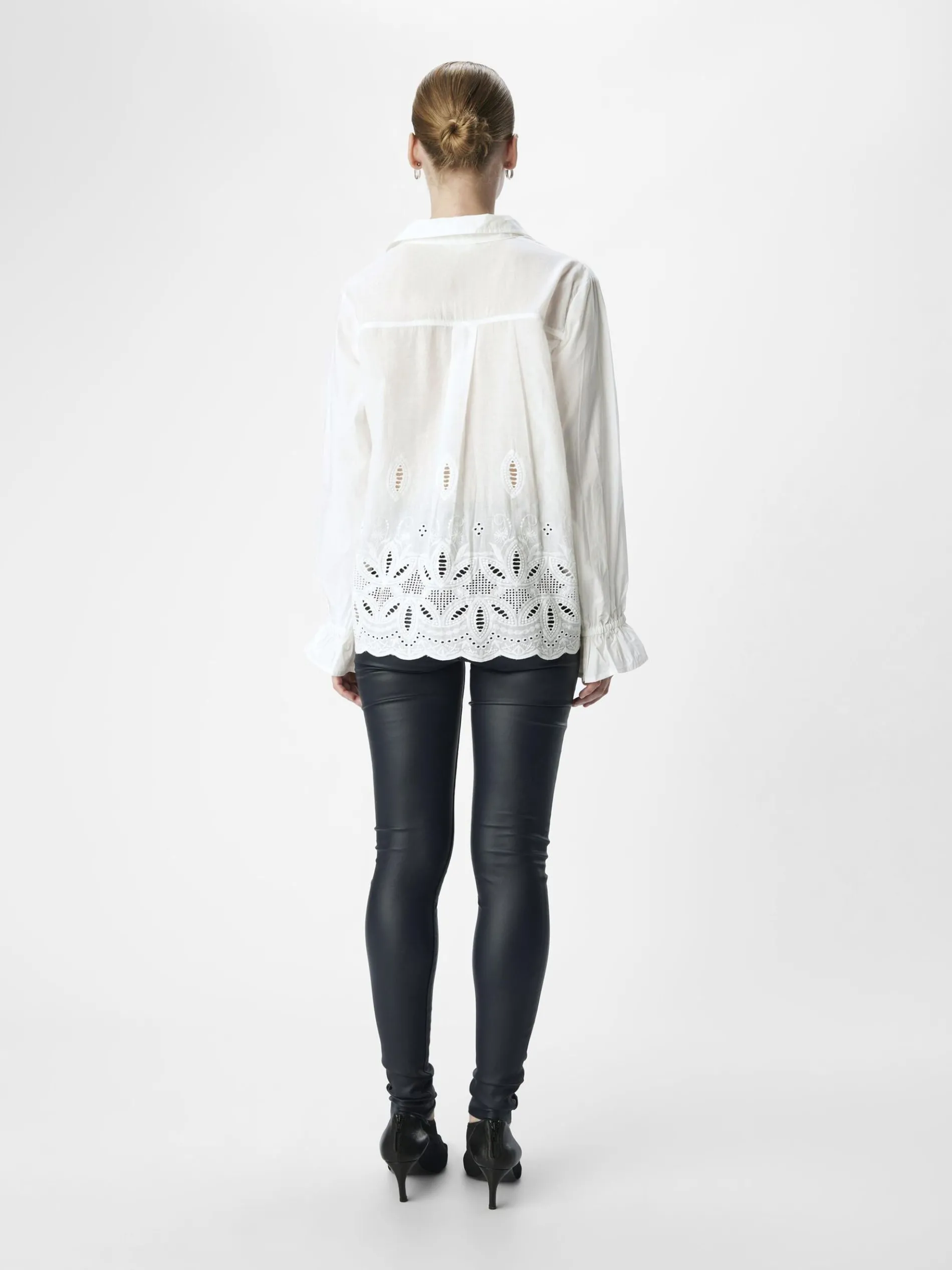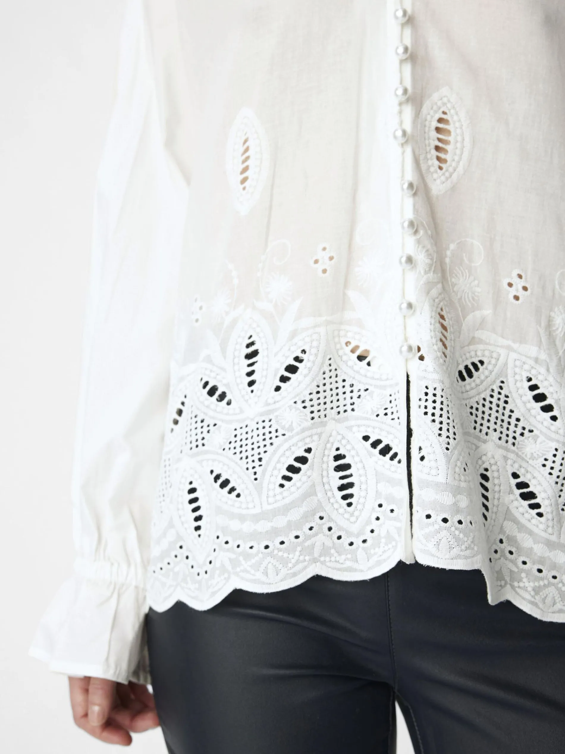 – Top met broderie anglaise- Gespreide kraag met V-hals- Lange volumineuze mouwen- Uitlopende elastische manchetten- Knoopsluiting aan de voorkant- Loose fit