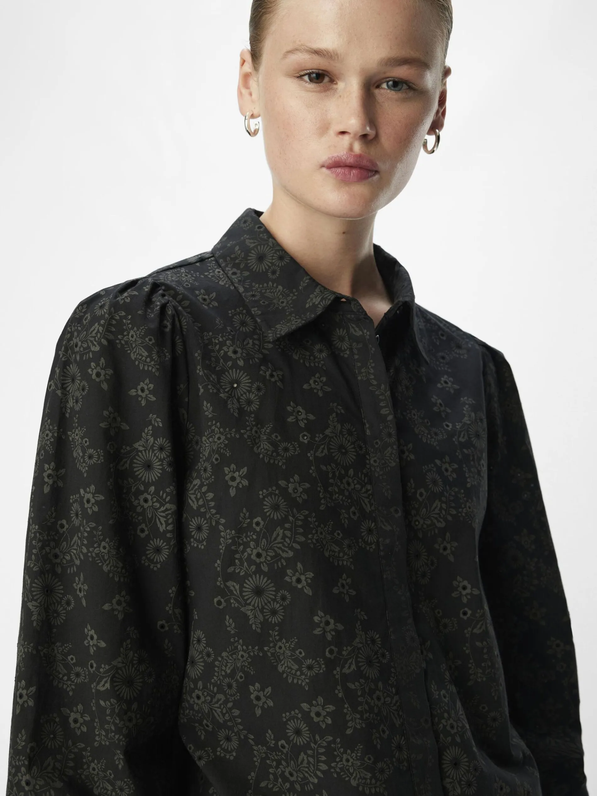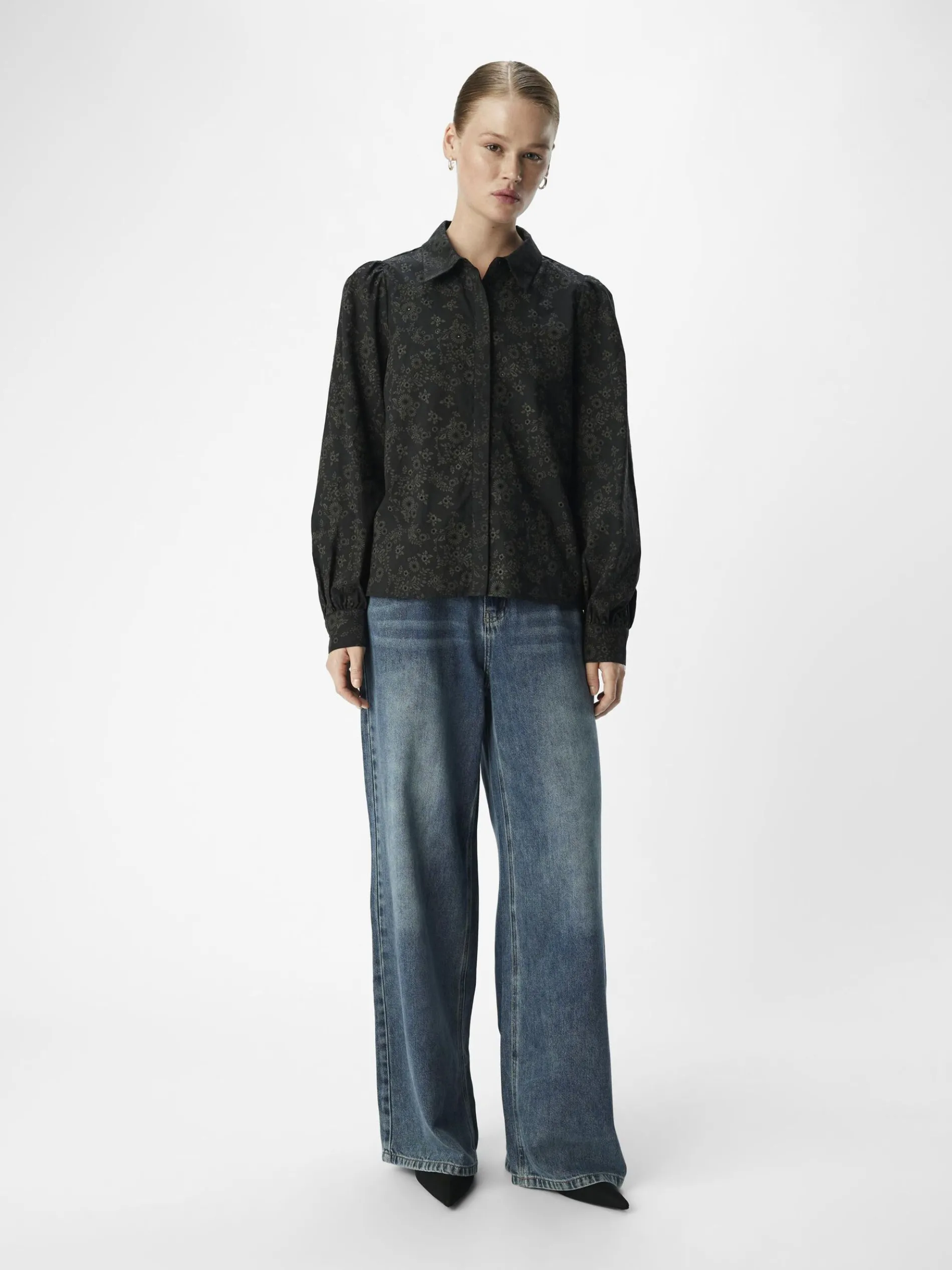 – Top met broderie anglaise- Normale kraag- Plooien op de schouders- Lange mouwen en manchetten met knopen – Blinde knoopsluiting aan de voorkant- Regular fit