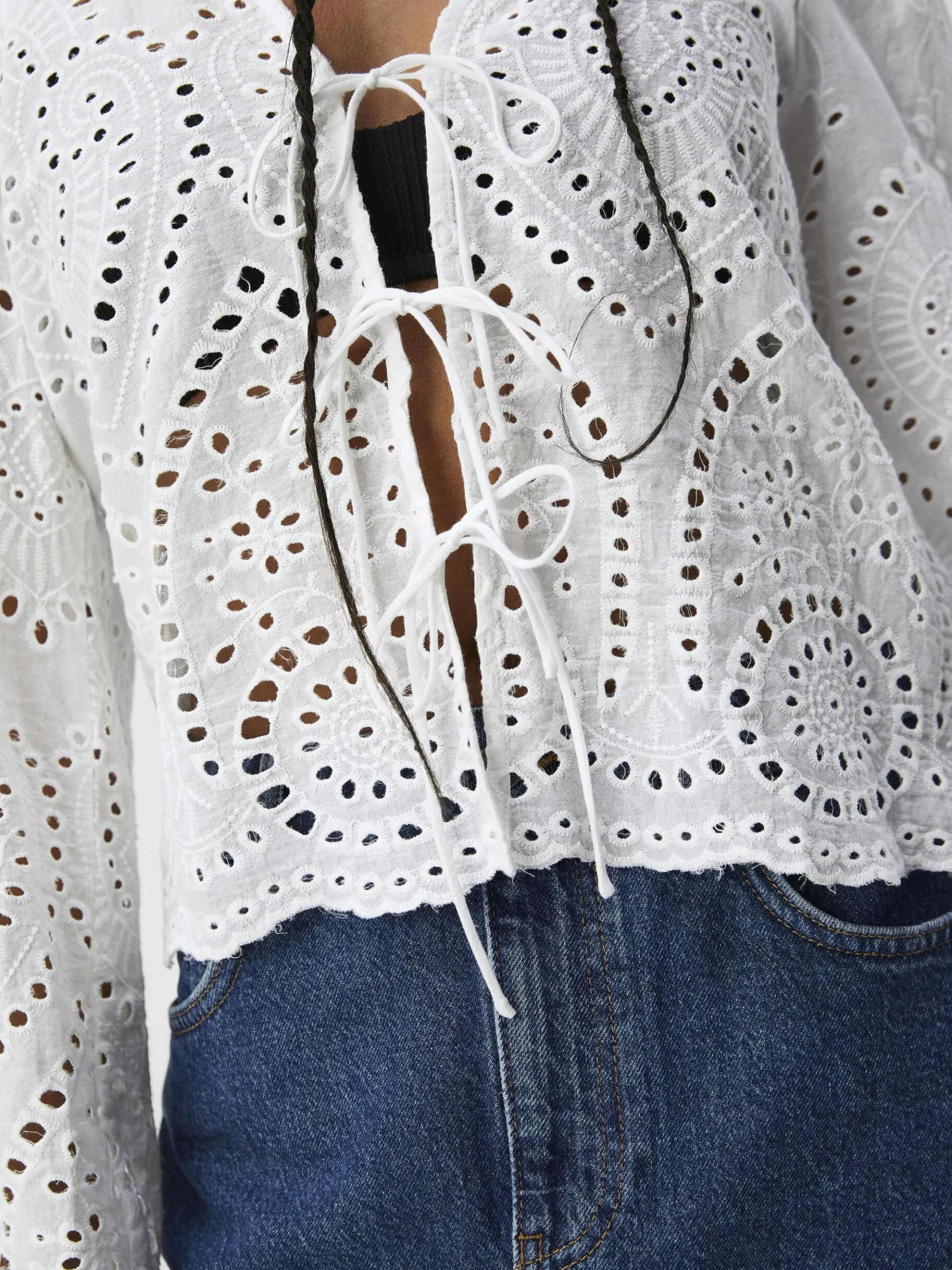 – Katoenen broderie anglaise blouse- V-hals met strik- Lange trompetmouwen- Zonder voering- Regular fit