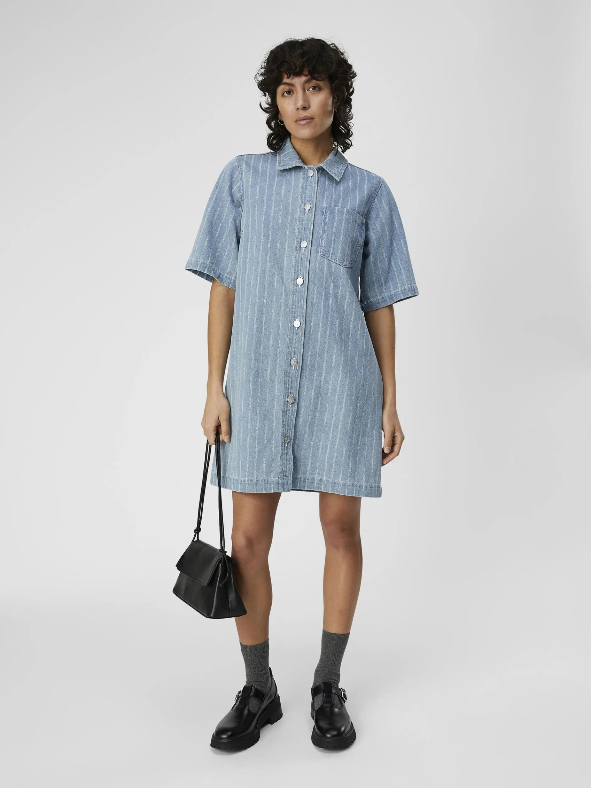 -Gestreepte denim blousejurk-Mini lengte-Normale kraag-Knoopsluiting aan de voorkant-Opgestikte zak op de borst-Geplooid effect bij het achterpand-Ongevoerd-Loose fit