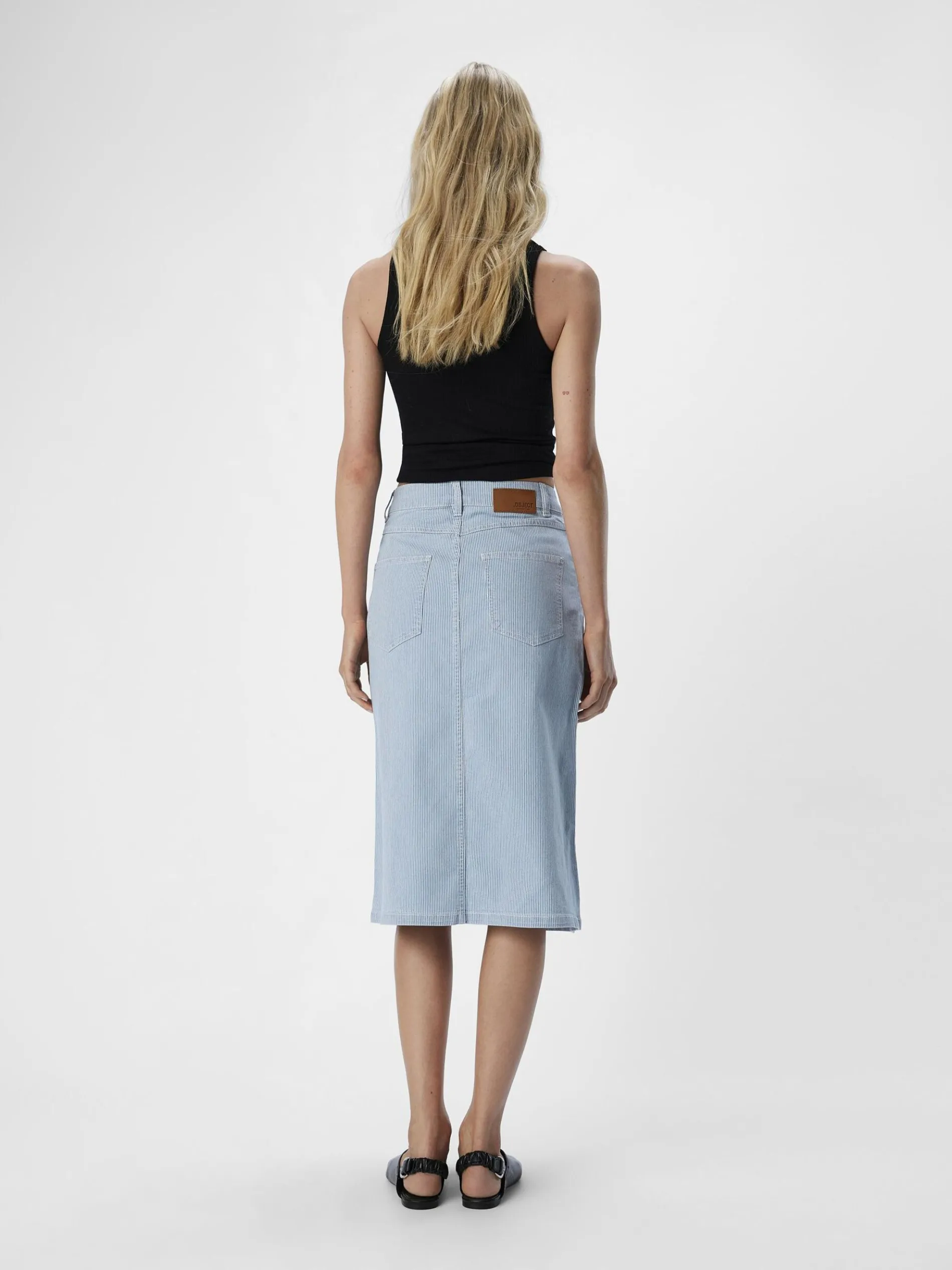-Denim midirok- Mid-waist met riemlussen- 5-pocket design- Rits- en knoopsluiting- Split aan de voorkant- Regular fit