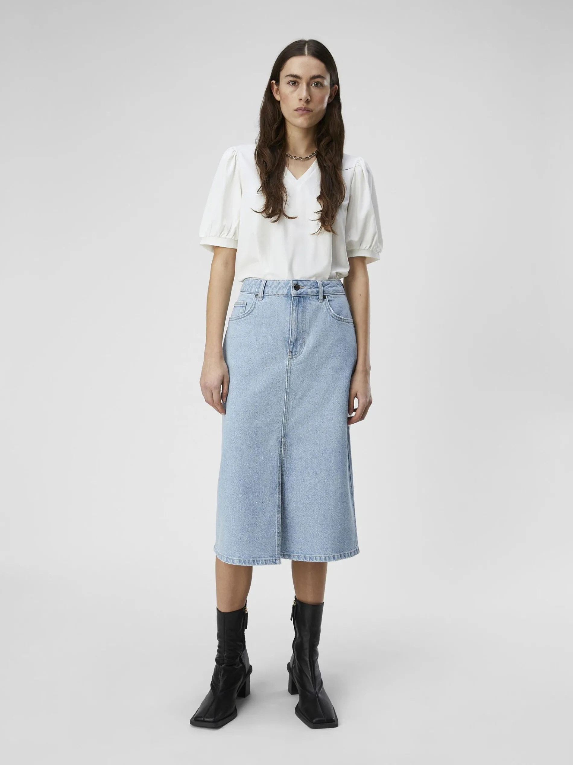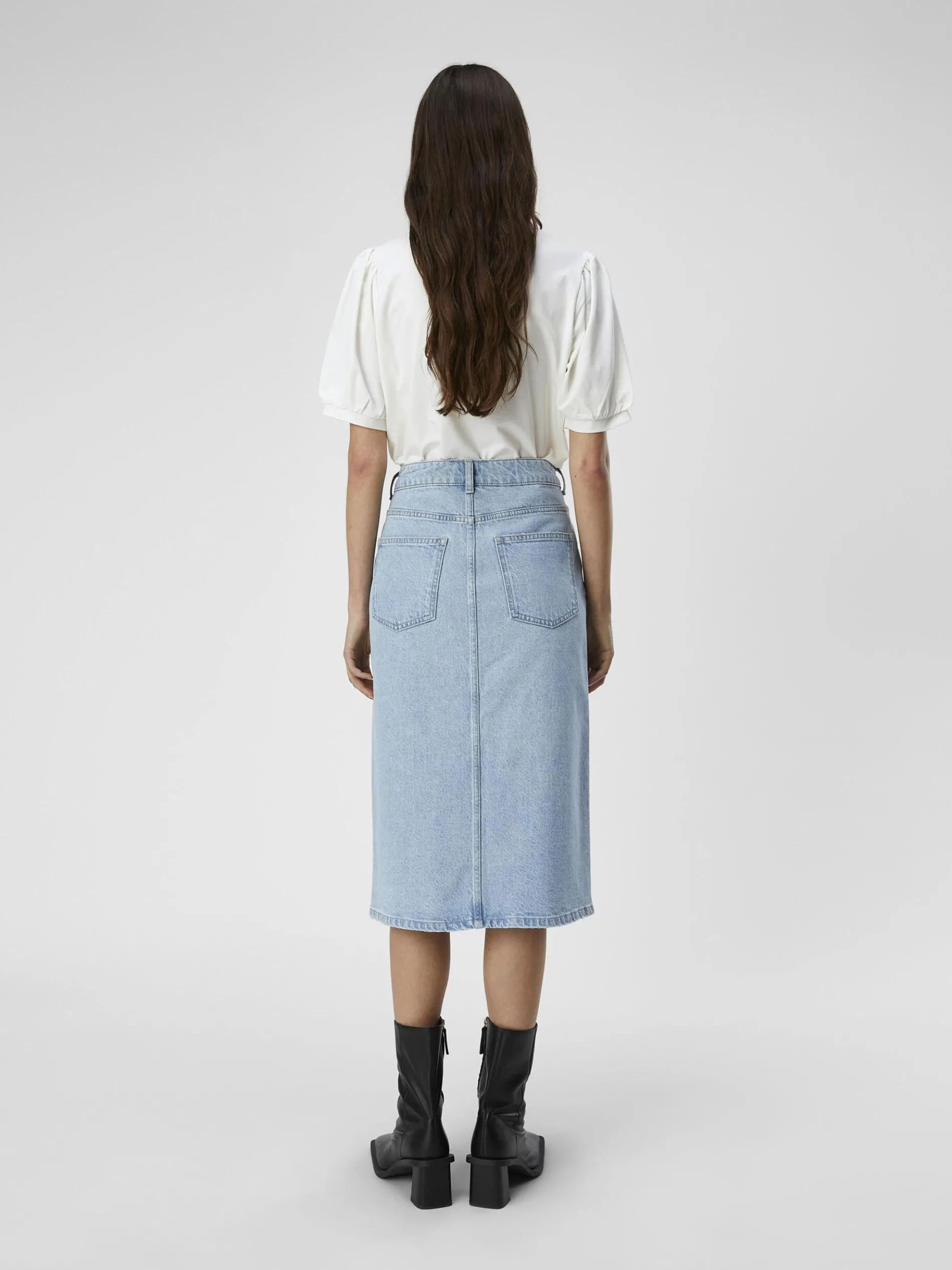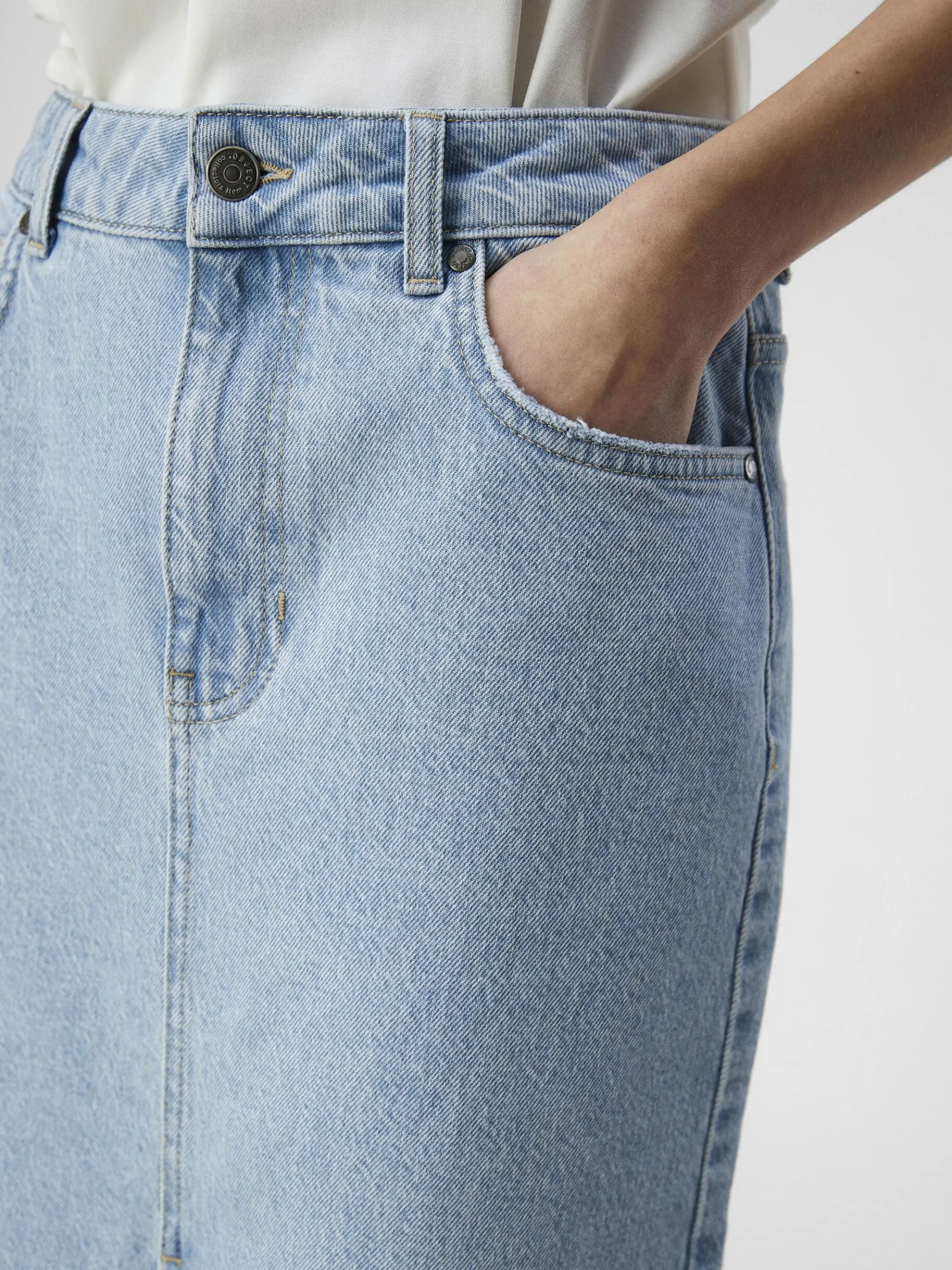 -Mid-waist denim midirok-Ontwerp met 5-zakken-Split aan de voorkant-Ritssluiting met knoop-Riemlussen-Model draagt maat 36-Gemaakt met duurzamere stoffen