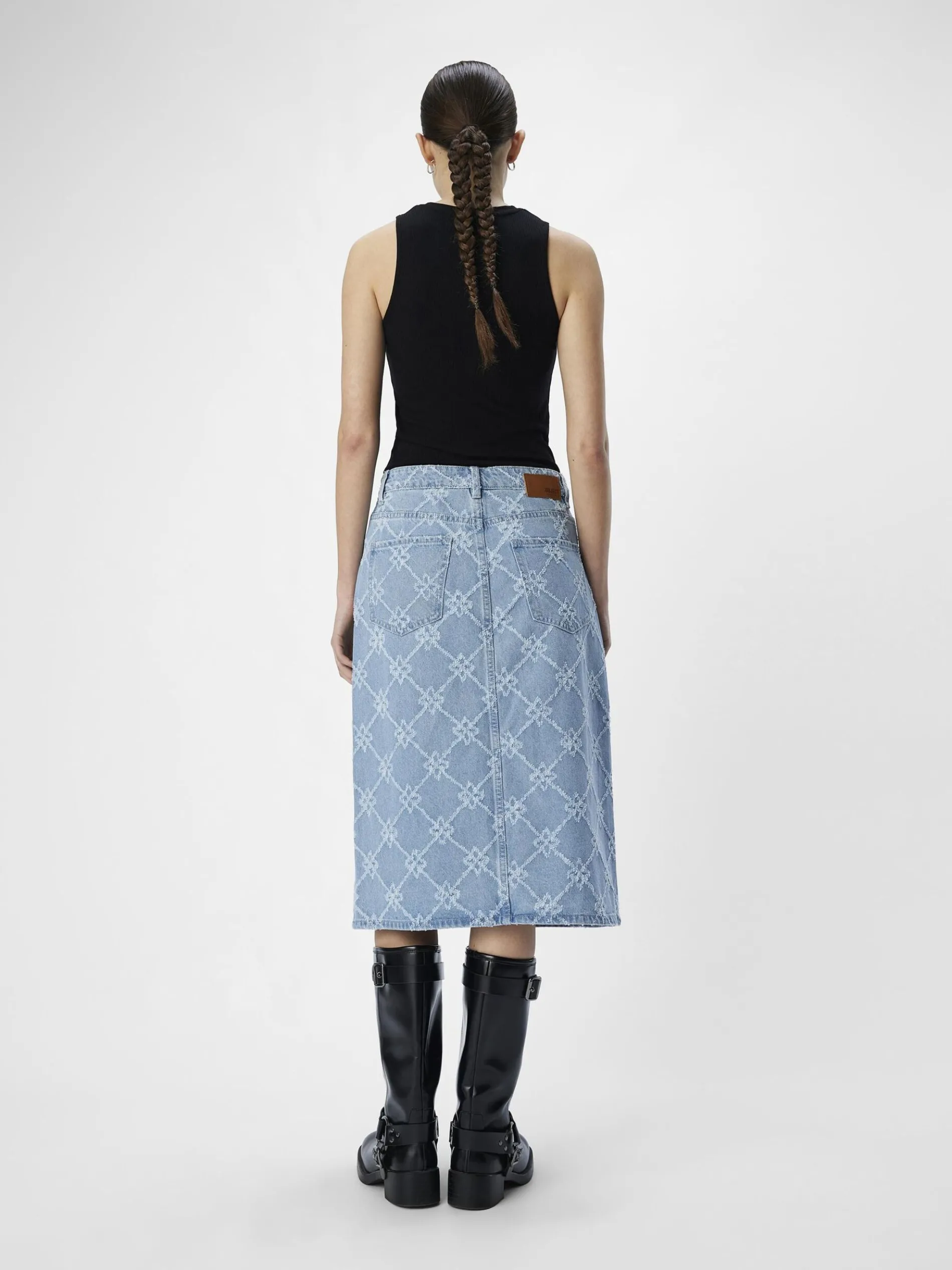 – Denim midirok met print- Hoge taille- Versleten look- Split aan de voorkant- Ritssluiting met knoop- Riemlussen- Jacron label- Regular fit
