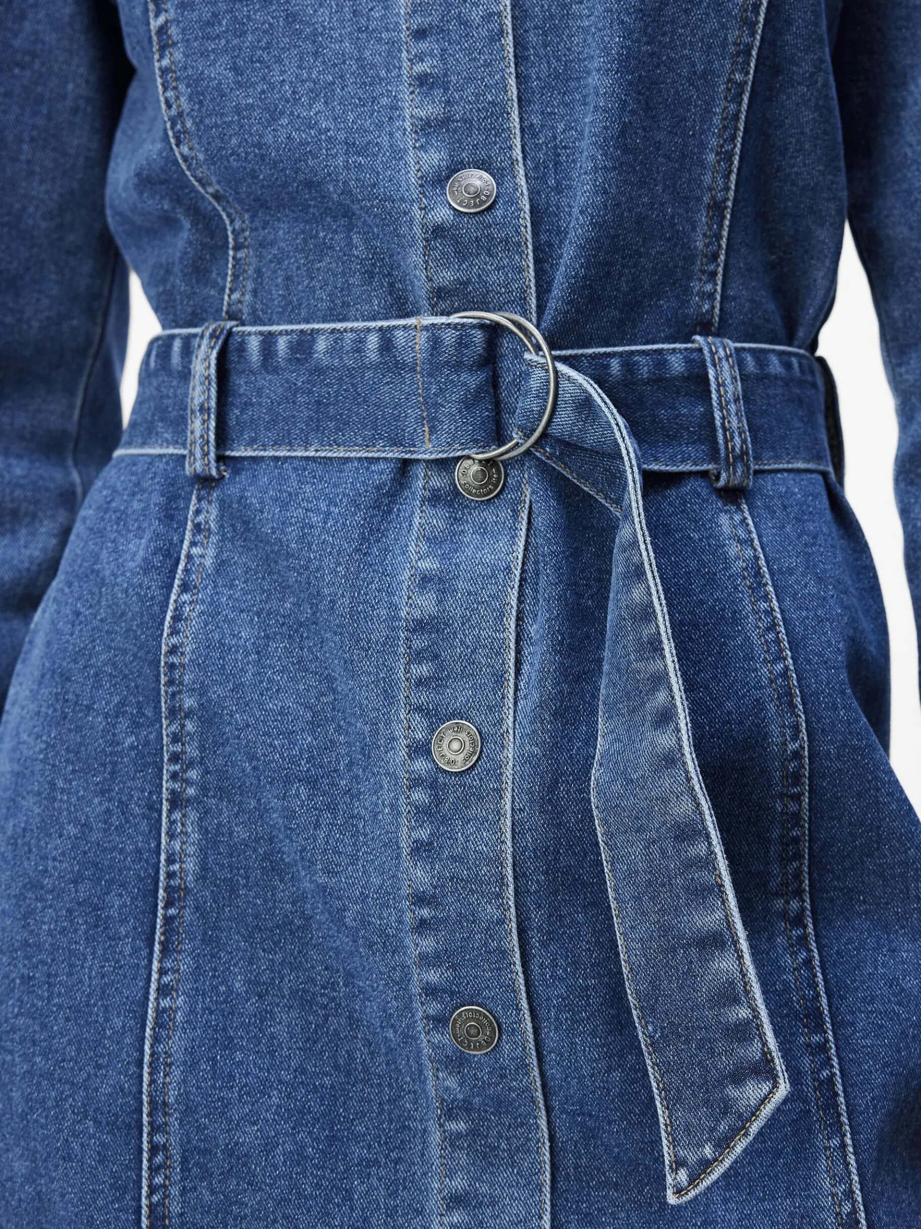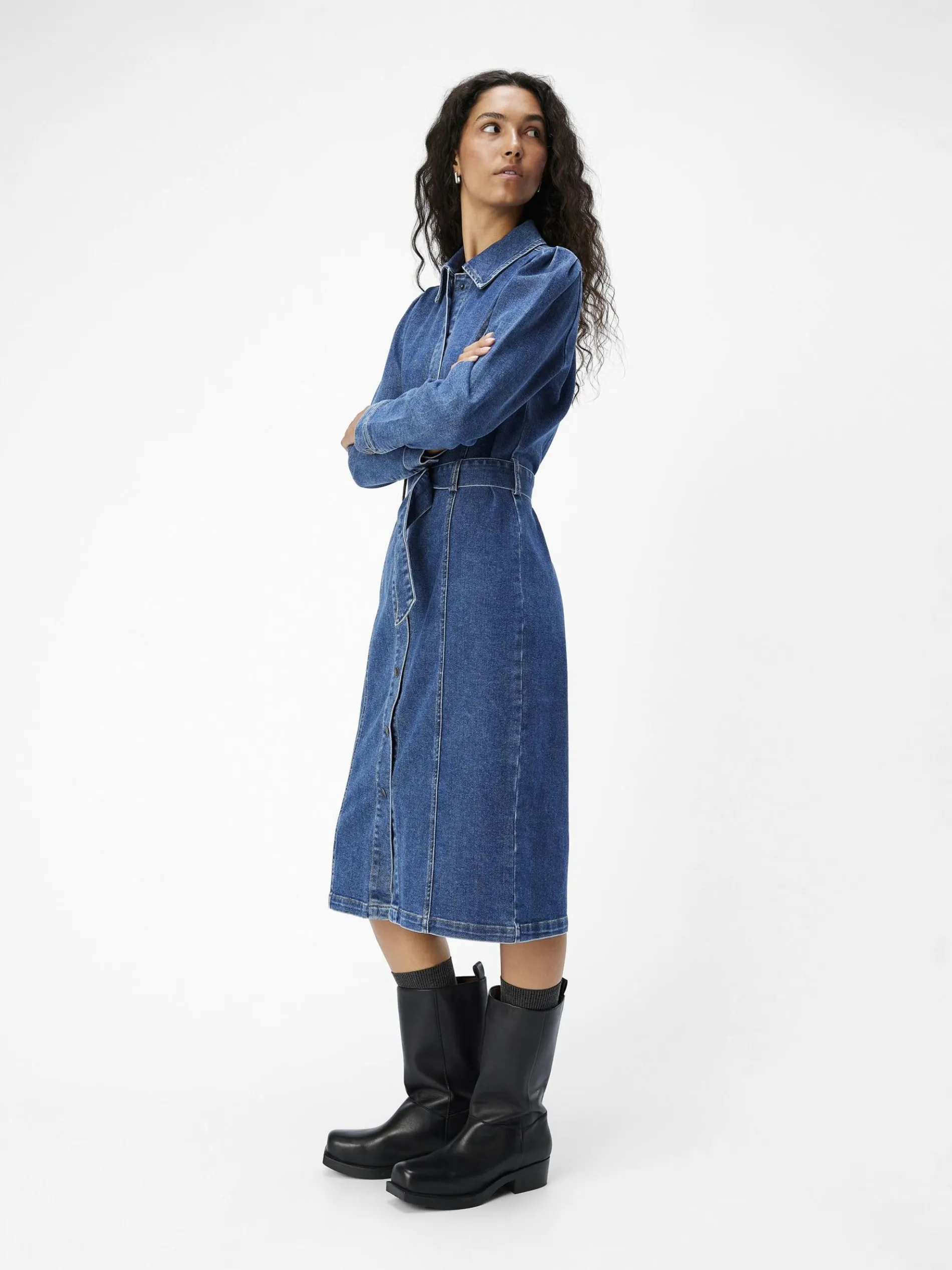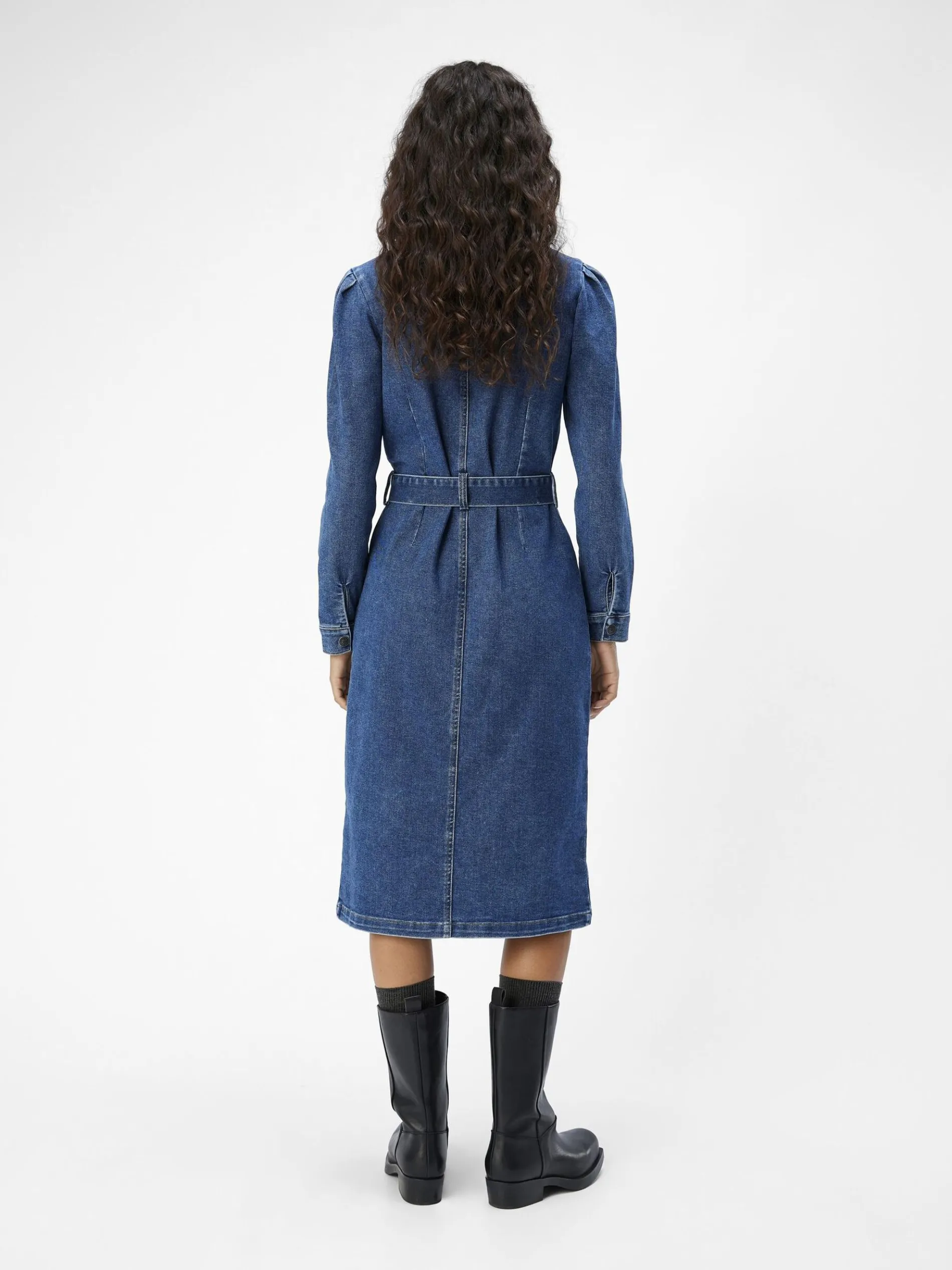 – Denim midi-jurk met lange mouwen- Gespreide kraag- Volledige knoopsluiting met drukknopen- Strikceintuur in de taille- Regular fit