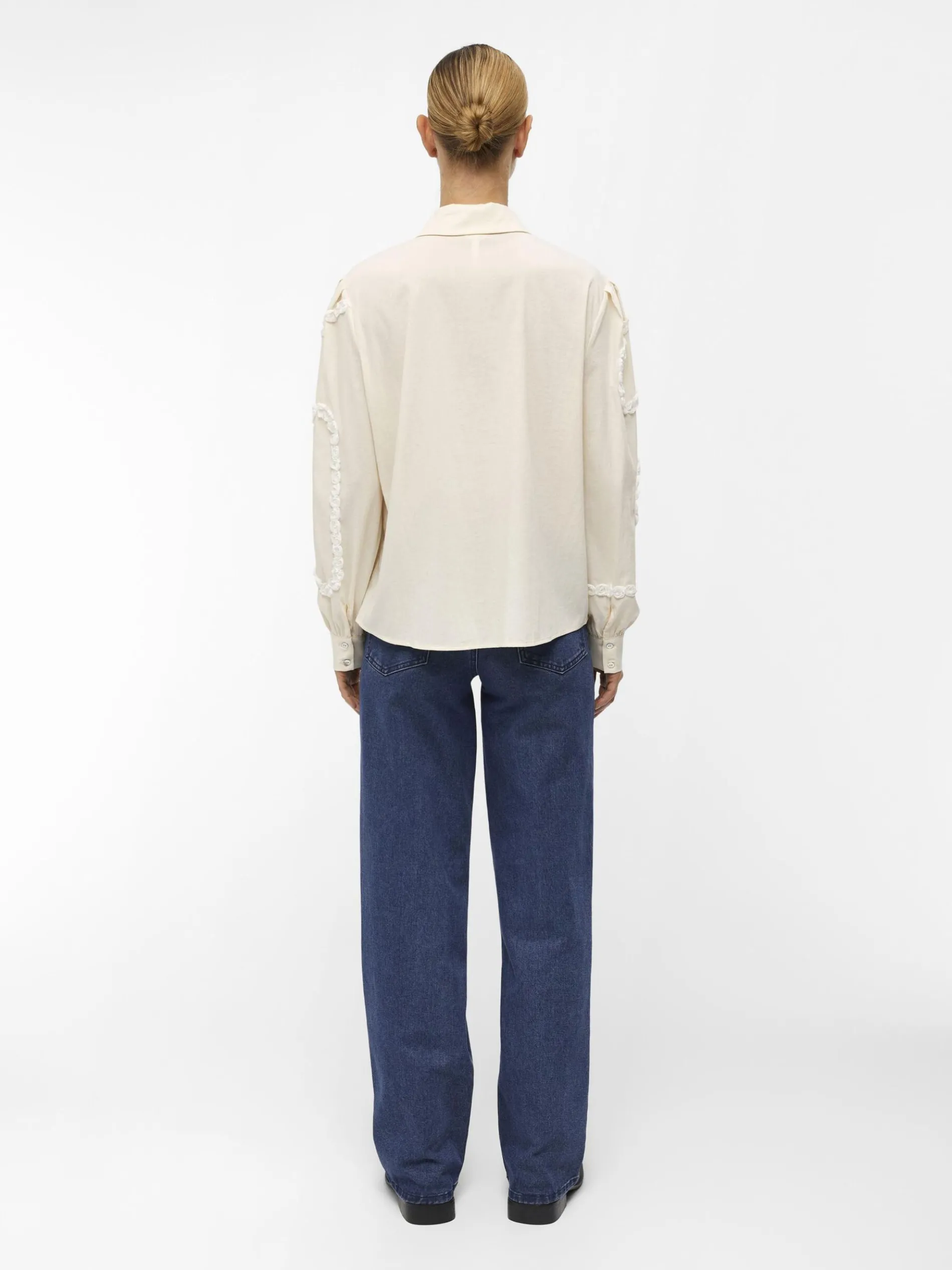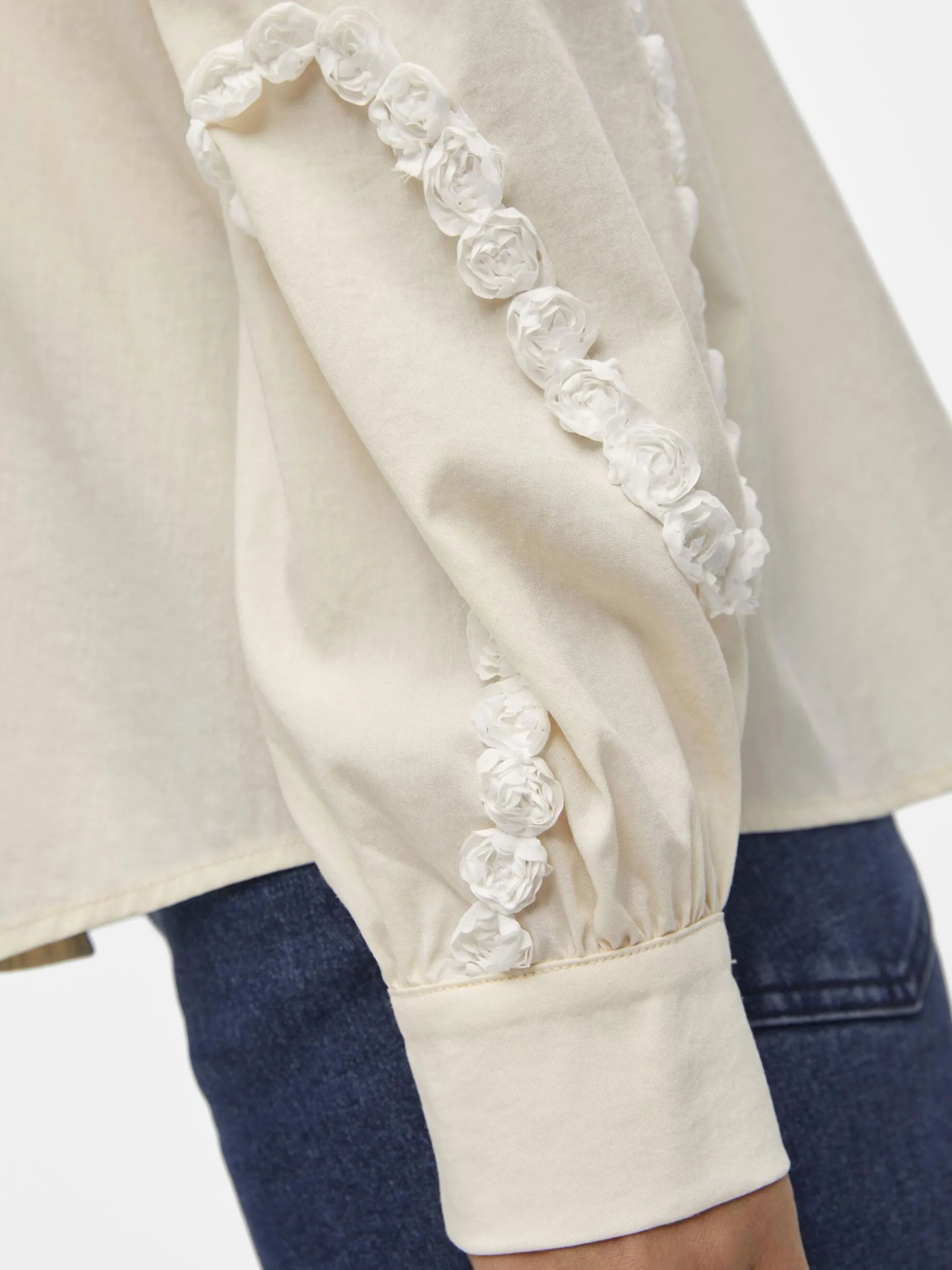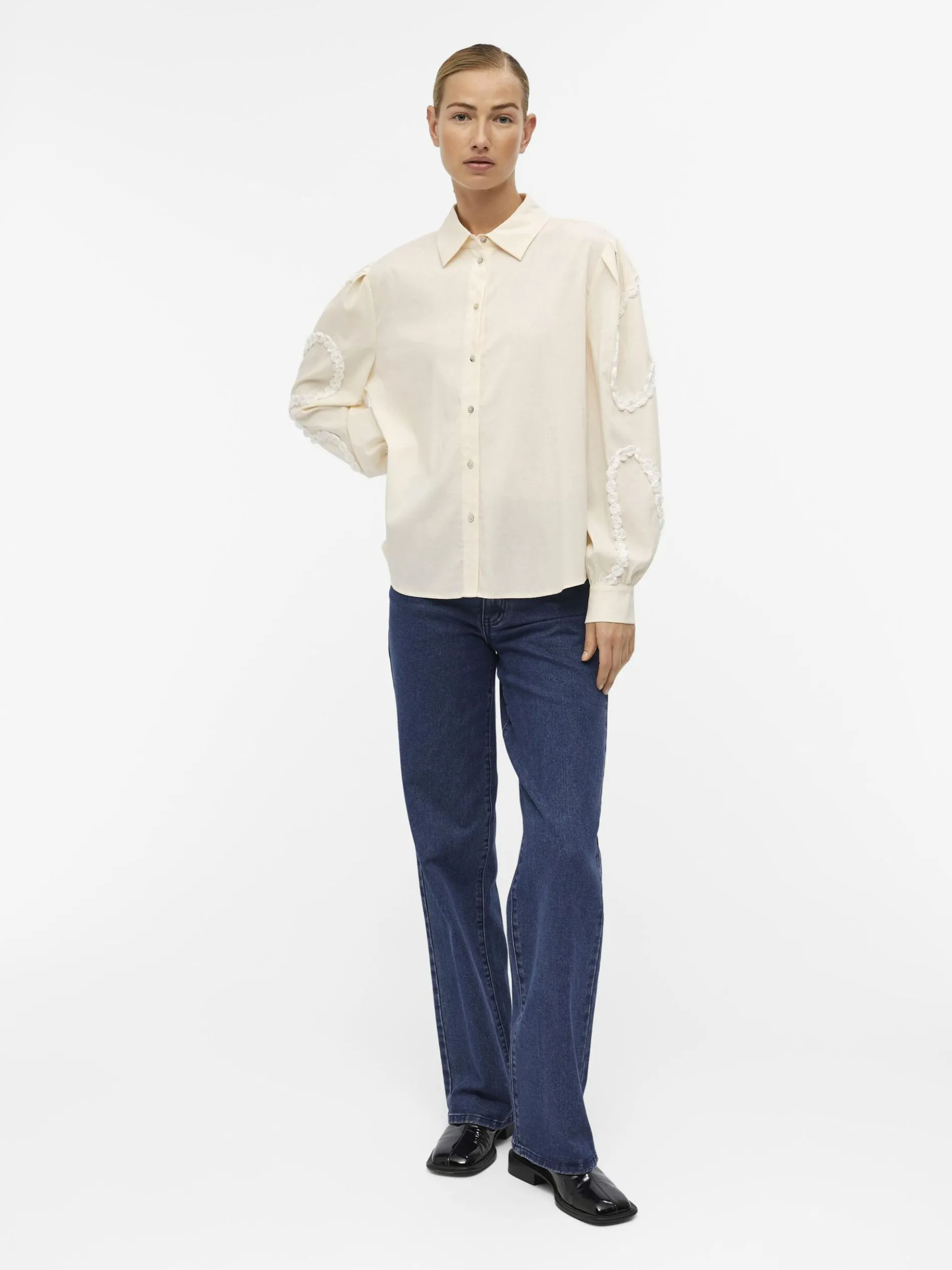 – Blouse met lange mouwen- Geborduurd detail aan de voorkant met volumineuze mouwen- Plooien op de schouders- Manchetten met knopen- Knoopsluiting aan de voorzijde- Regular fit