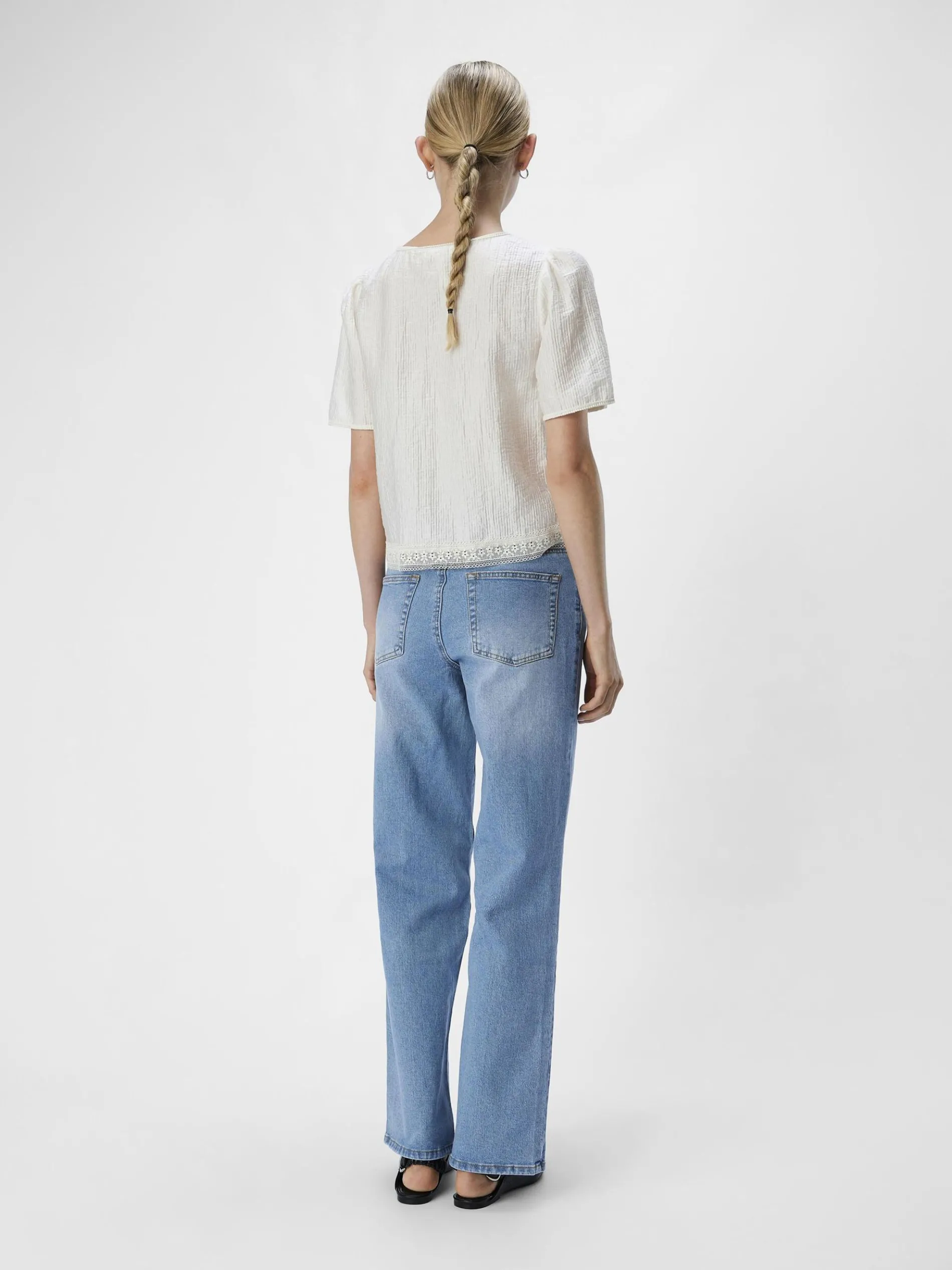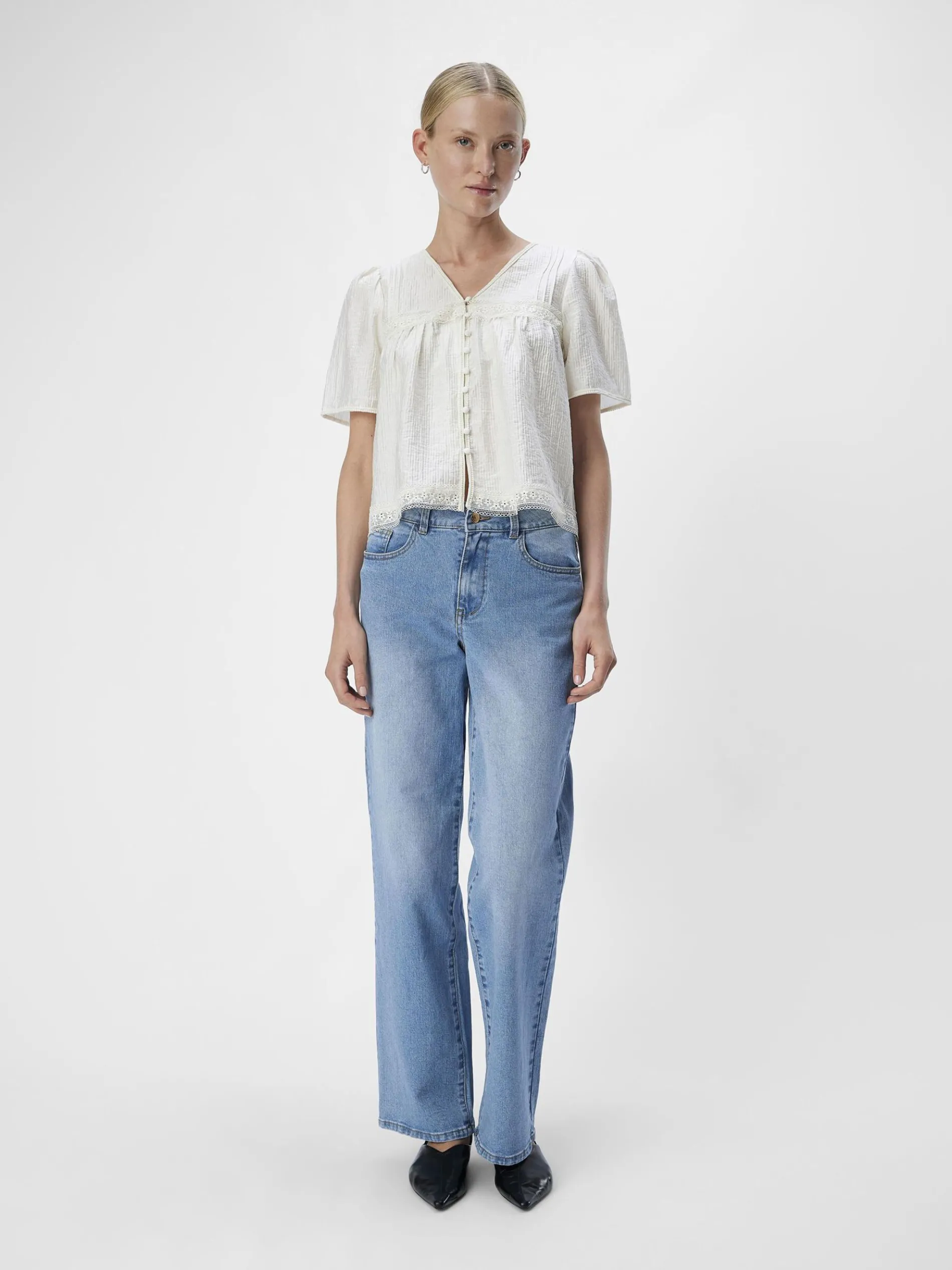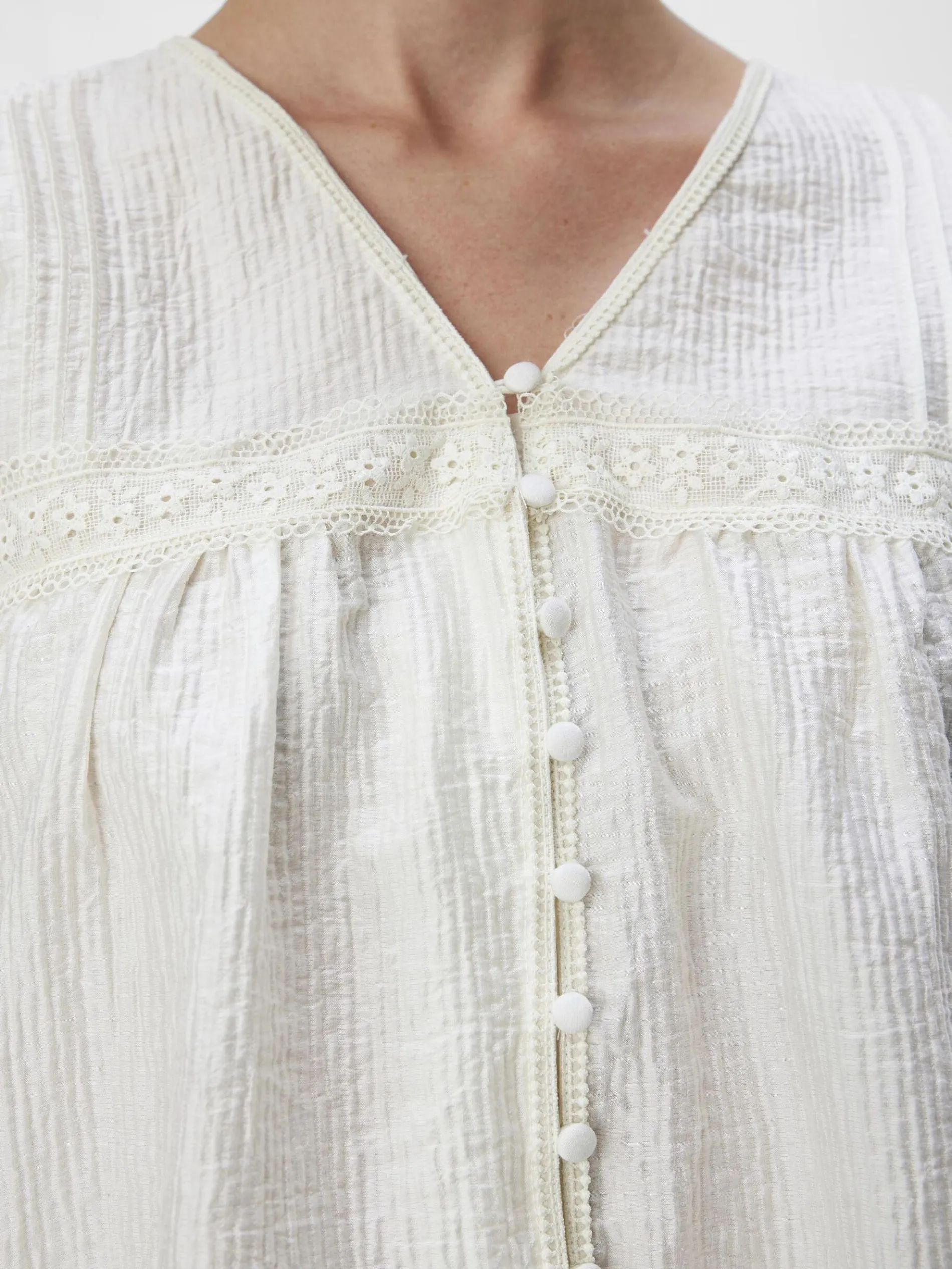 – Geborduurde top met korte mouwen- V-hals- Met stof bedekte knopen- Kanten detail- Plooien bij de schouders- Regular fit