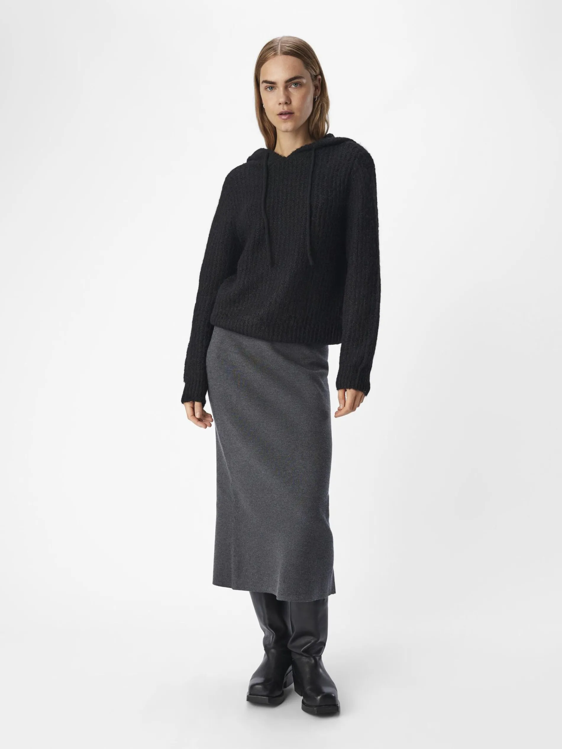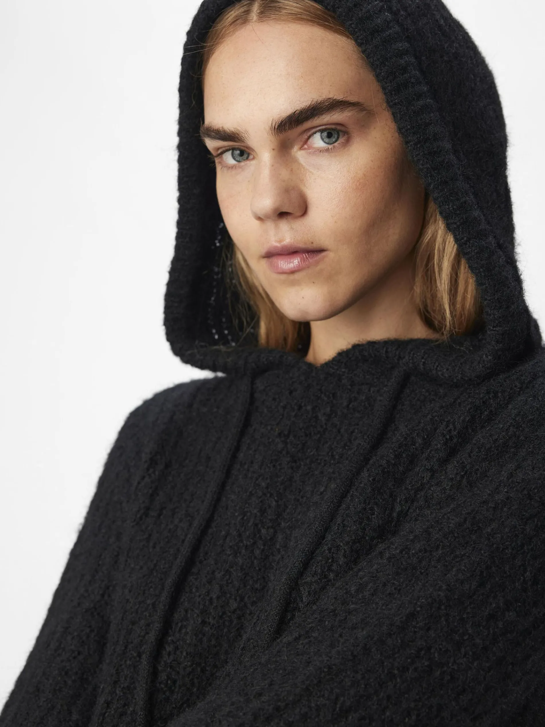 – Geribde gebreide hoodie- Grote capuchon met koordjes- Lage schouders- Lange volumineuze mouwen- Aansluitende manchetten- Regular fit
