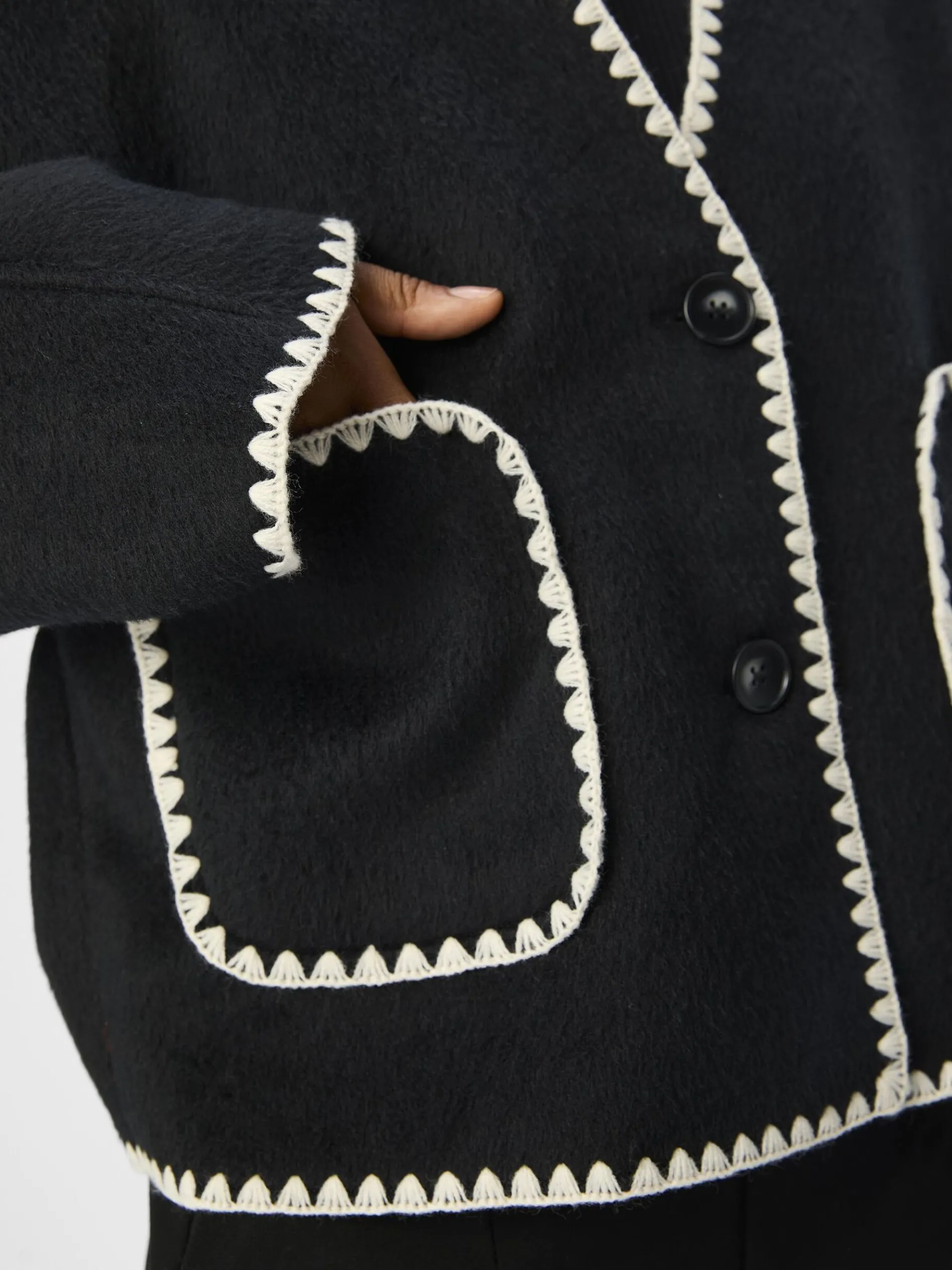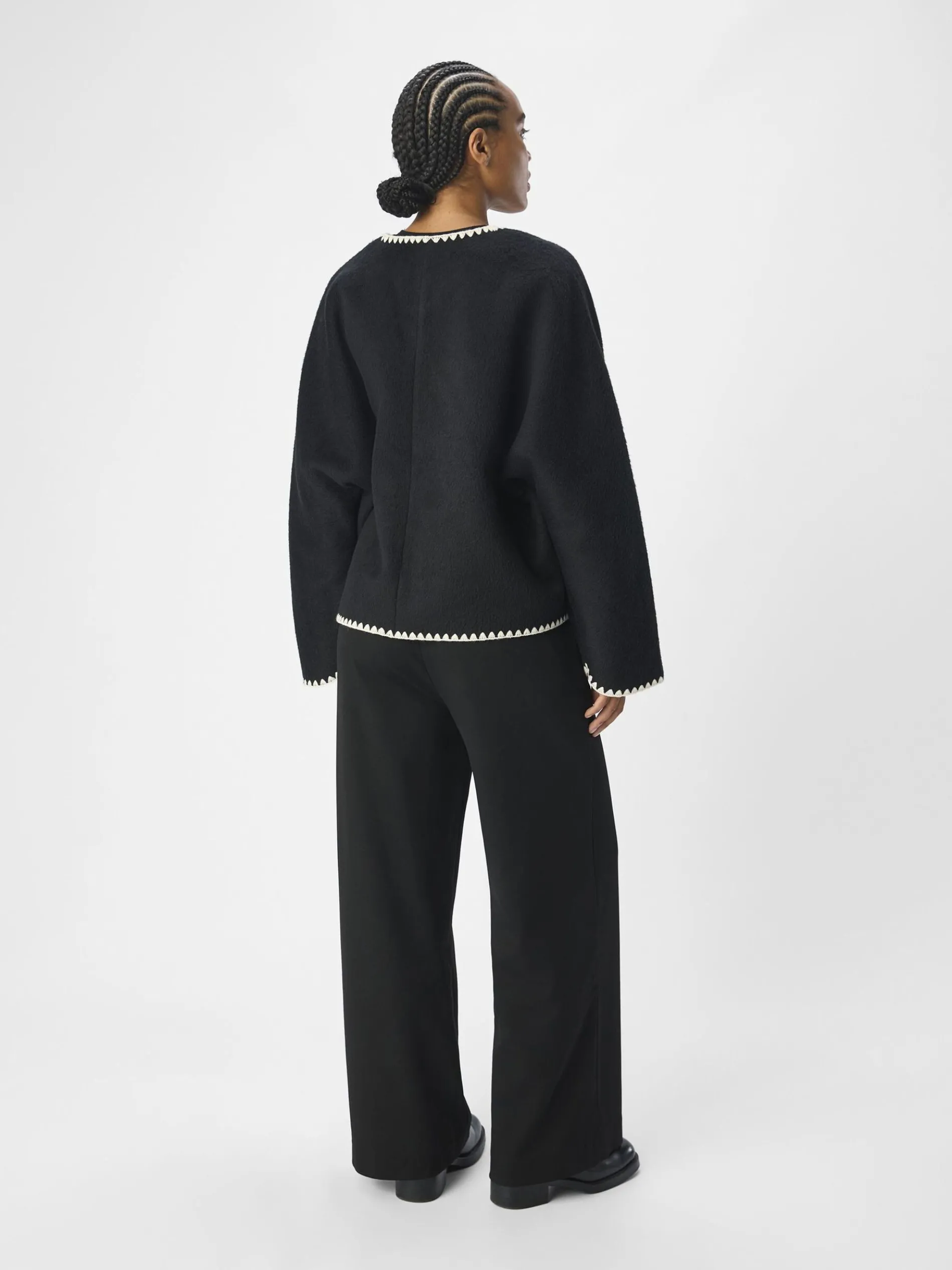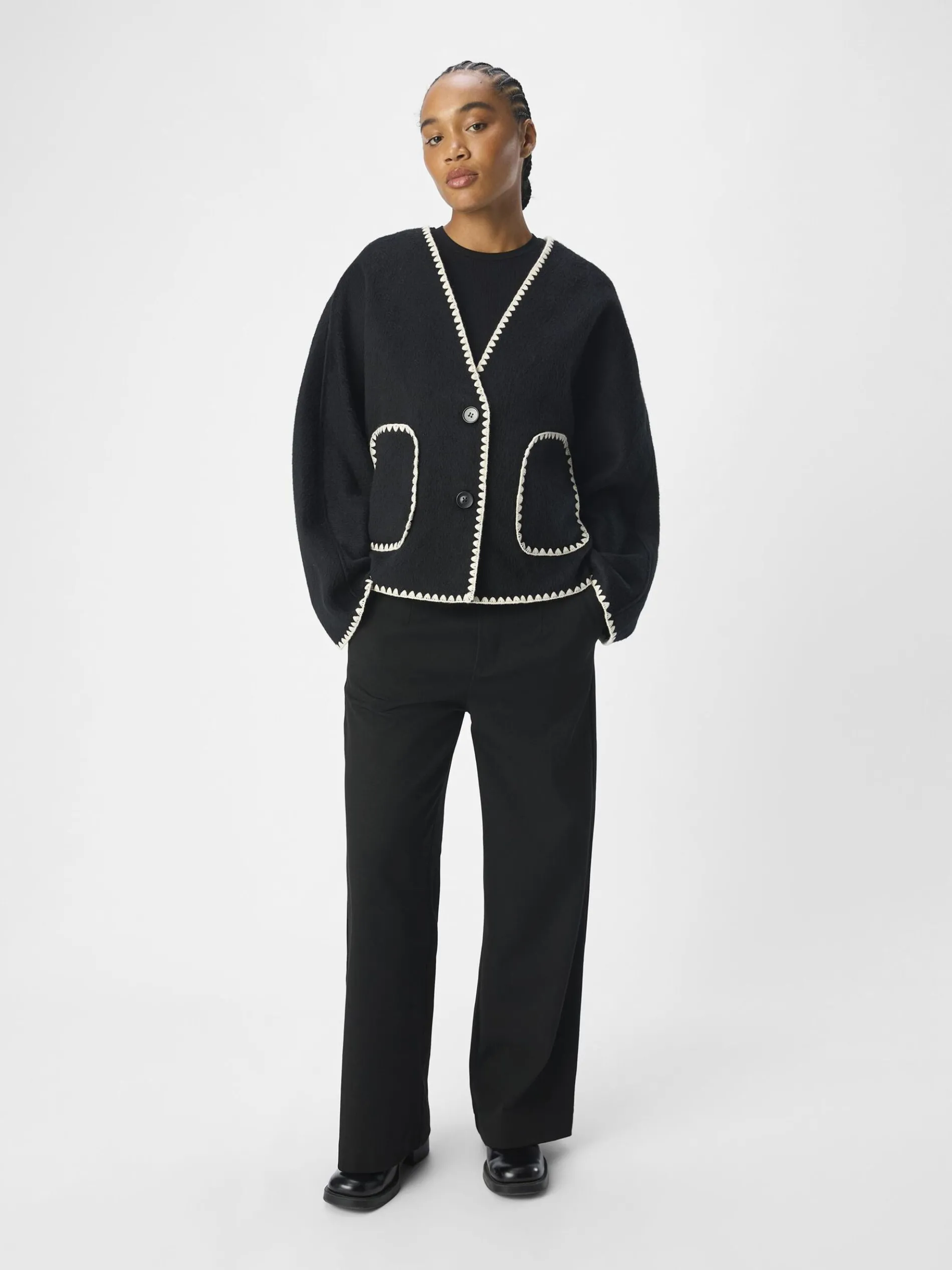 – Kort gebreid jasje van wolmix- V-hals- Lage schouders- Lange mouwen- Ruches op de randen- Twee opgestikte voorzakken- Knoopsluiting aan de voorkant- Regular fit