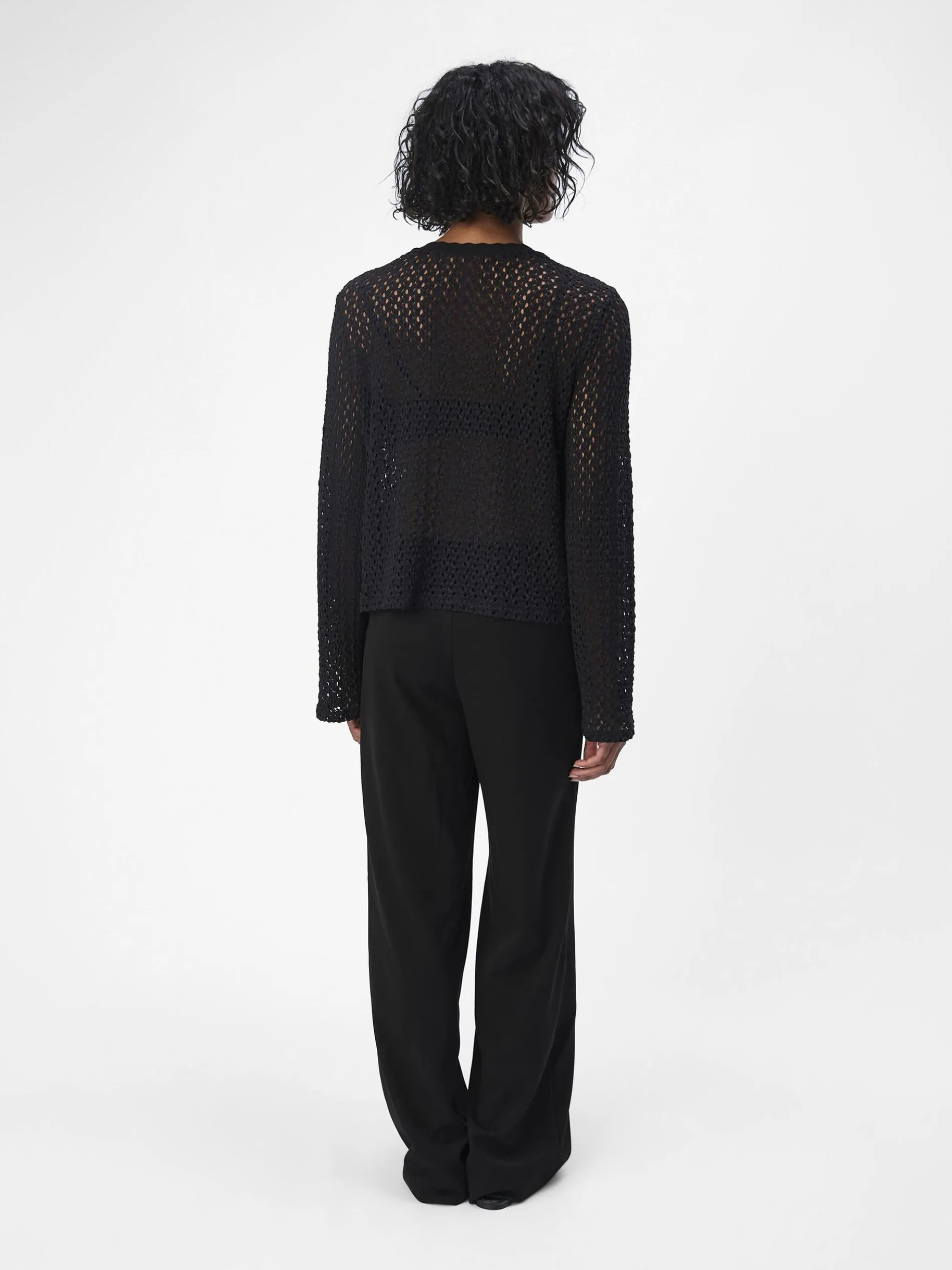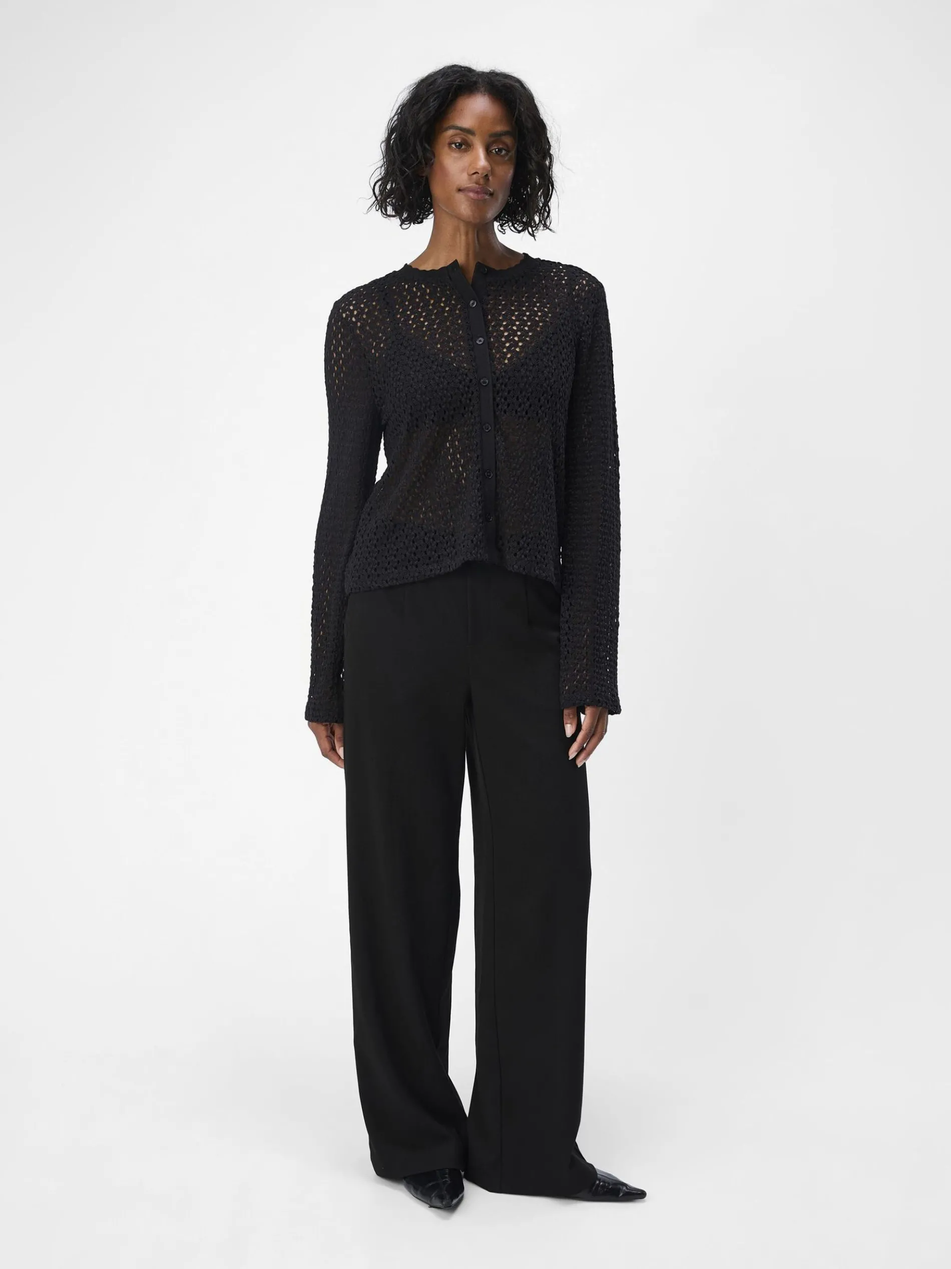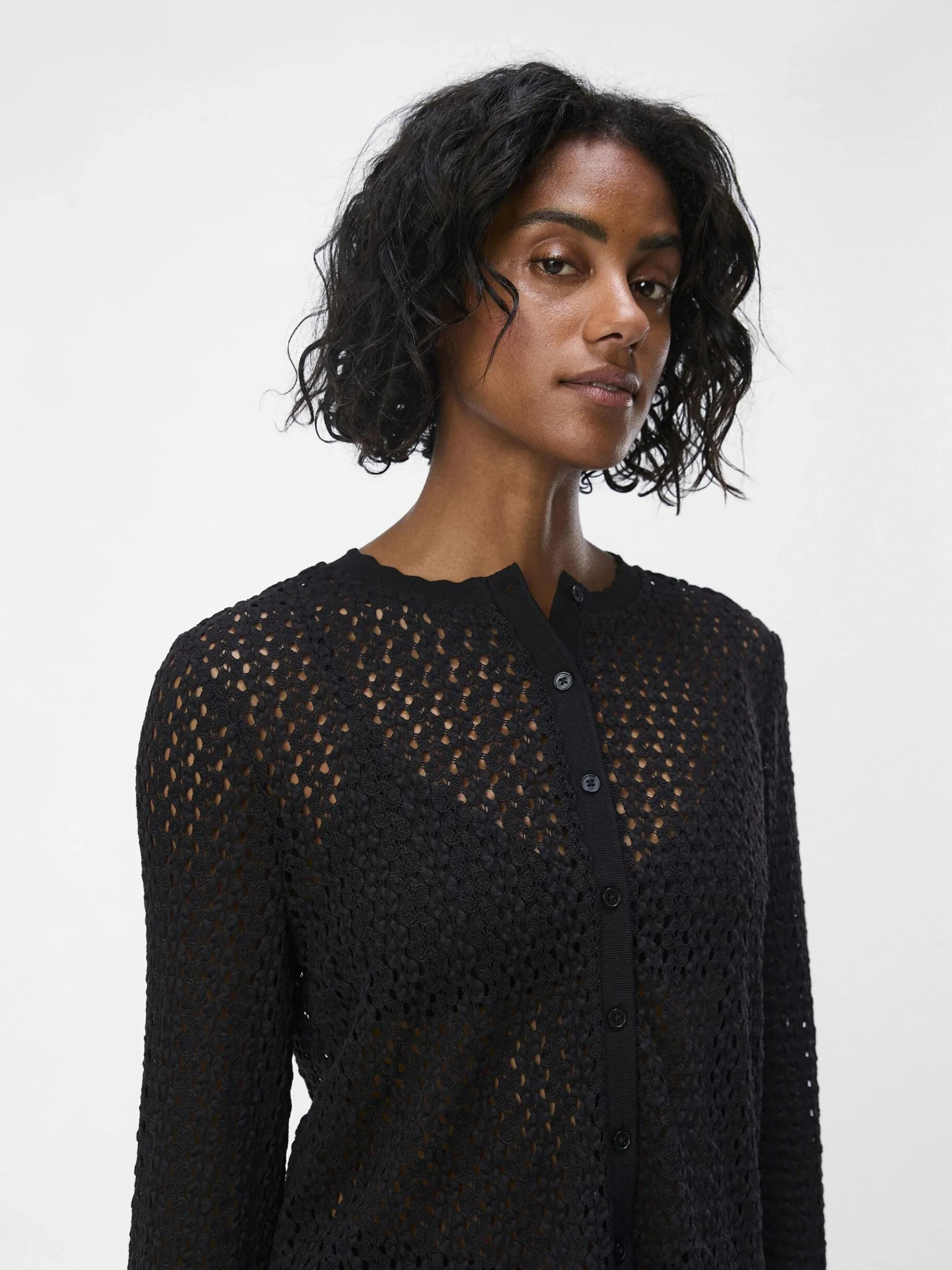 – Gebreid vest met lange mouwen- Ronde hals met ruches- Knoopsluiting aan de voorkant- Opengestikt ontwerp- Regular fit