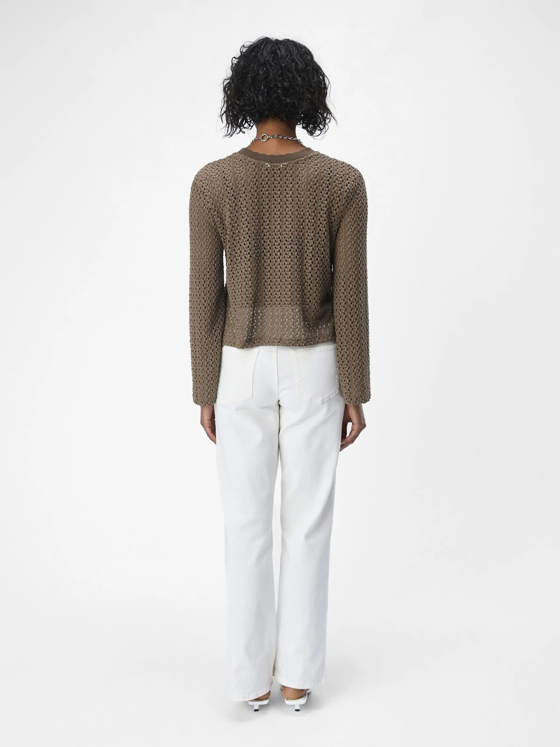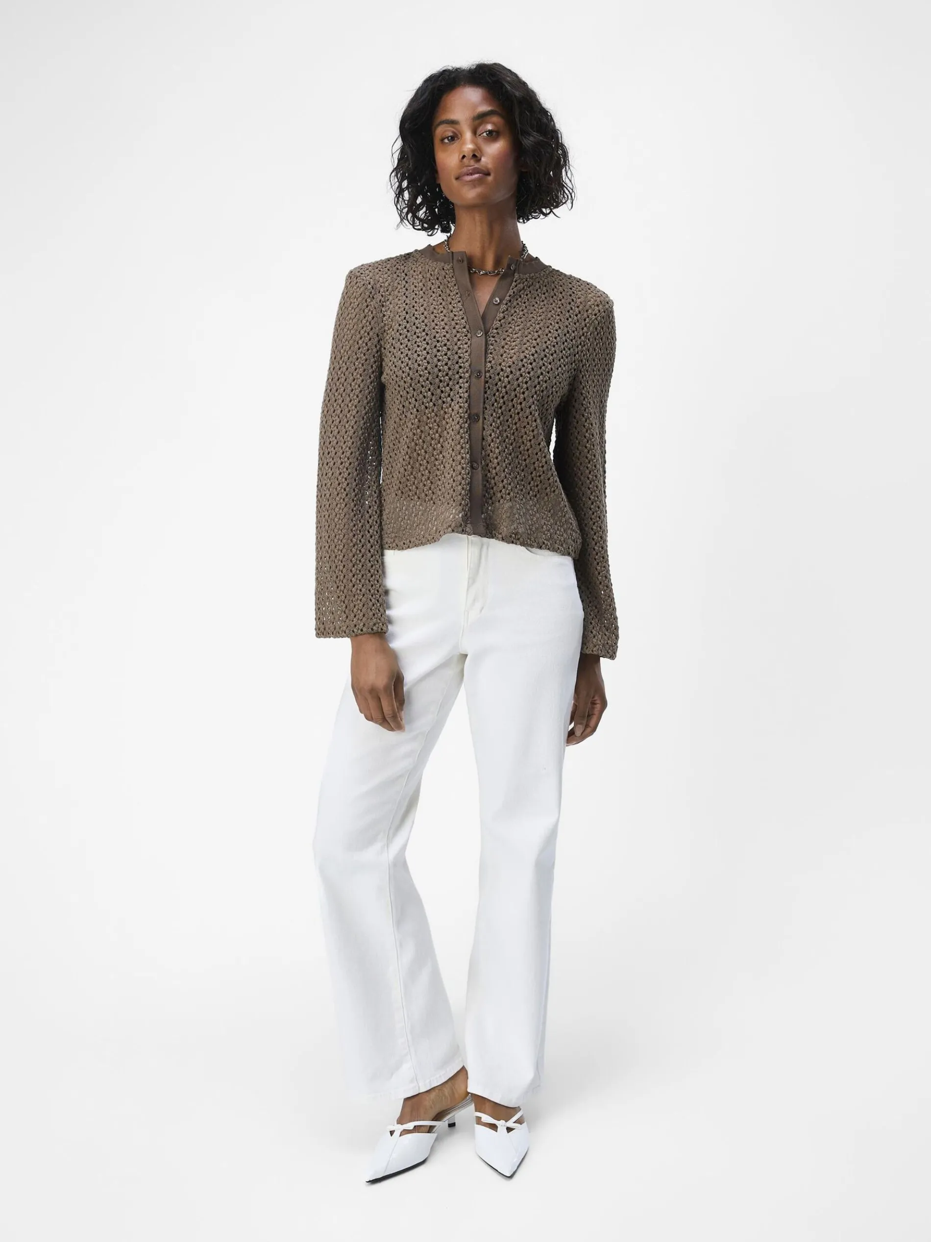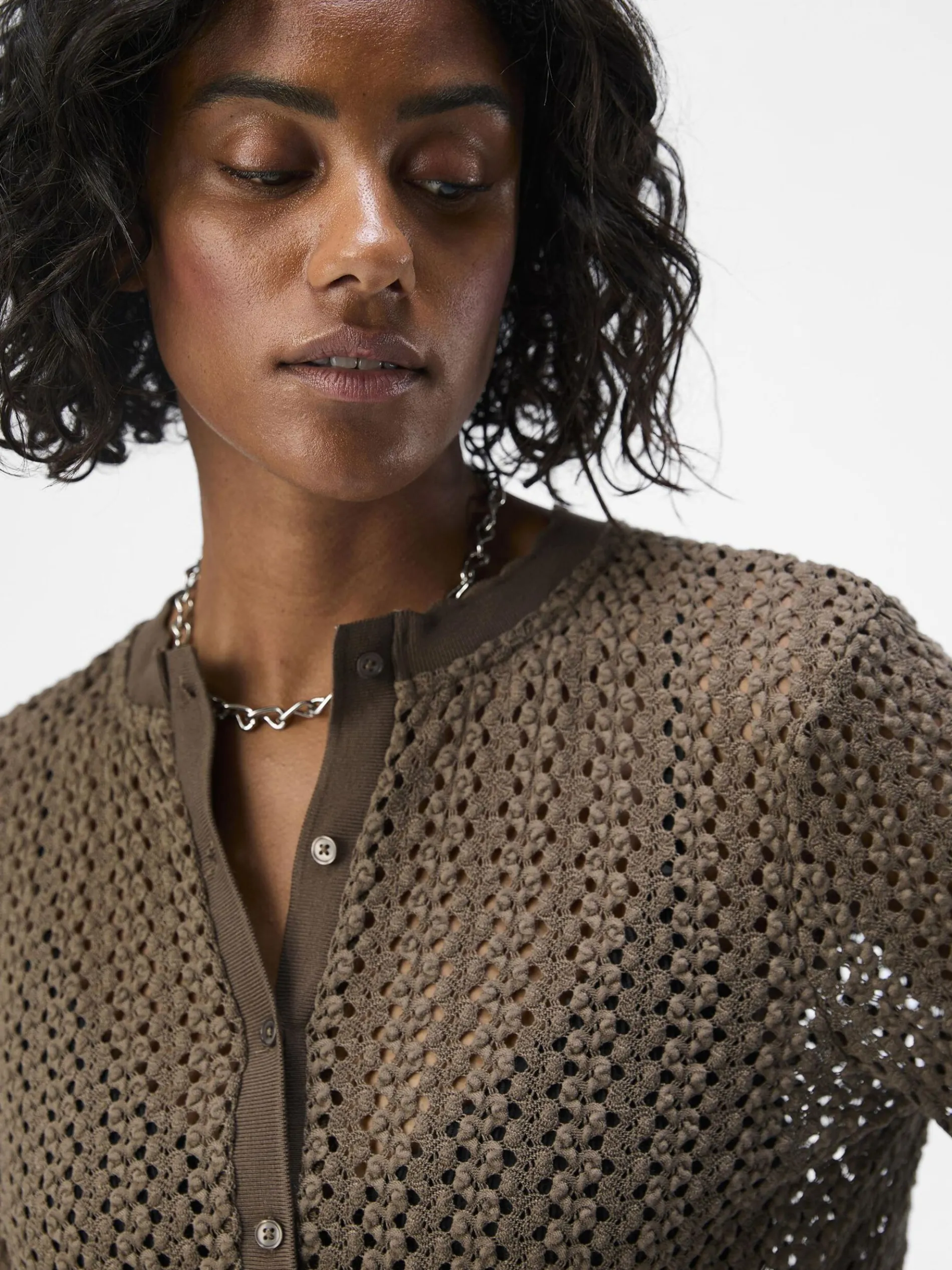– Gebreid vest met lange mouwen- Ronde hals met ruches- Knoopsluiting aan de voorkant- Opengestikt ontwerp- Regular fit