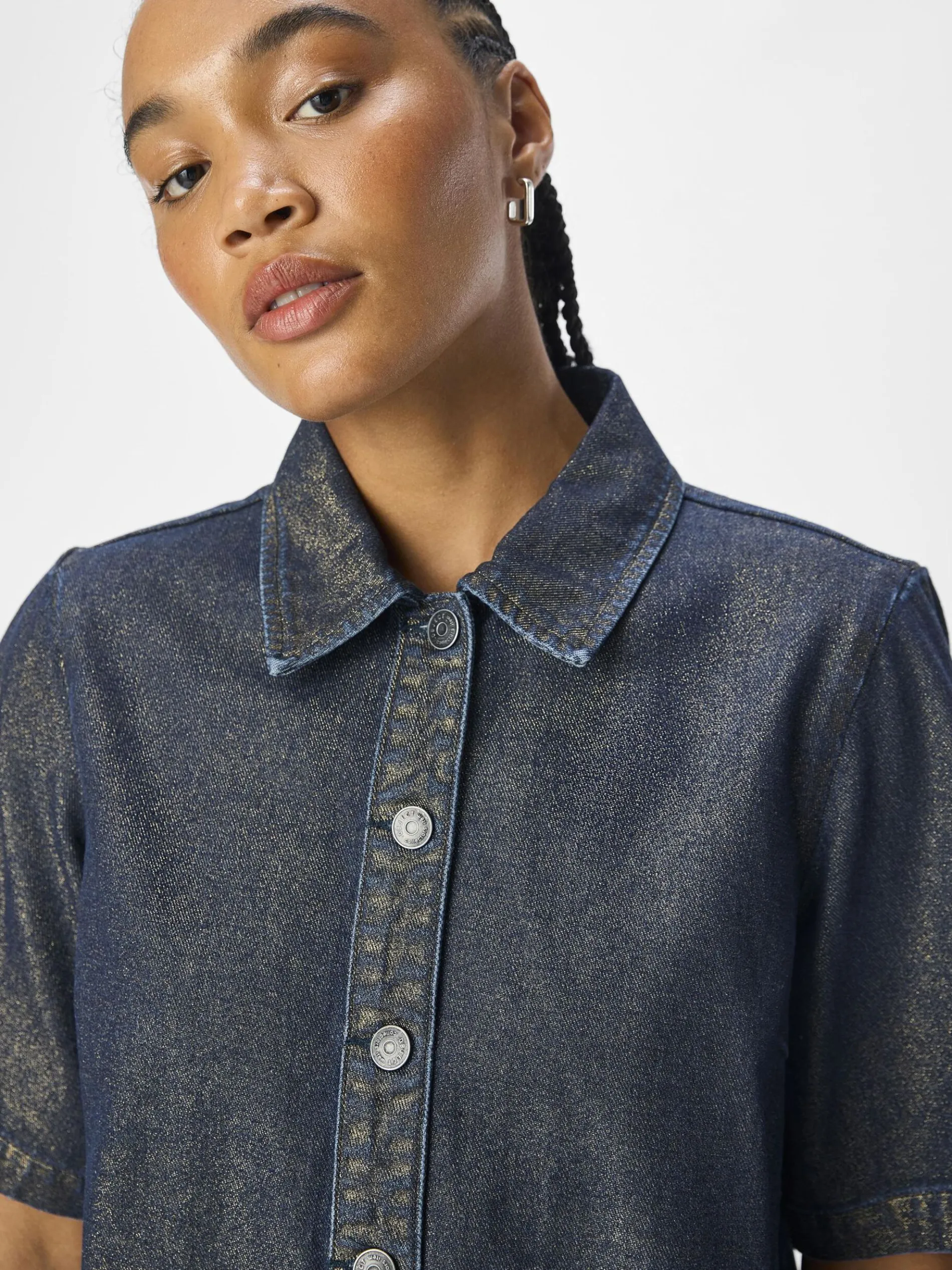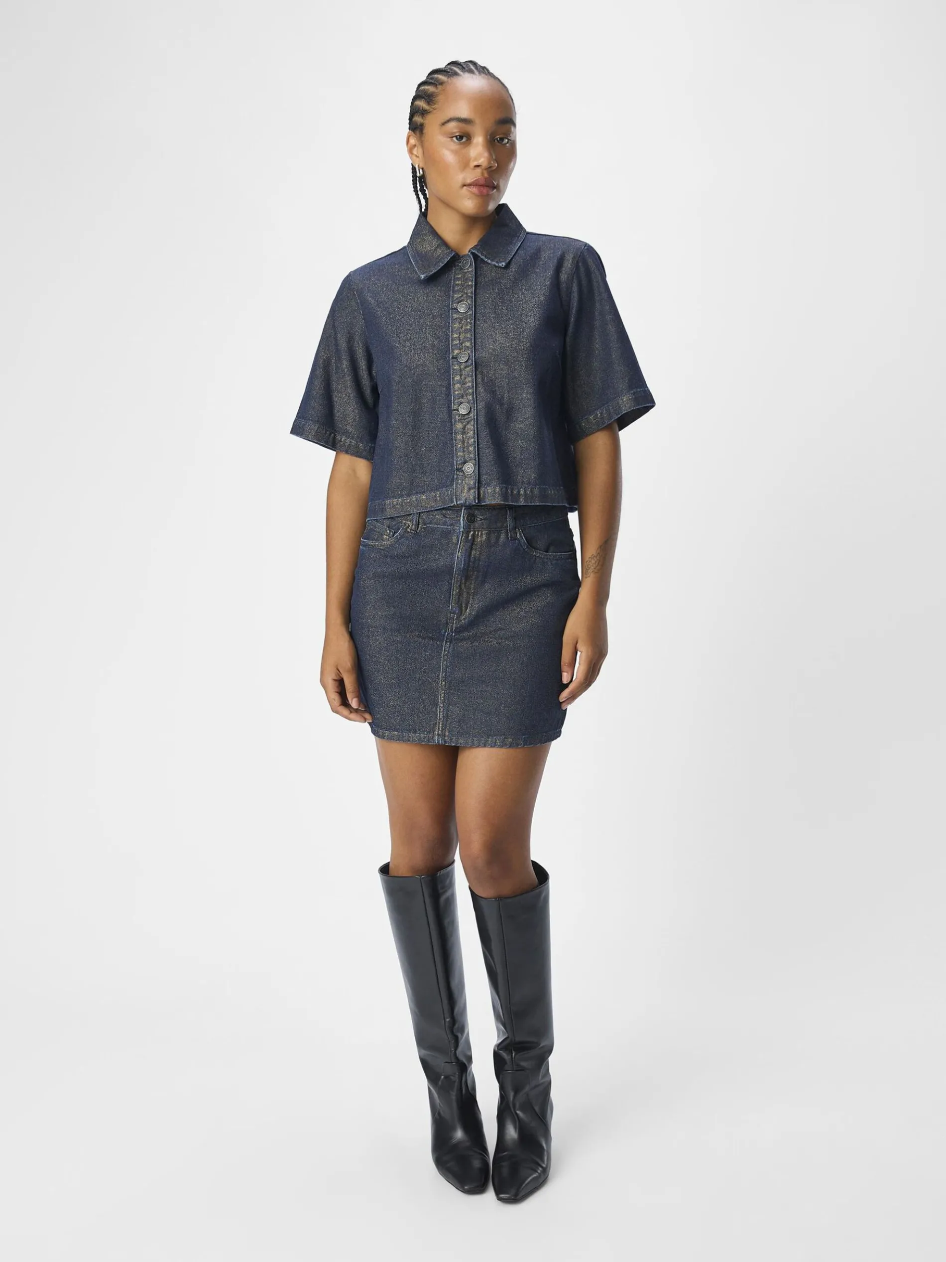– Denim blouse met glanzende coating- Normale kraag- Korte mouwen- Knoopsluiting aan de voorkant- Gecropte boxy fit
