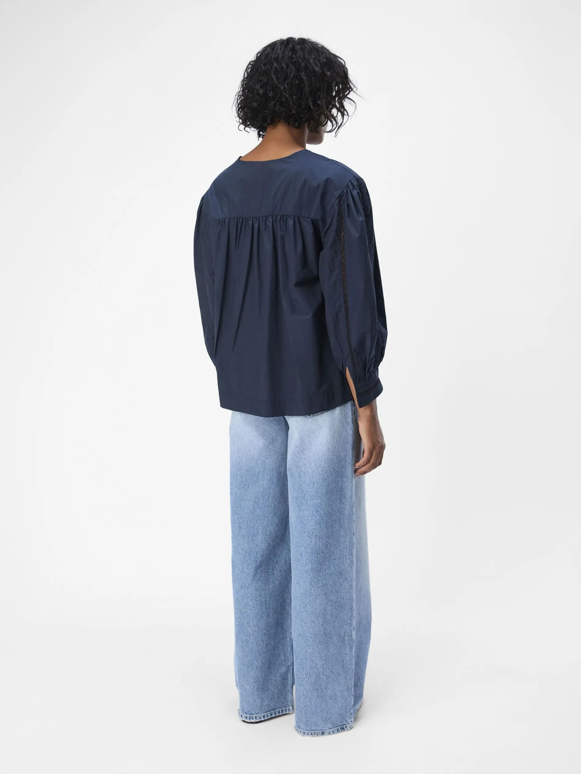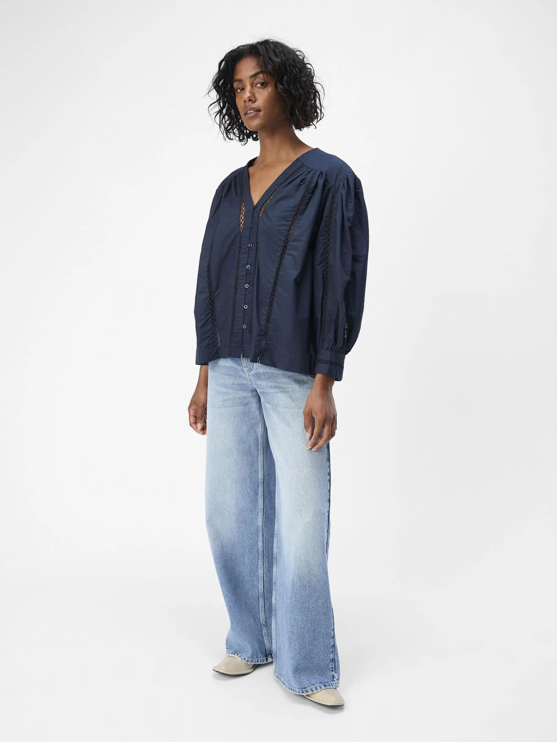 – Blouse met V-hals en details- Lange volumineuze mouwen- All-over open geweven design- Geplooid effect op het voorpand- Manchetten met knopen- Knoopsluiting aan de voorkant- Zonder voering- Regular fit