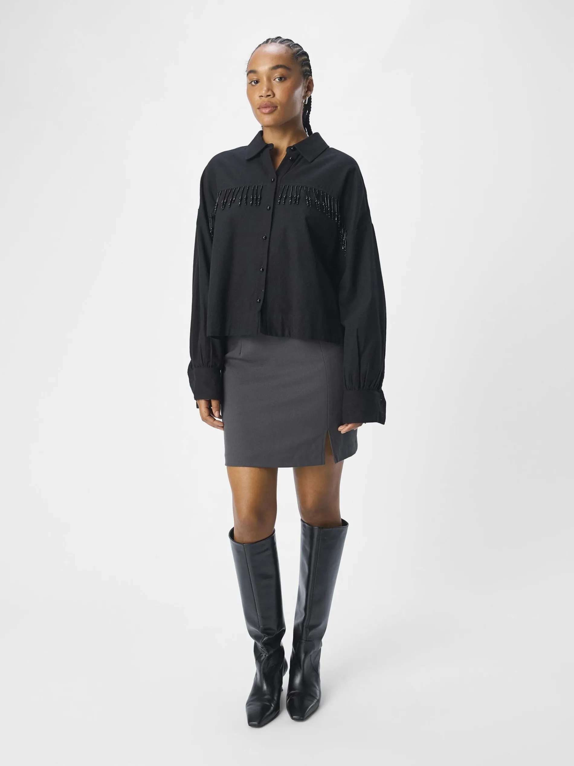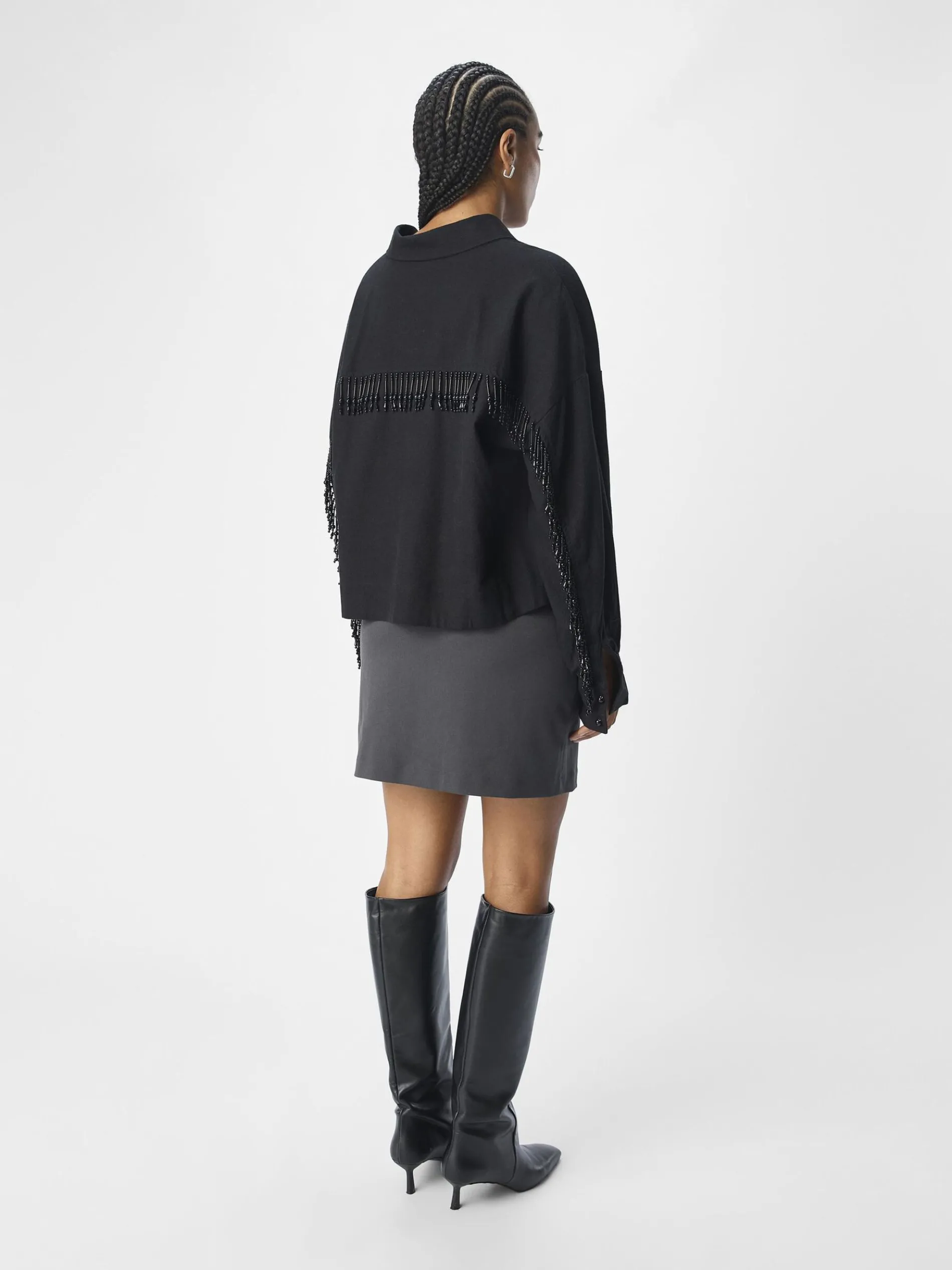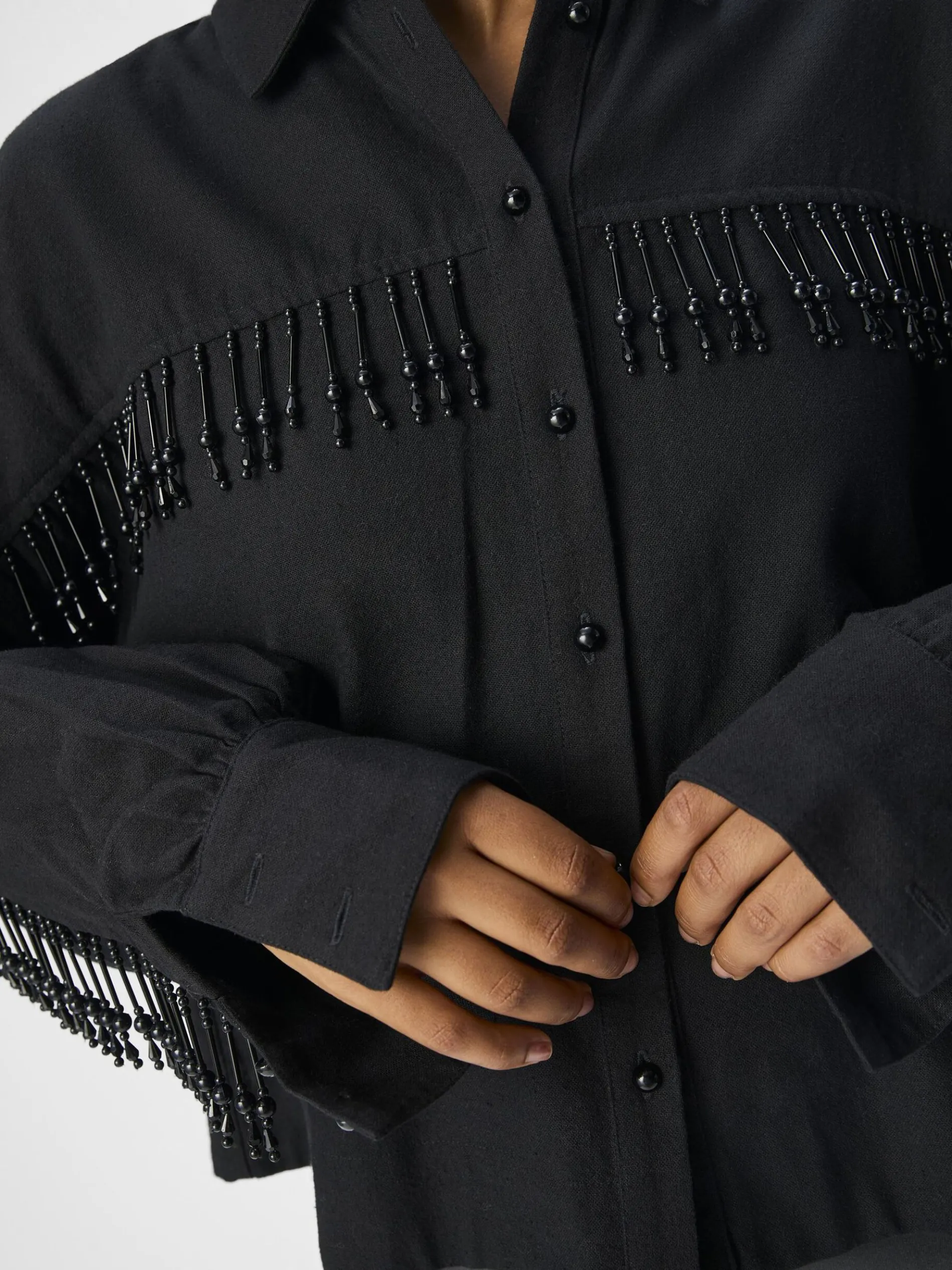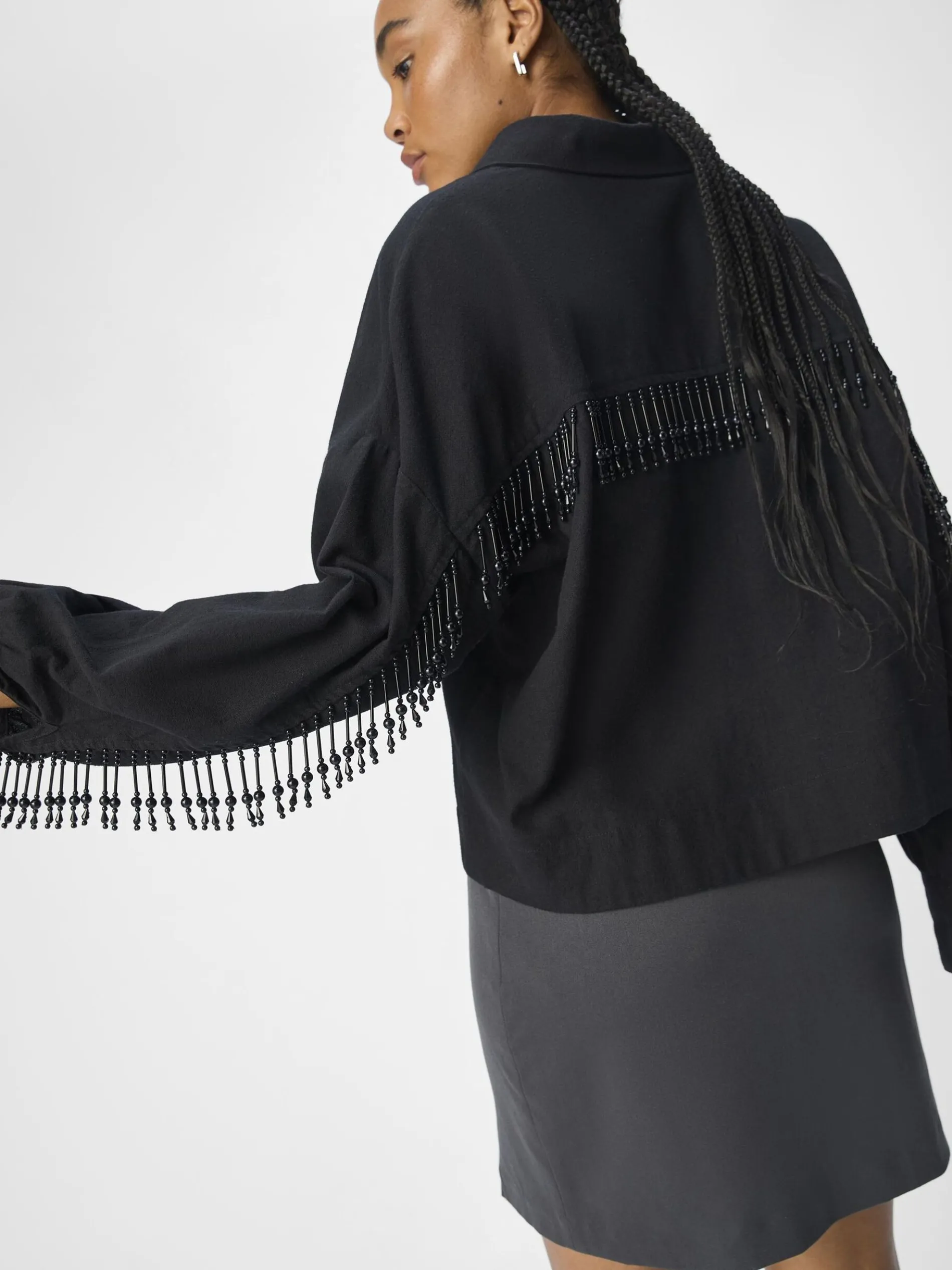 – Blouse met franjes en kralen- Normale kraag- Lange mouwen en manchetten met knopen – Knoopsluiting aan de voorkant- Loose fit