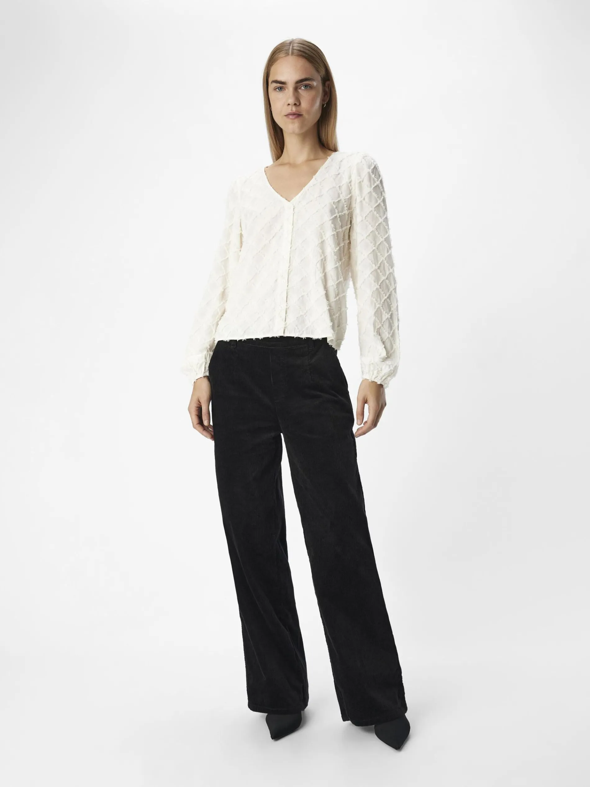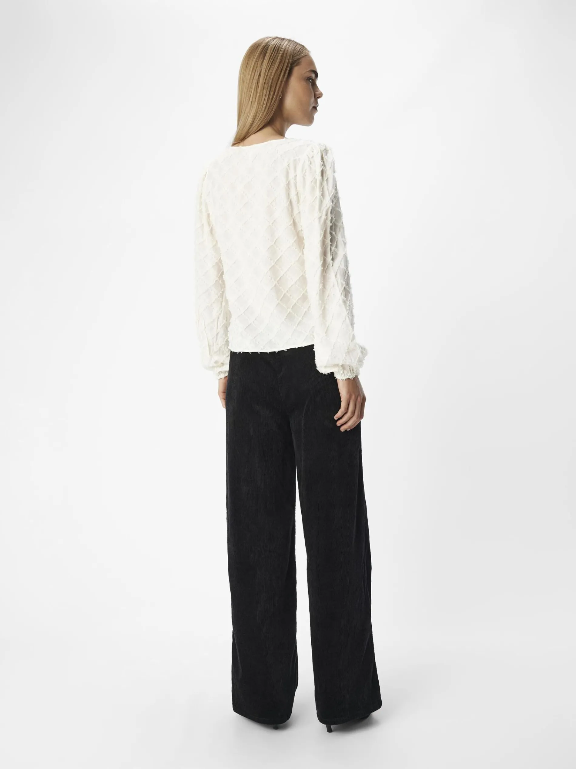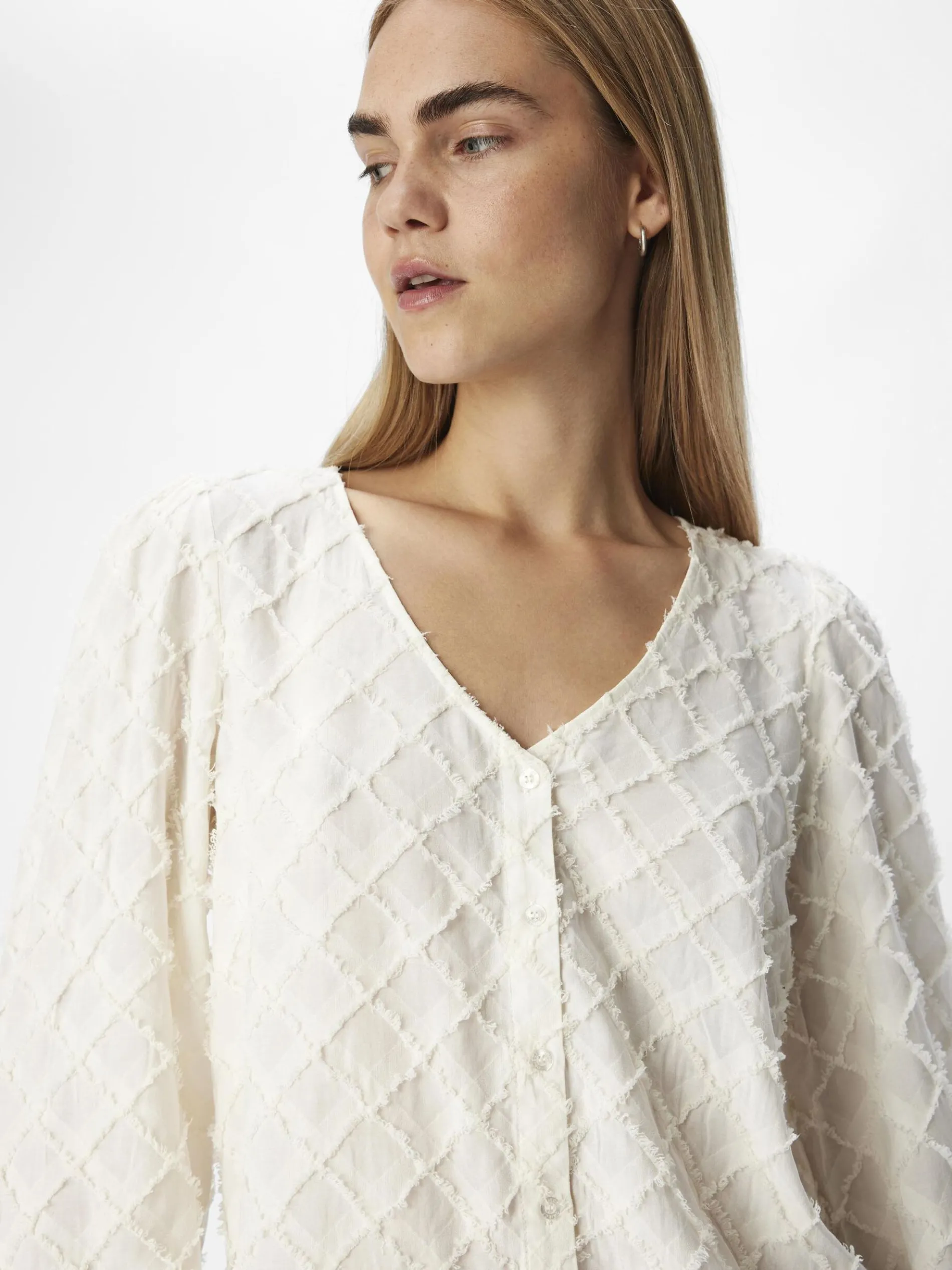 – Top met rasterdesign- V-hals- Lange volumineuze mouwen- Manchetten met elastiek- Regular fit- Model draagt maat 36