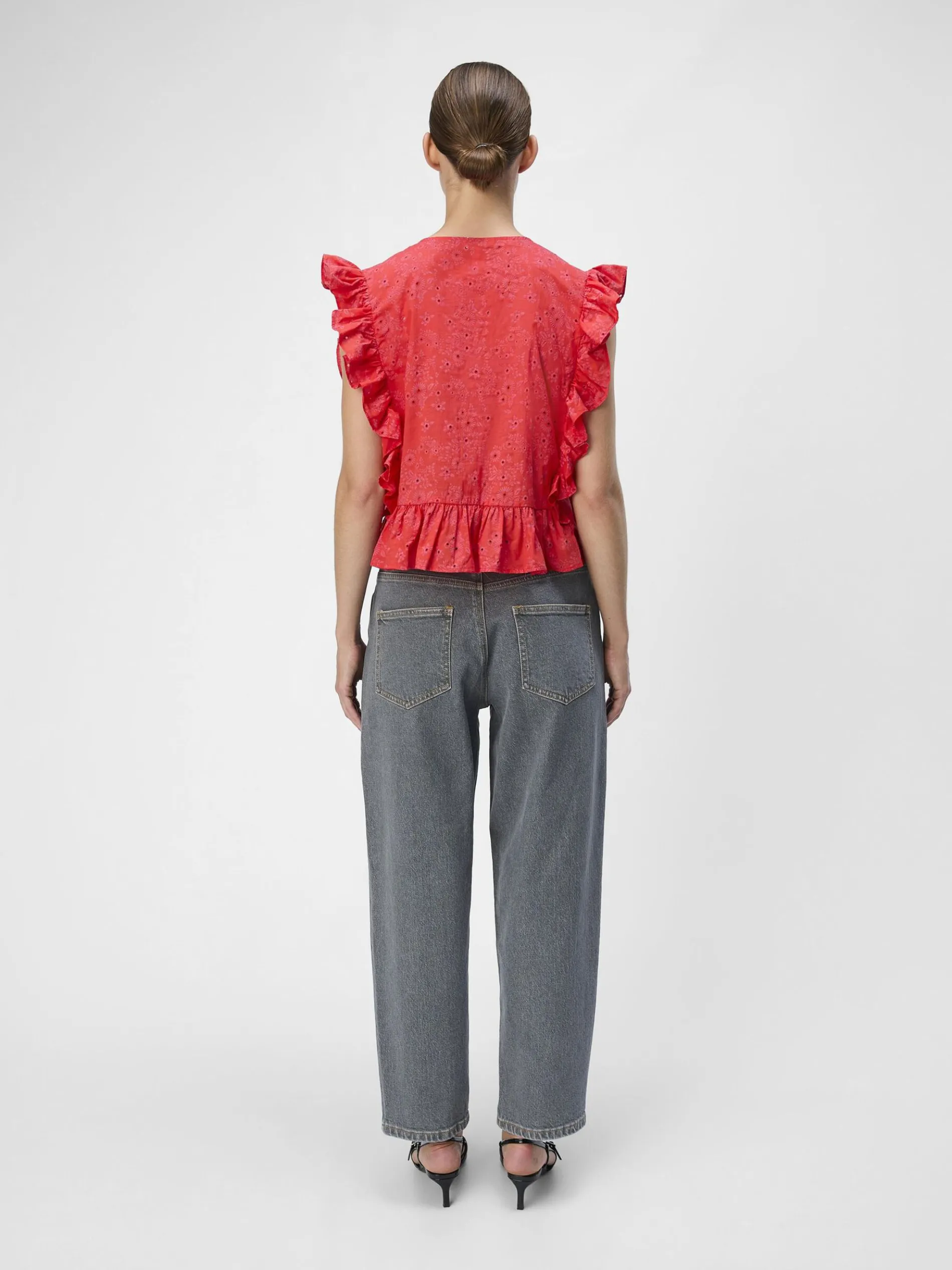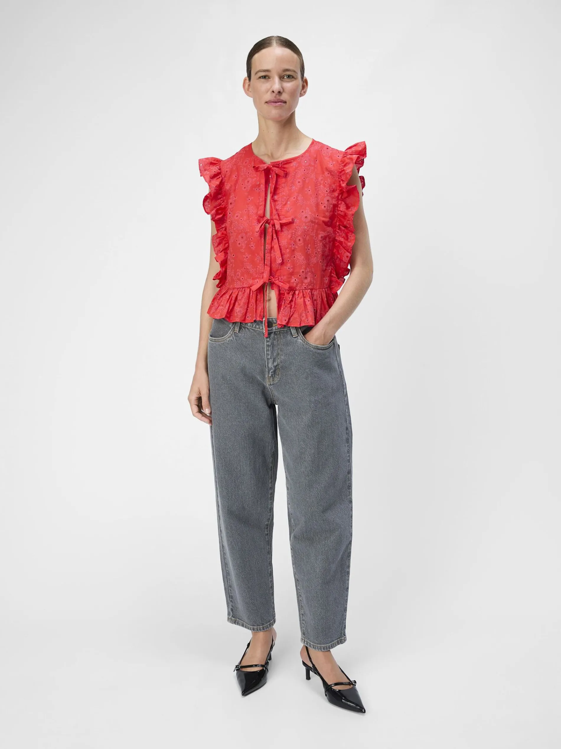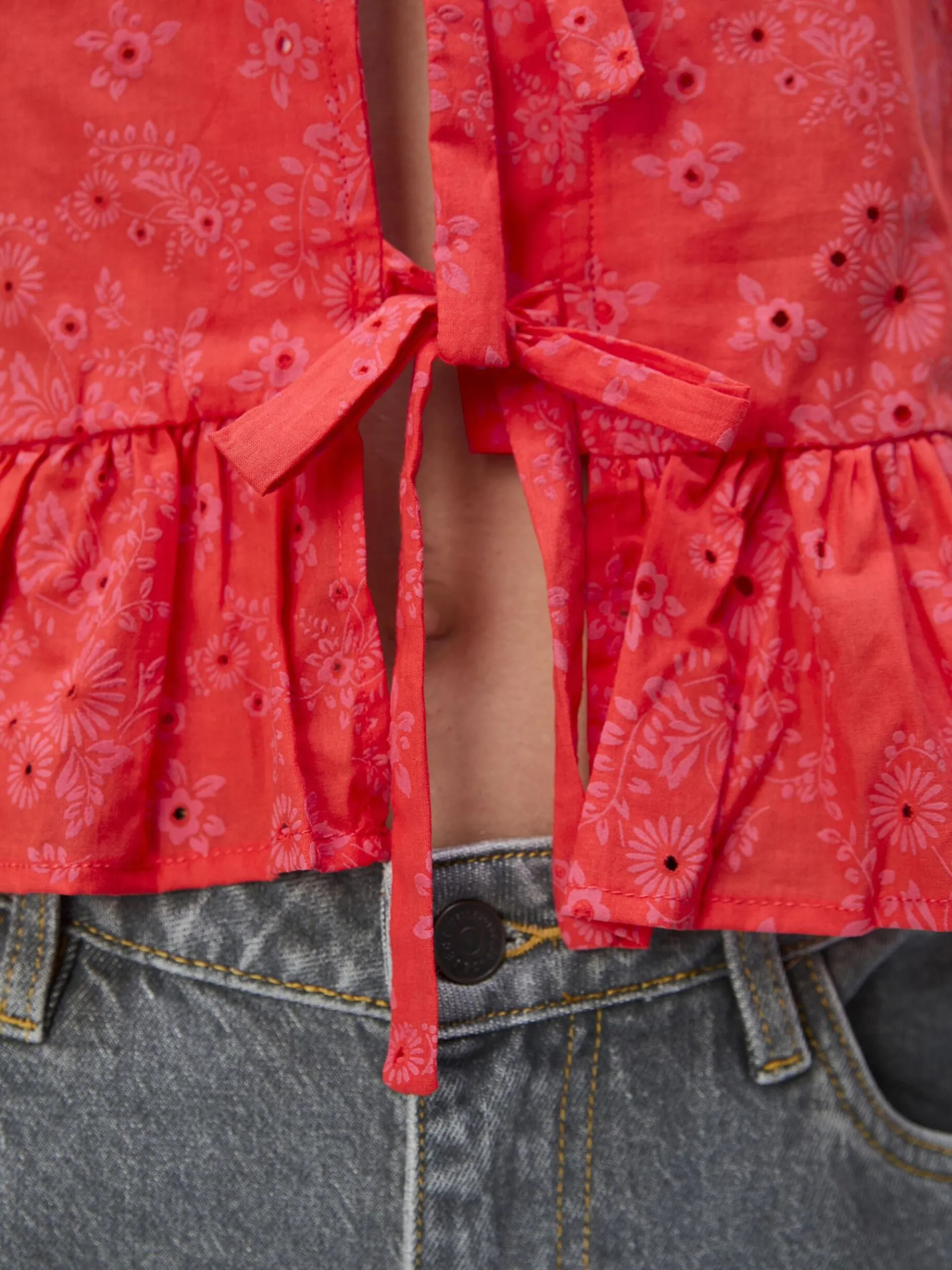 – Katoenen peplum top met ruches- All-over broderie anglaise details- Striksluiting aan de voorkant- Mouwloos- Ronde hals- Loose fit