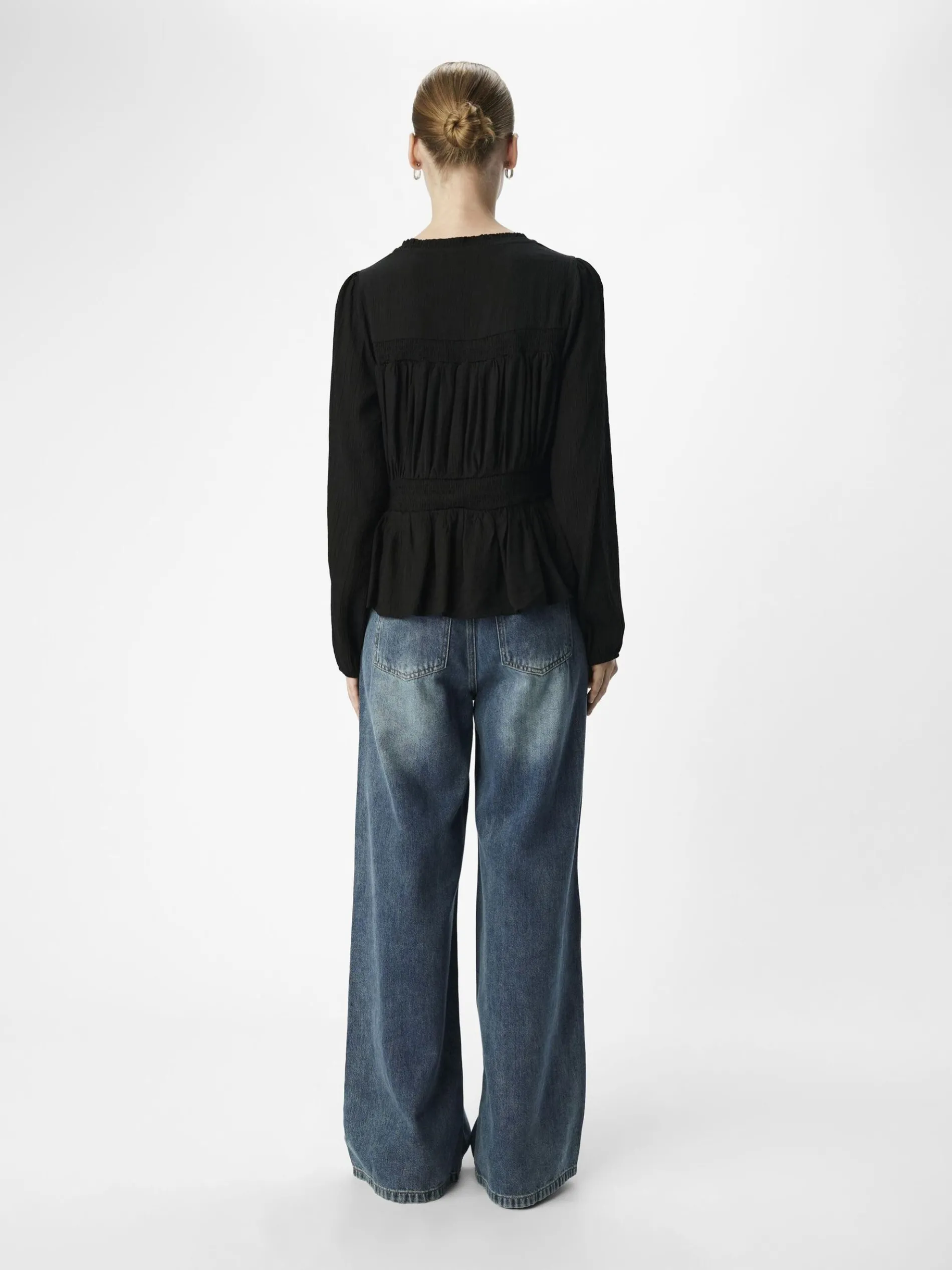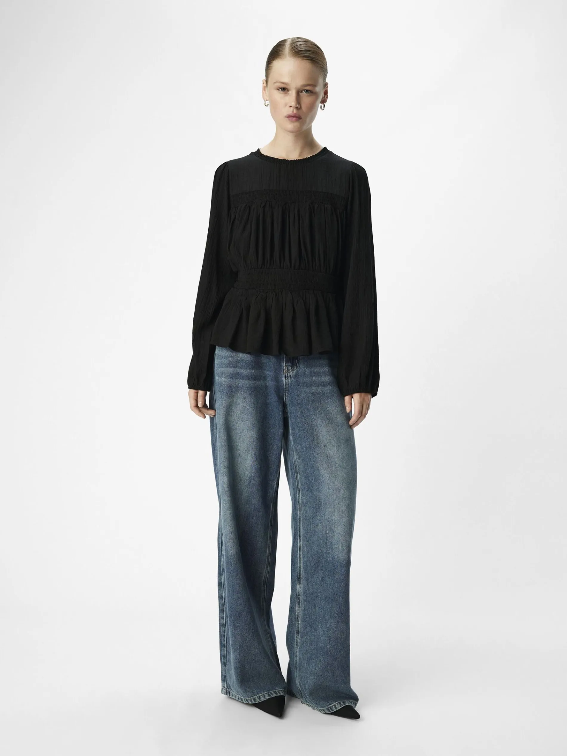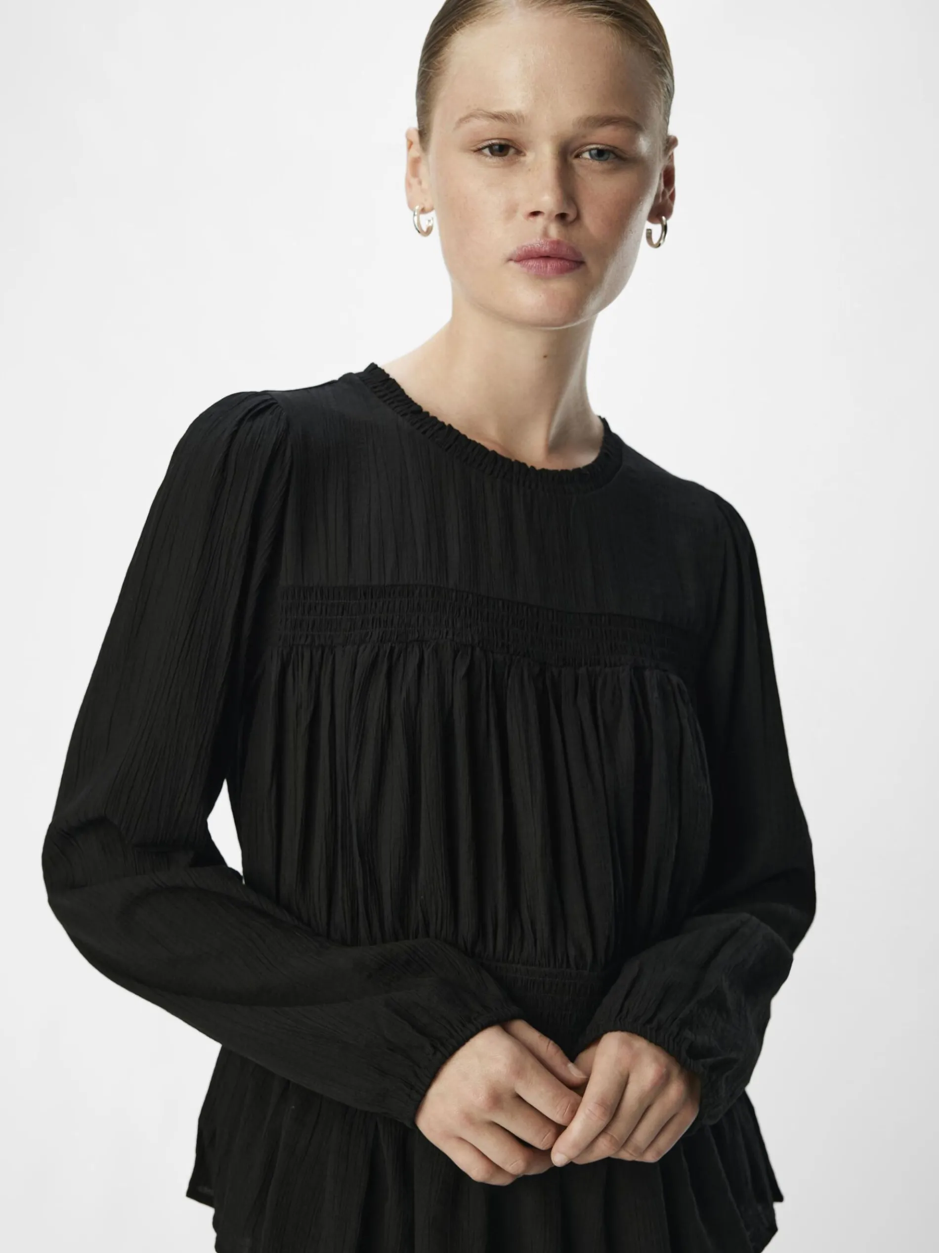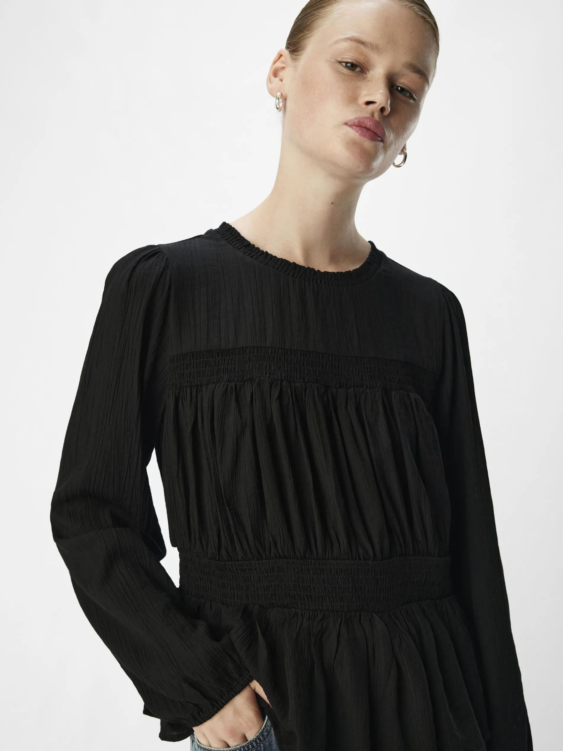 – Gesmokte top met lange mouwen- Ronde hals met plooien- Manchetten met elastiek- Ruche detail- Peplum zoom- Regular fit
