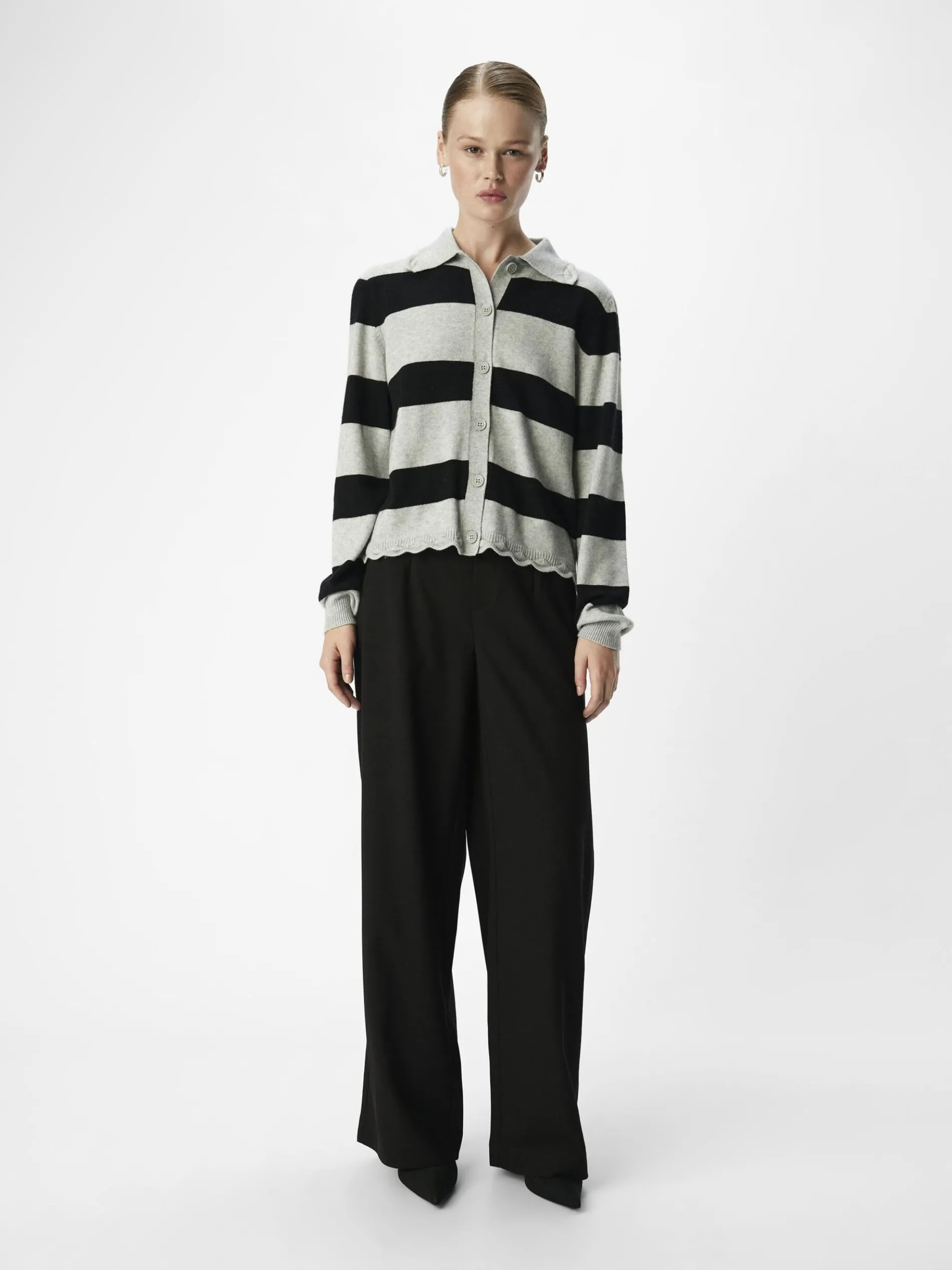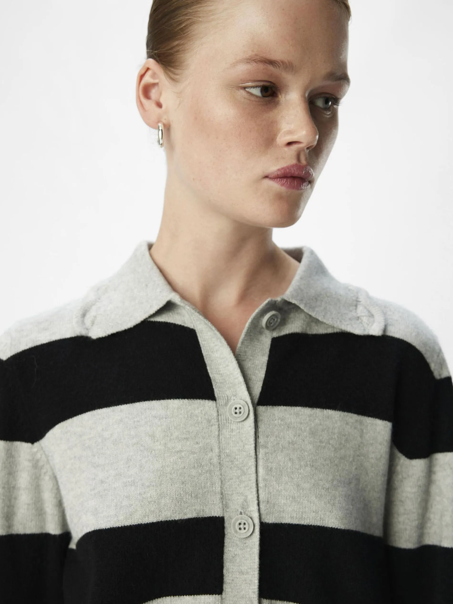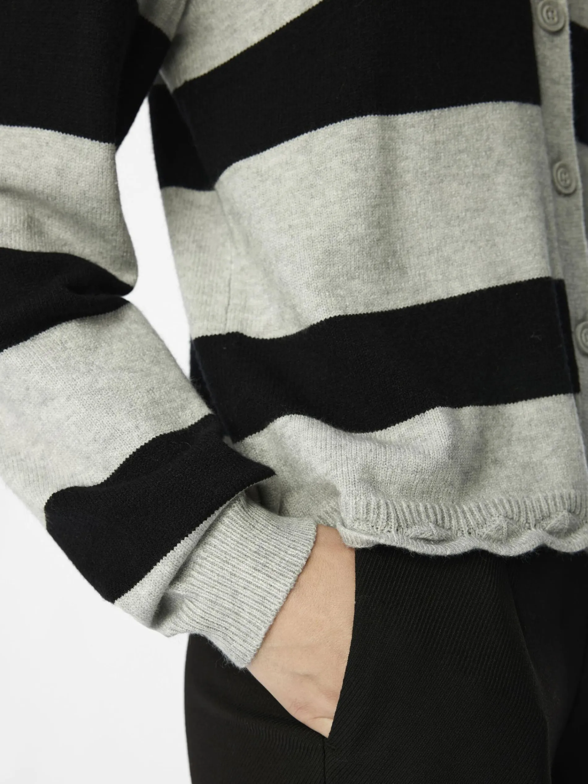 – Gebreid vest met gestreept ontwerp- Gespreide kraag met golvende rand- Lange mouwen- Knoopsluiting aan de voorkant- Geribde boorden- Golvende zoom- Regular fit