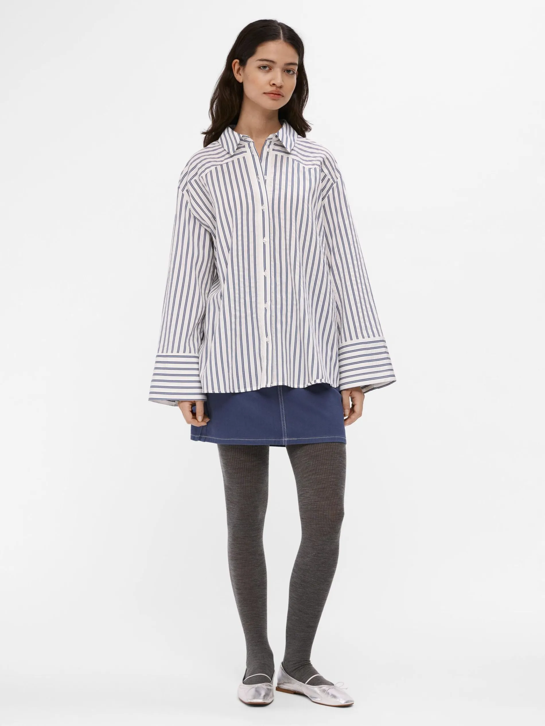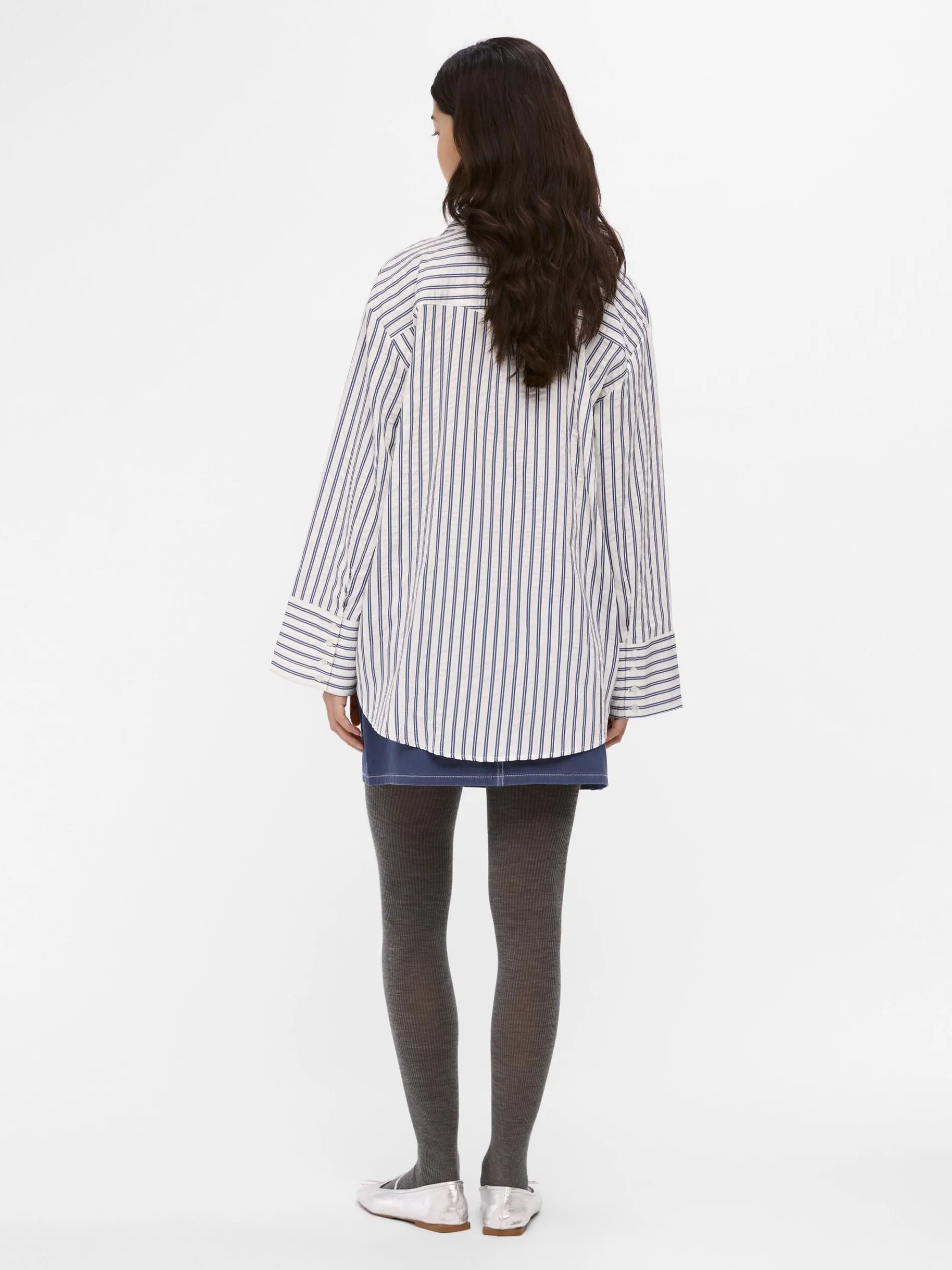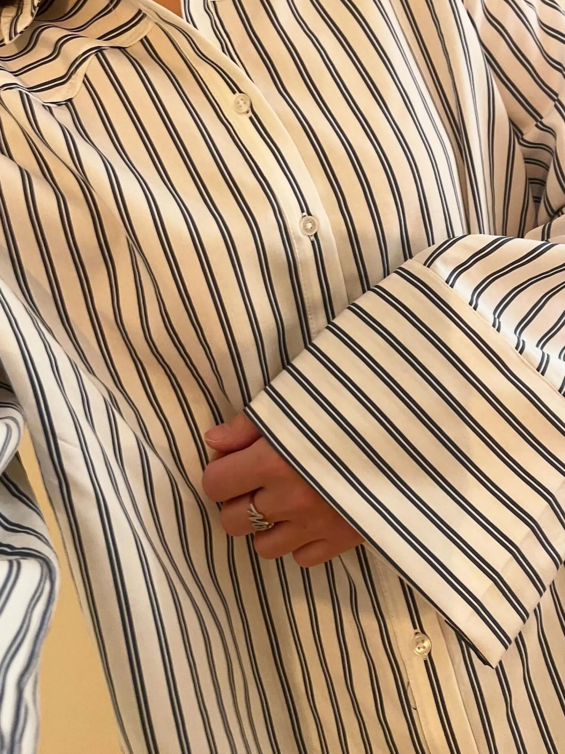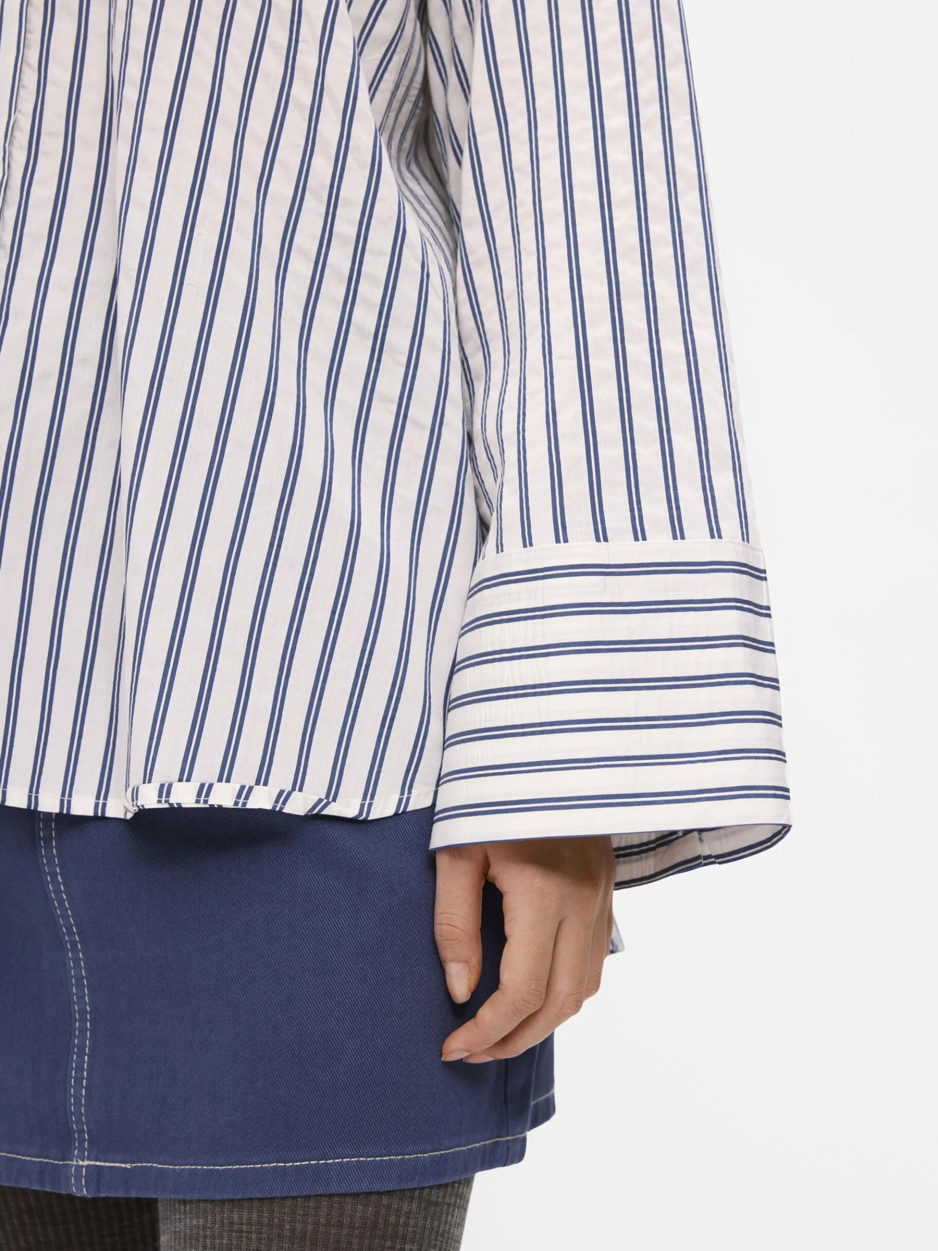 – Gekreukte gestreepte blouse- Normale kraag- Knoopsluiting aan de voorkant- Lange mouwen met oversized manchetten- Loose fit