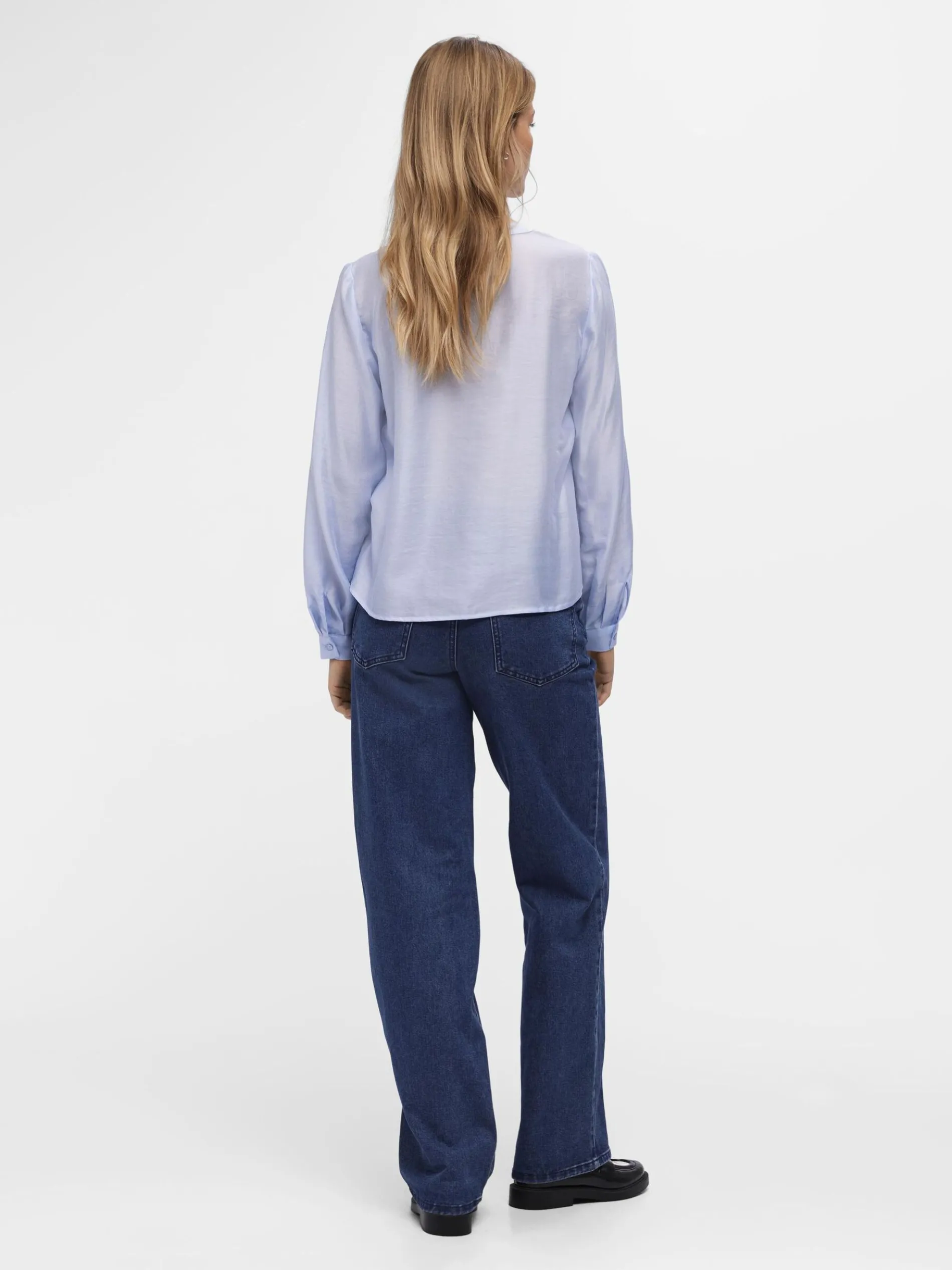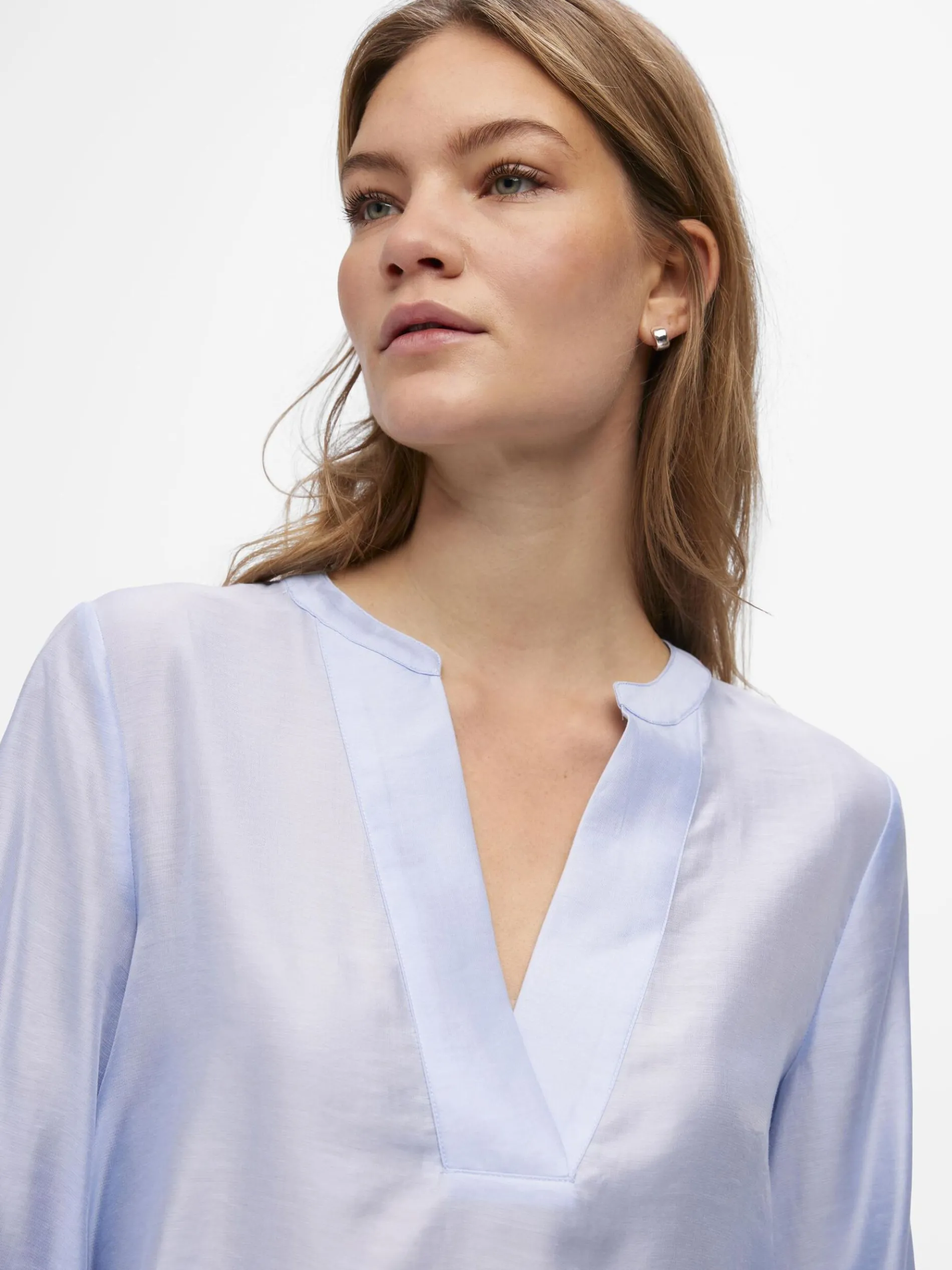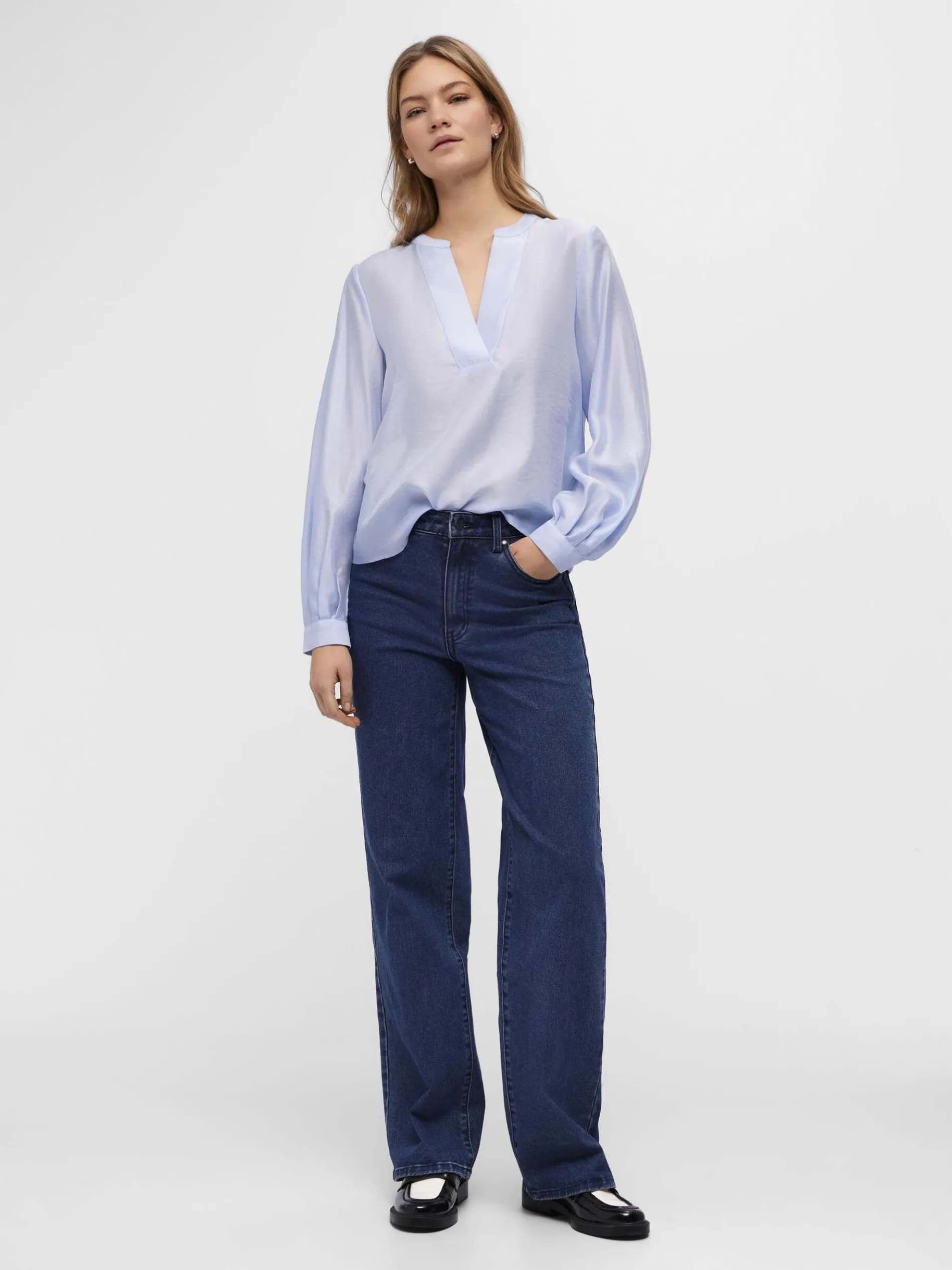 – Glanzende blouse met lange mouwen- V-hals zonder kraag- Lange volumineuze mouwen- Geplooid detail bij de manchetten- Regular fit- Gemaakt met duurzamere stoffen