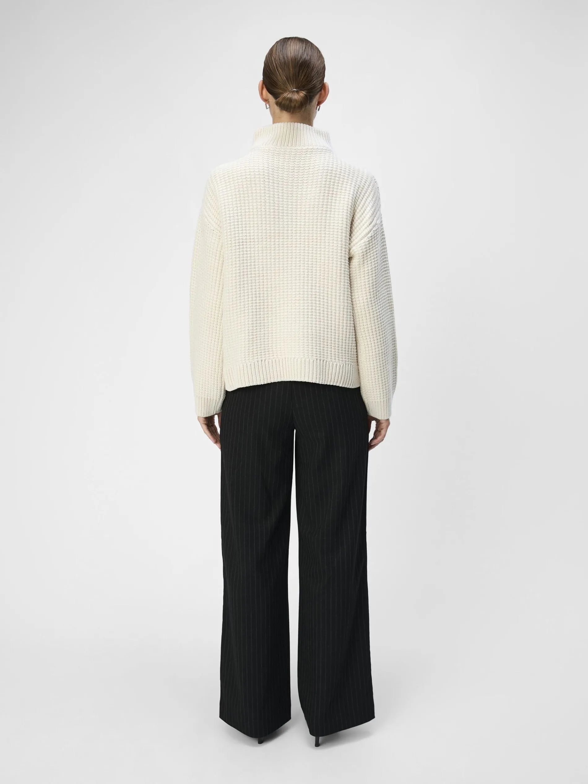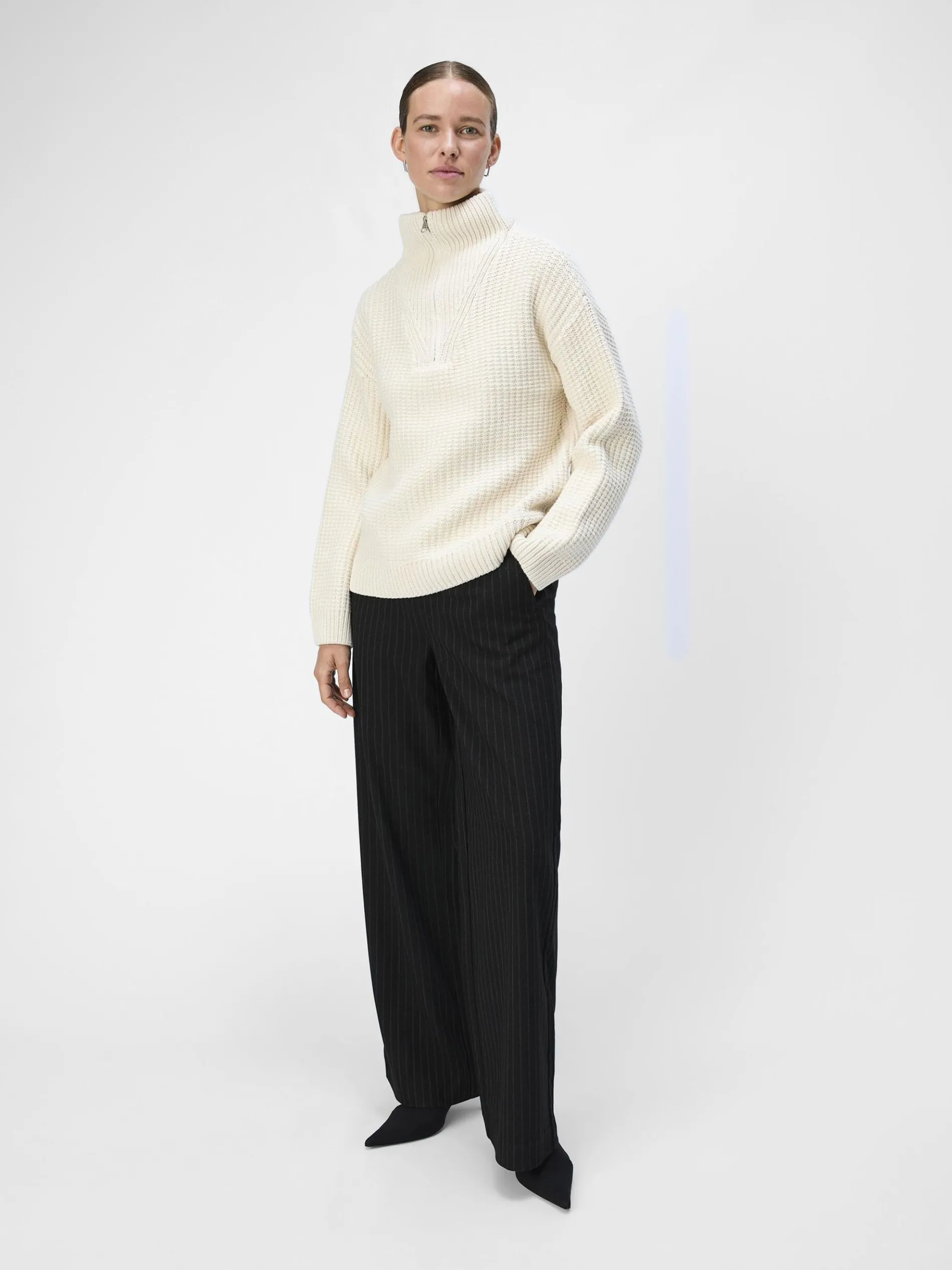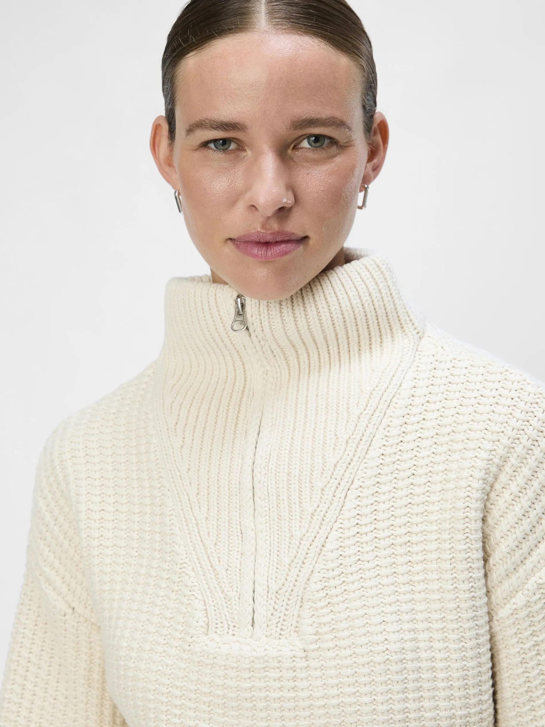 – Gebreide trui met hoge hals- Halve ritssluiting- Lange mouwen met verlaagde schouders- Geribde boorden- Loose fit