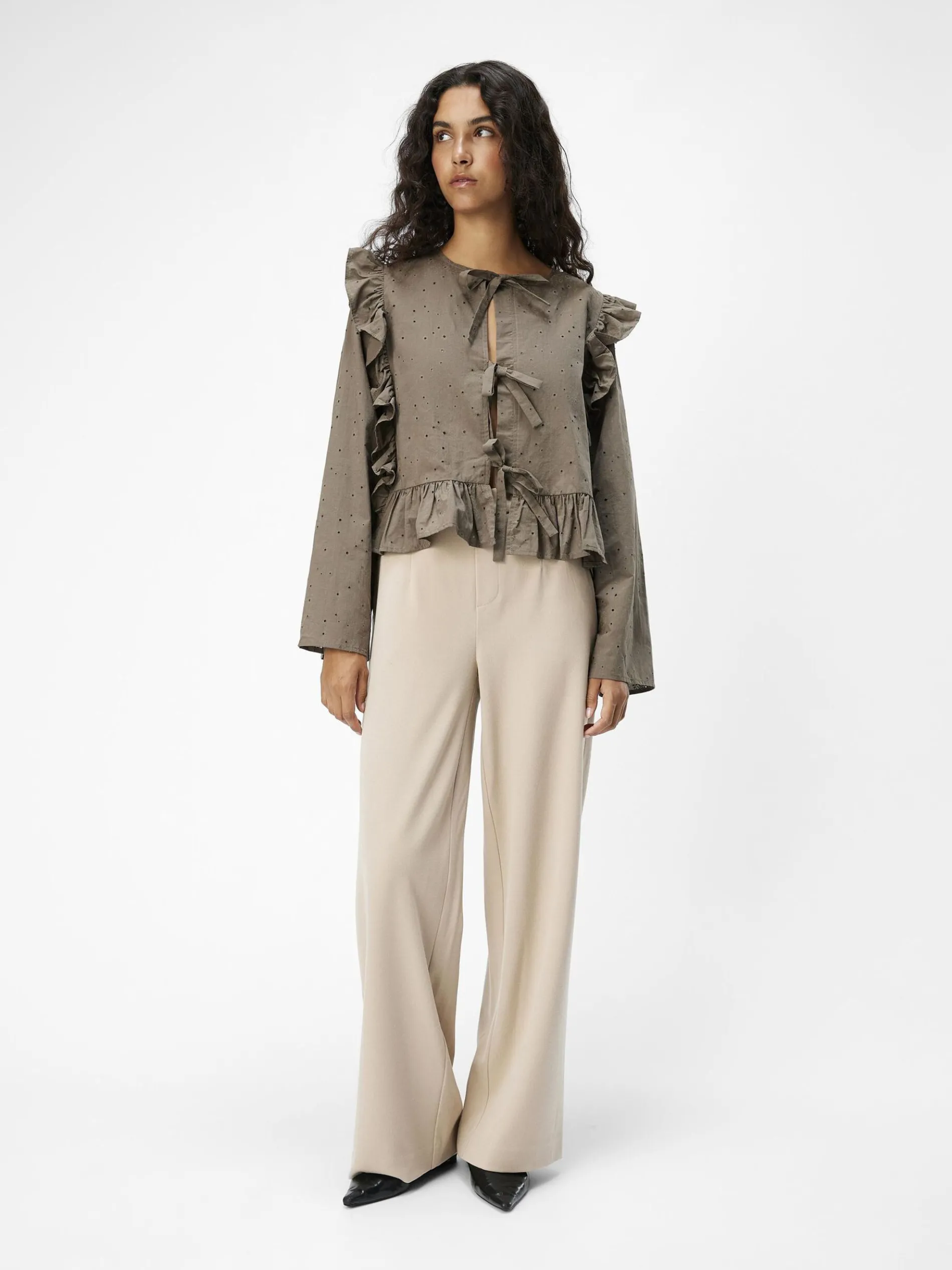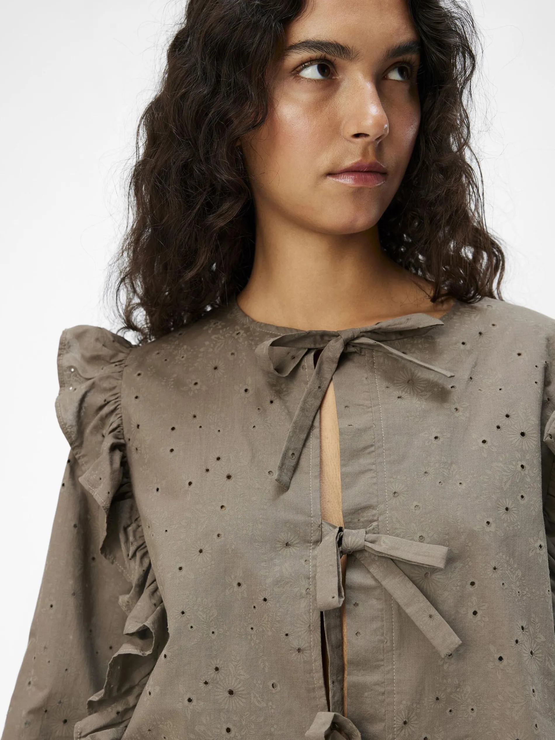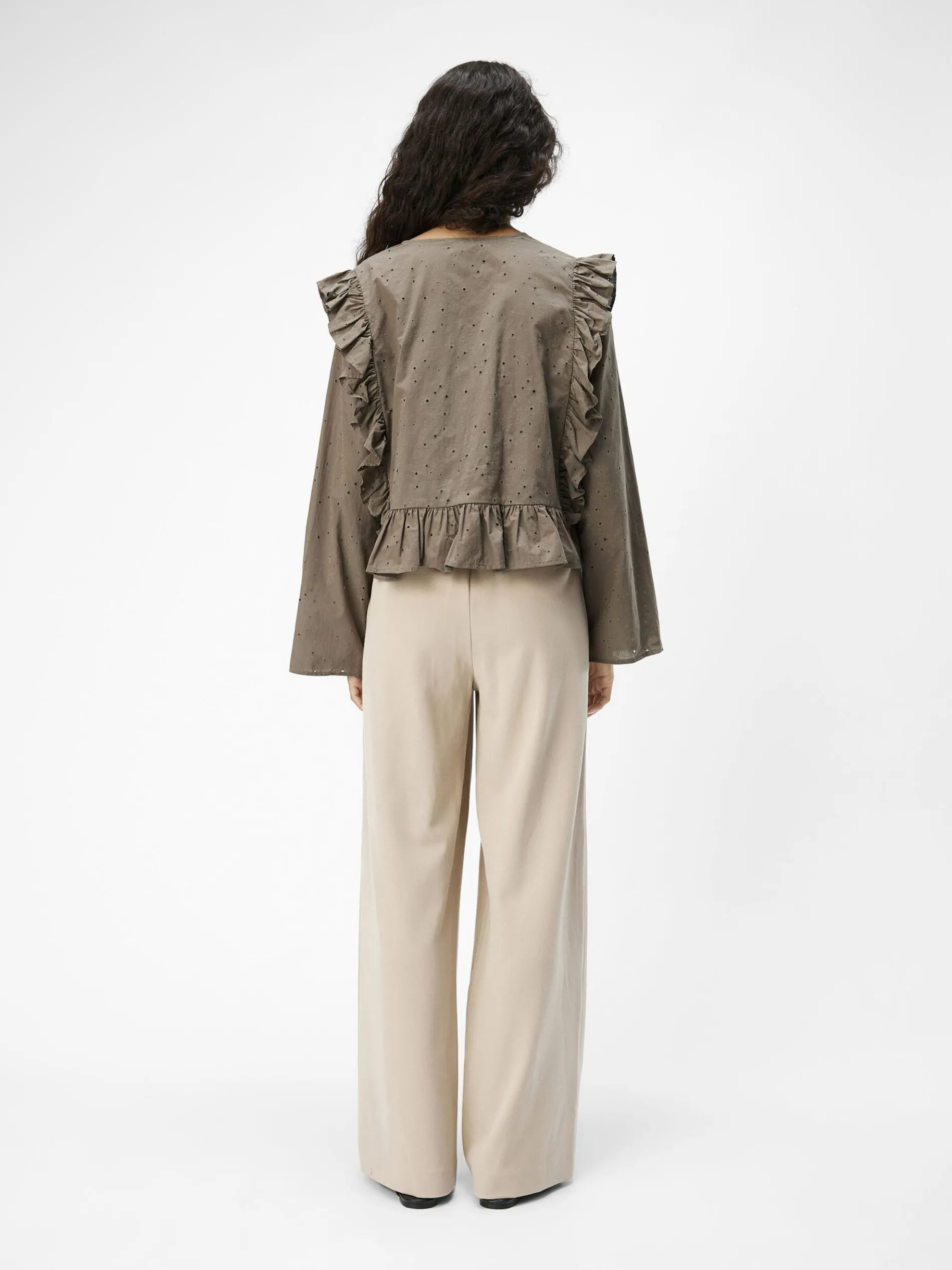 – Peplum blouse met gebloemd jacquard ontwerp- Striksluiting aan de voorkant- Ruches bij de schouders- Lange mouwen- Loose fit