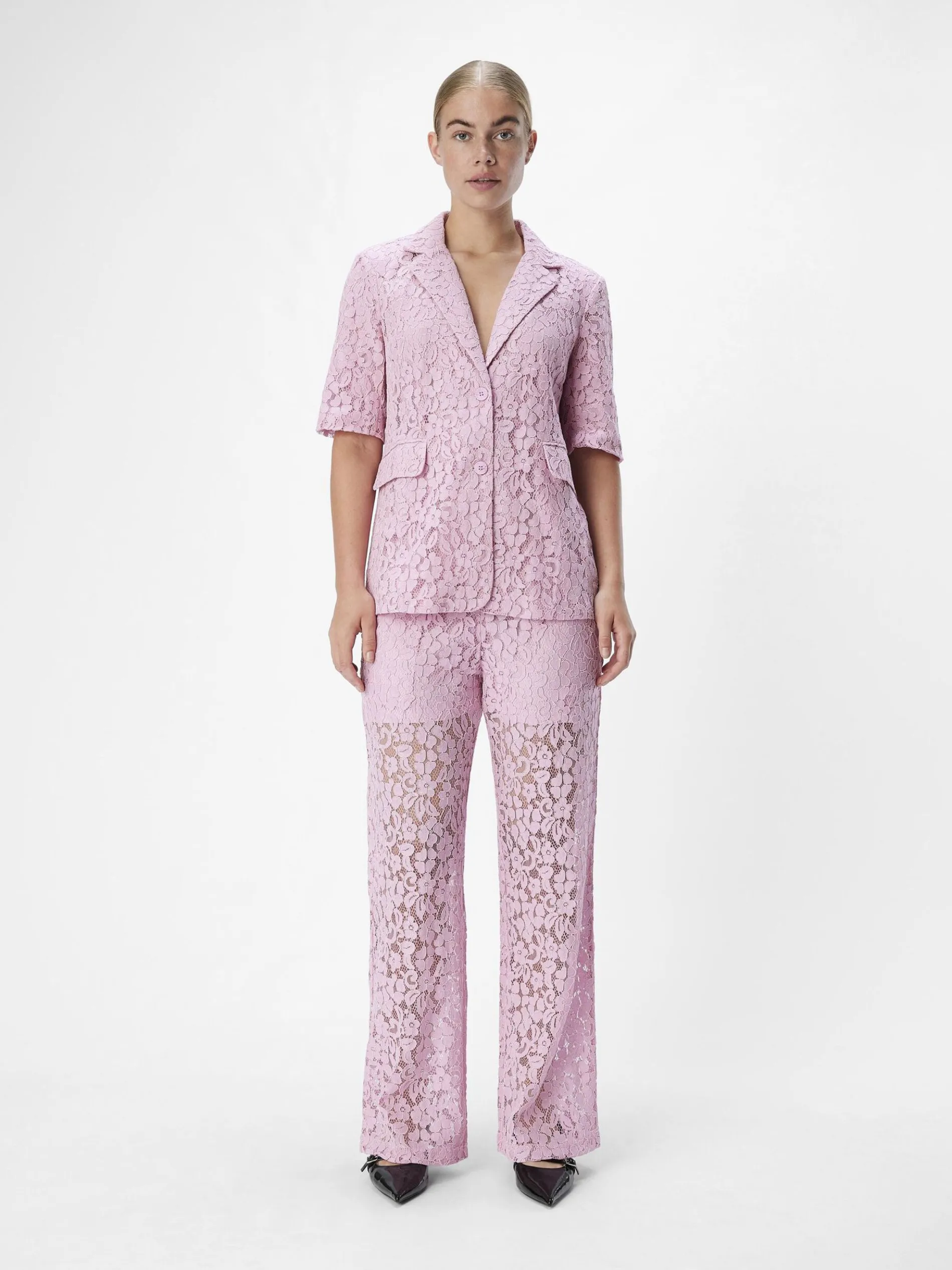 – Broek met bloemenkant- Elastische mid-waist- Half gevoerd- Flared pasvorm