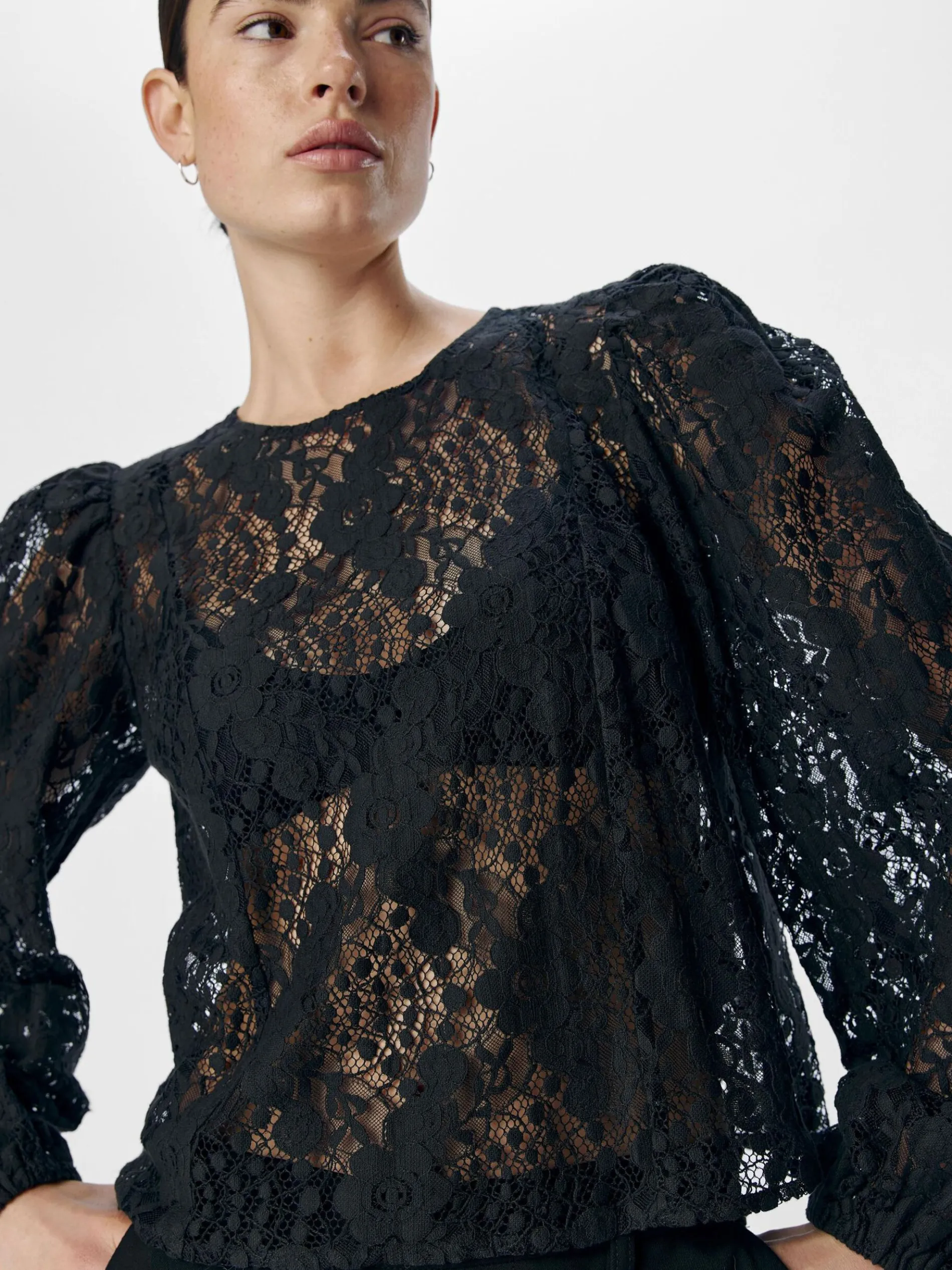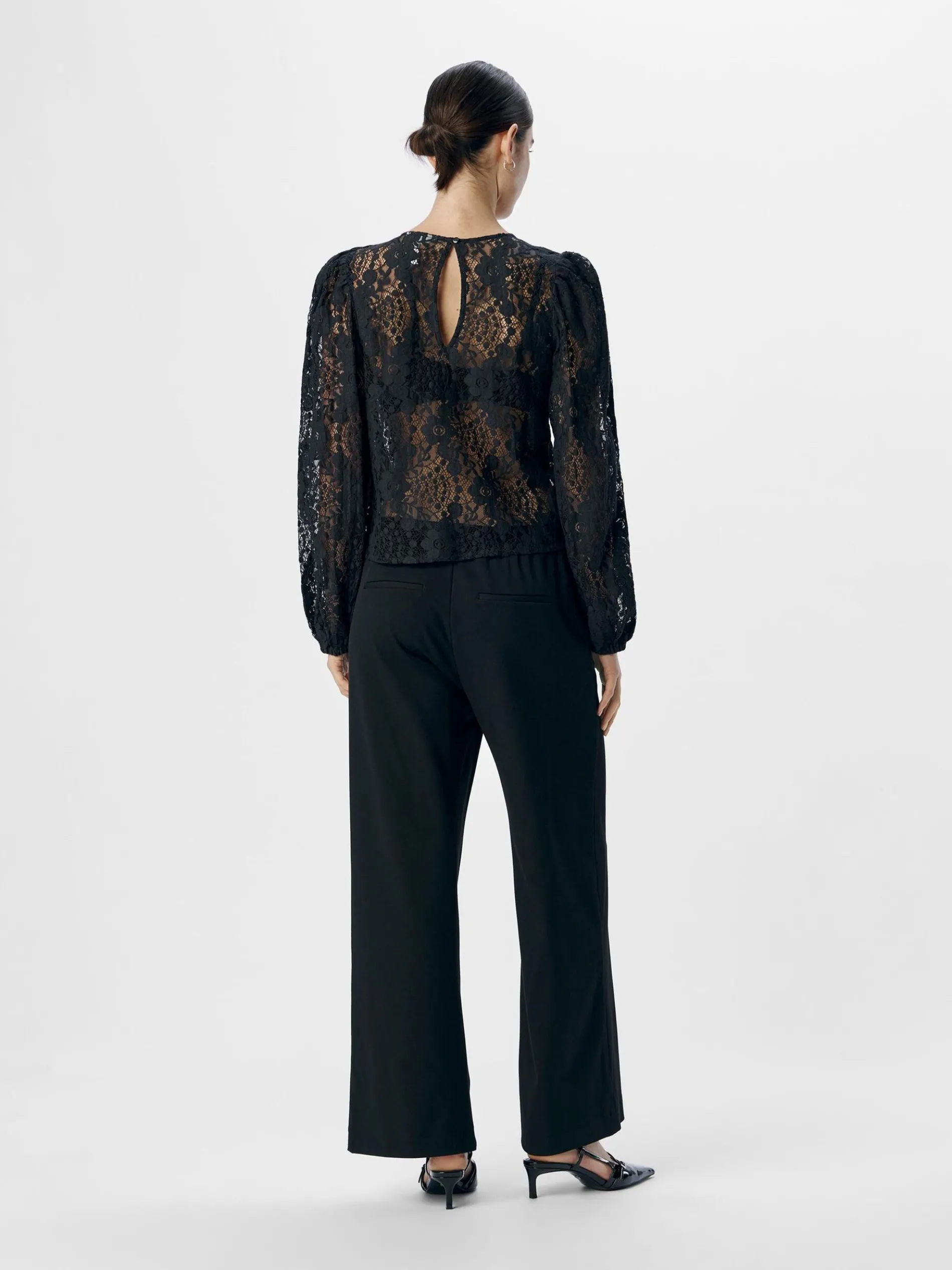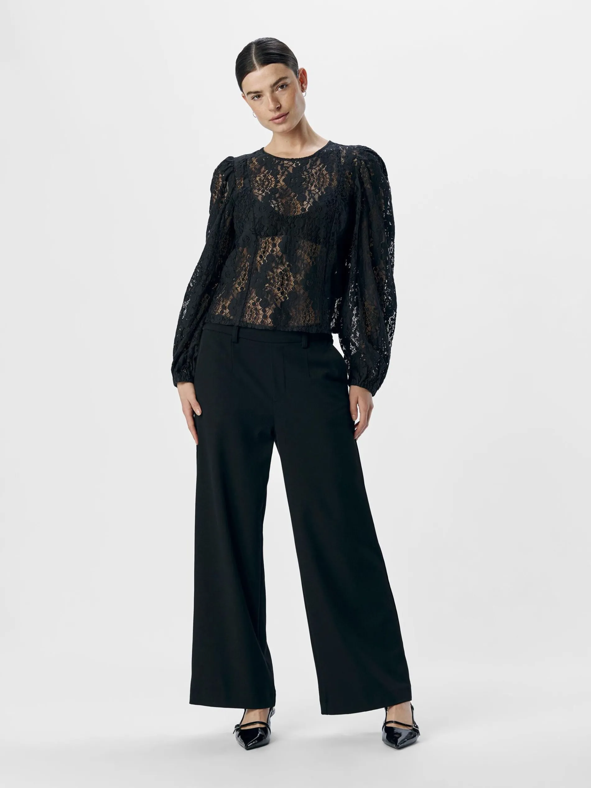 – Top met bloemenkant- Ronde hals- Lange volumineuze mouwen- Manchetten met elastiek- Zonder voering- Loose fit