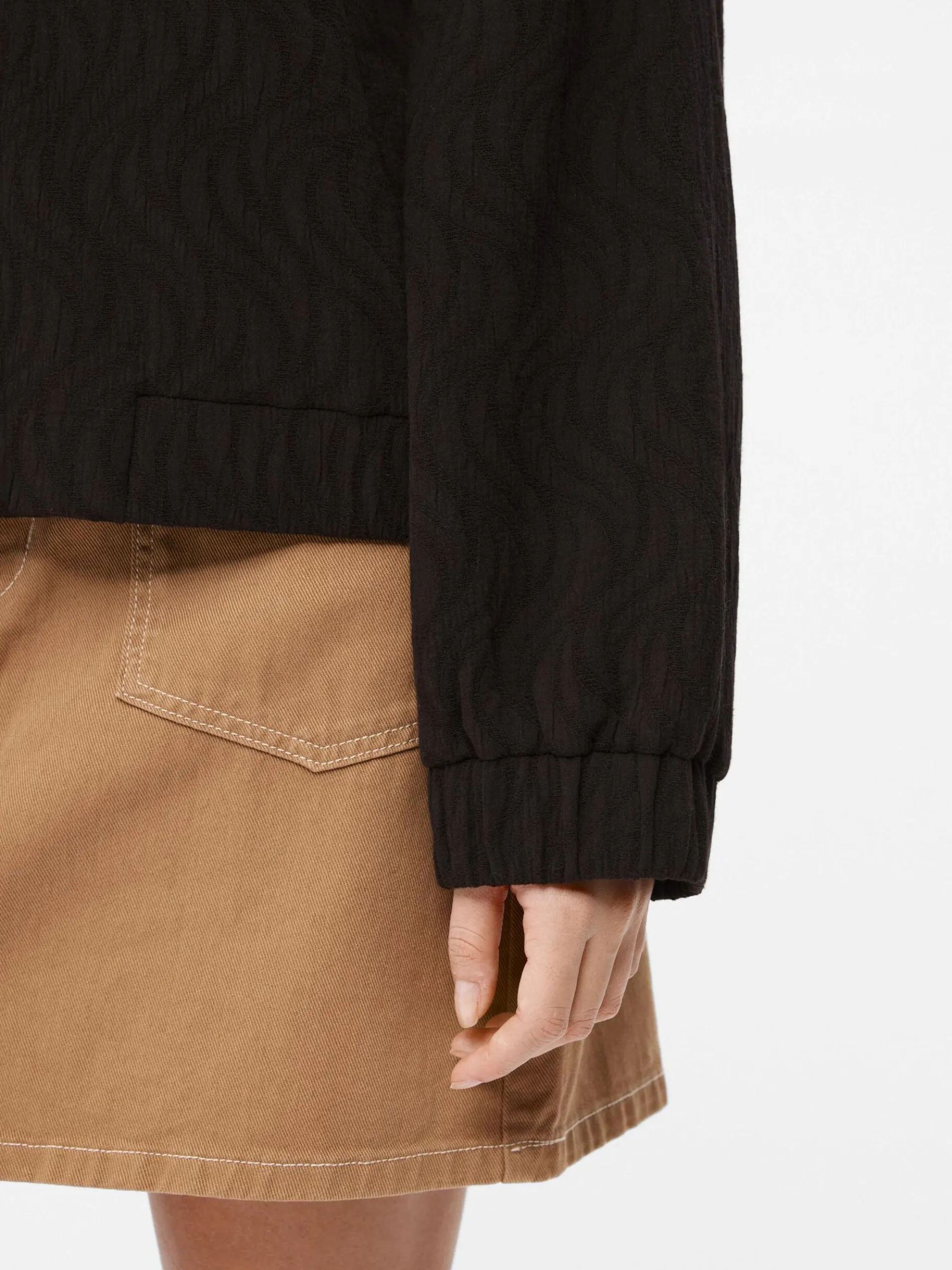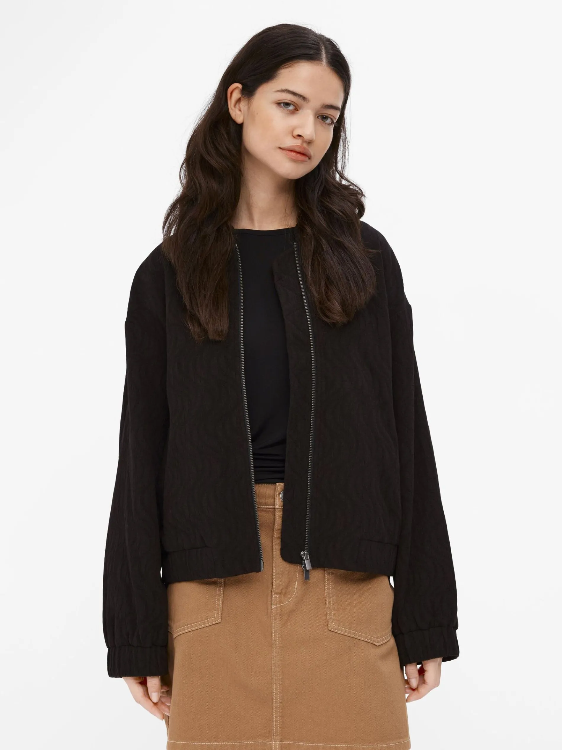– Bomberjack met golfpatroon- Bomberkraag- Tweeweg rits aan de voorzijde- Lage schouders- Lange mouwen met elastische manchetten- Paspelzakken aan de voorkant- Regular fit