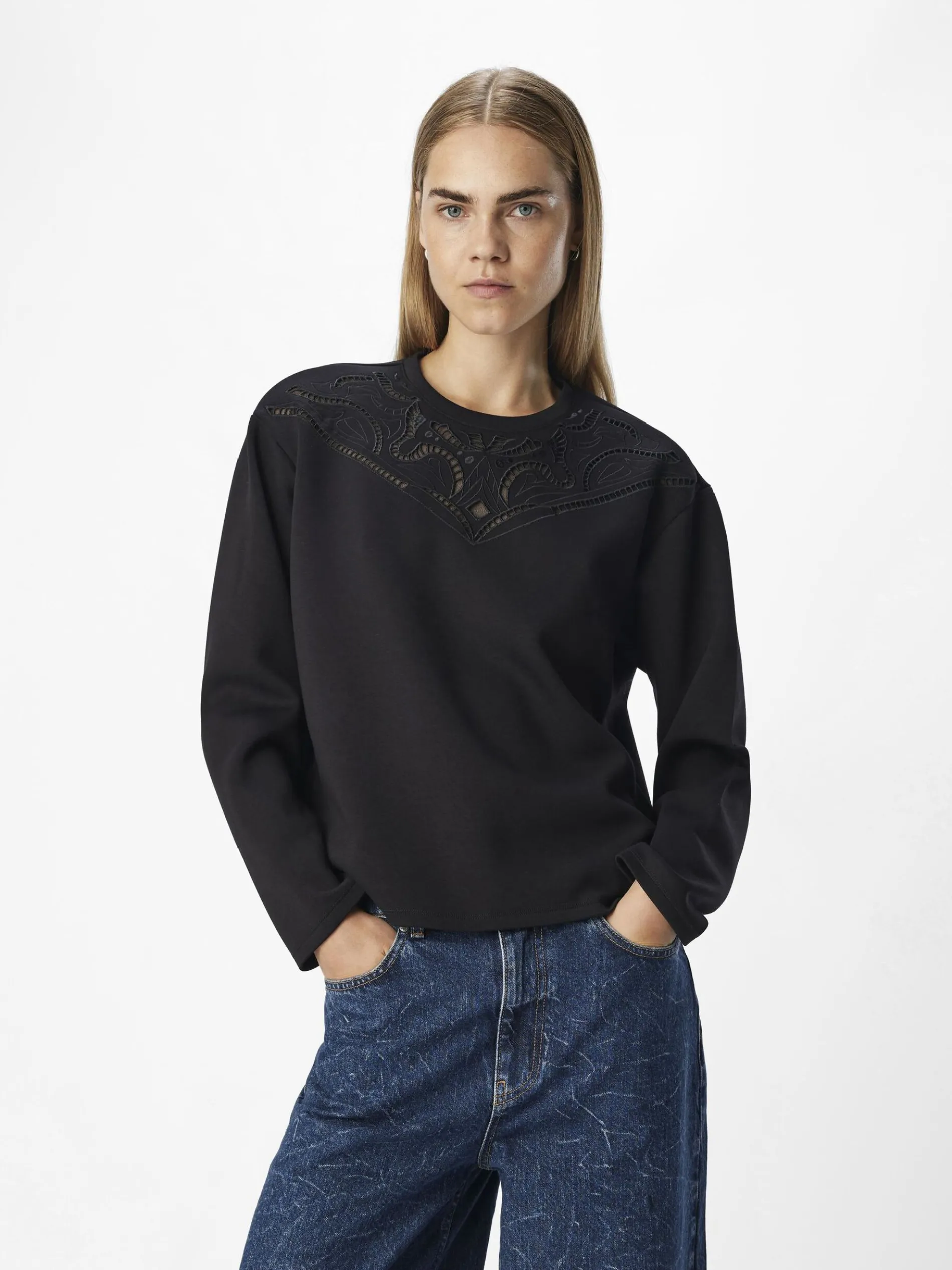 – Trui met lange mouwen- Details op de borst- Ronde hals- Lage schouders- Loose fit