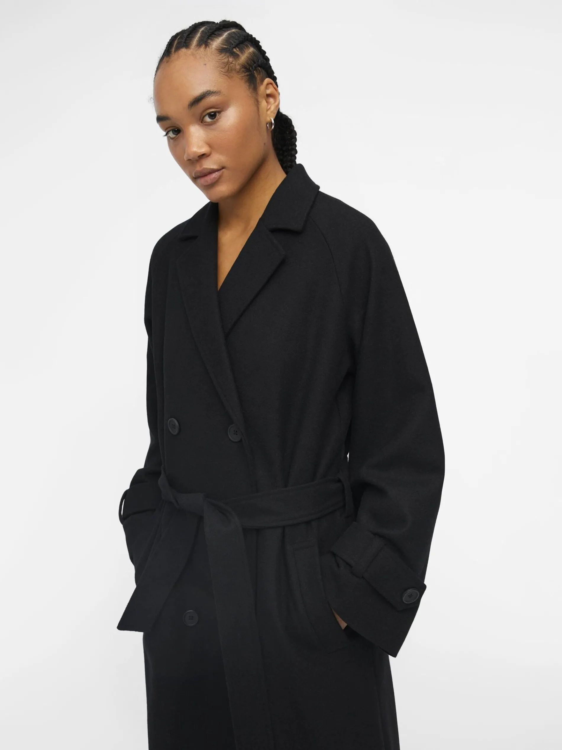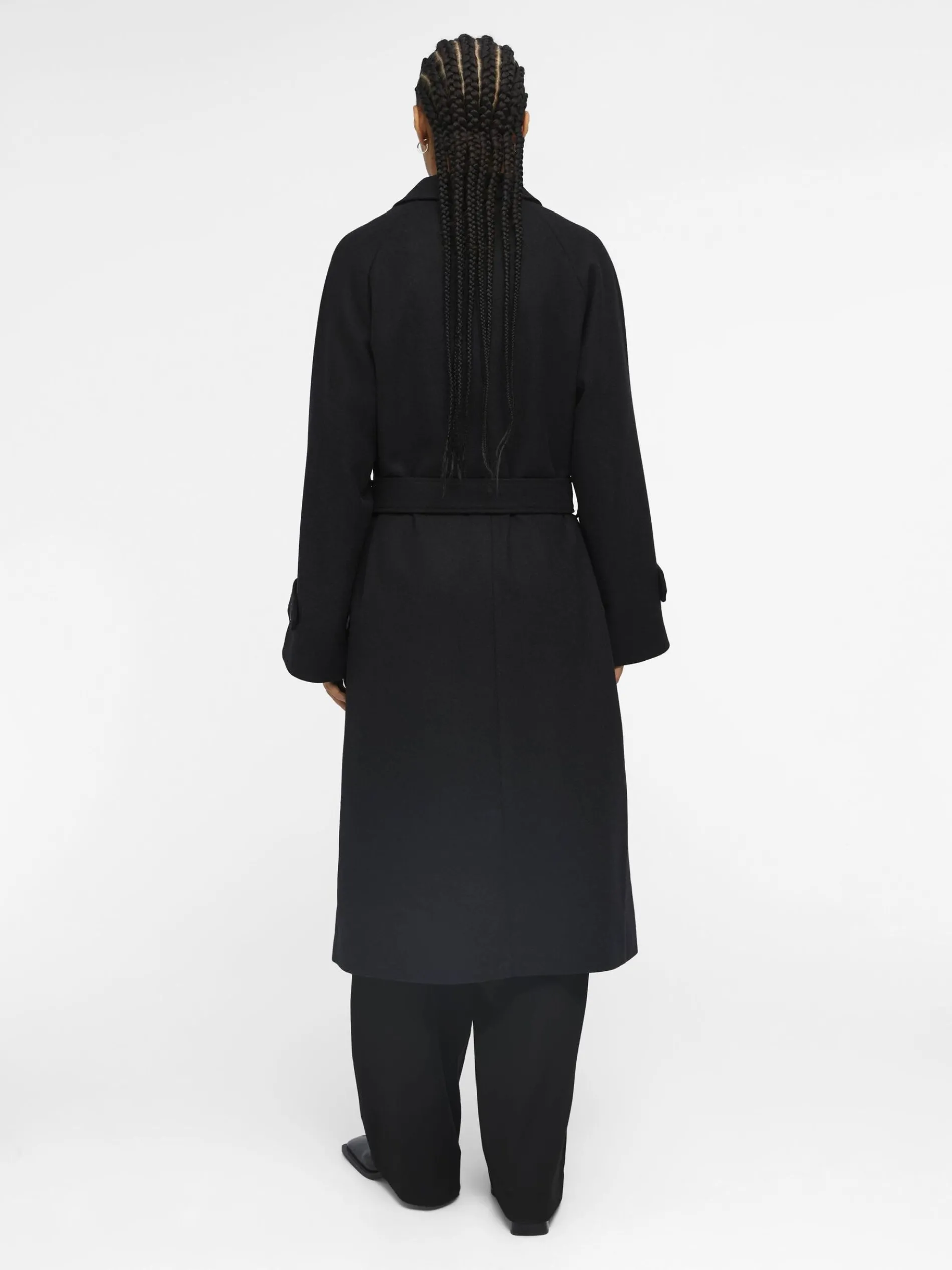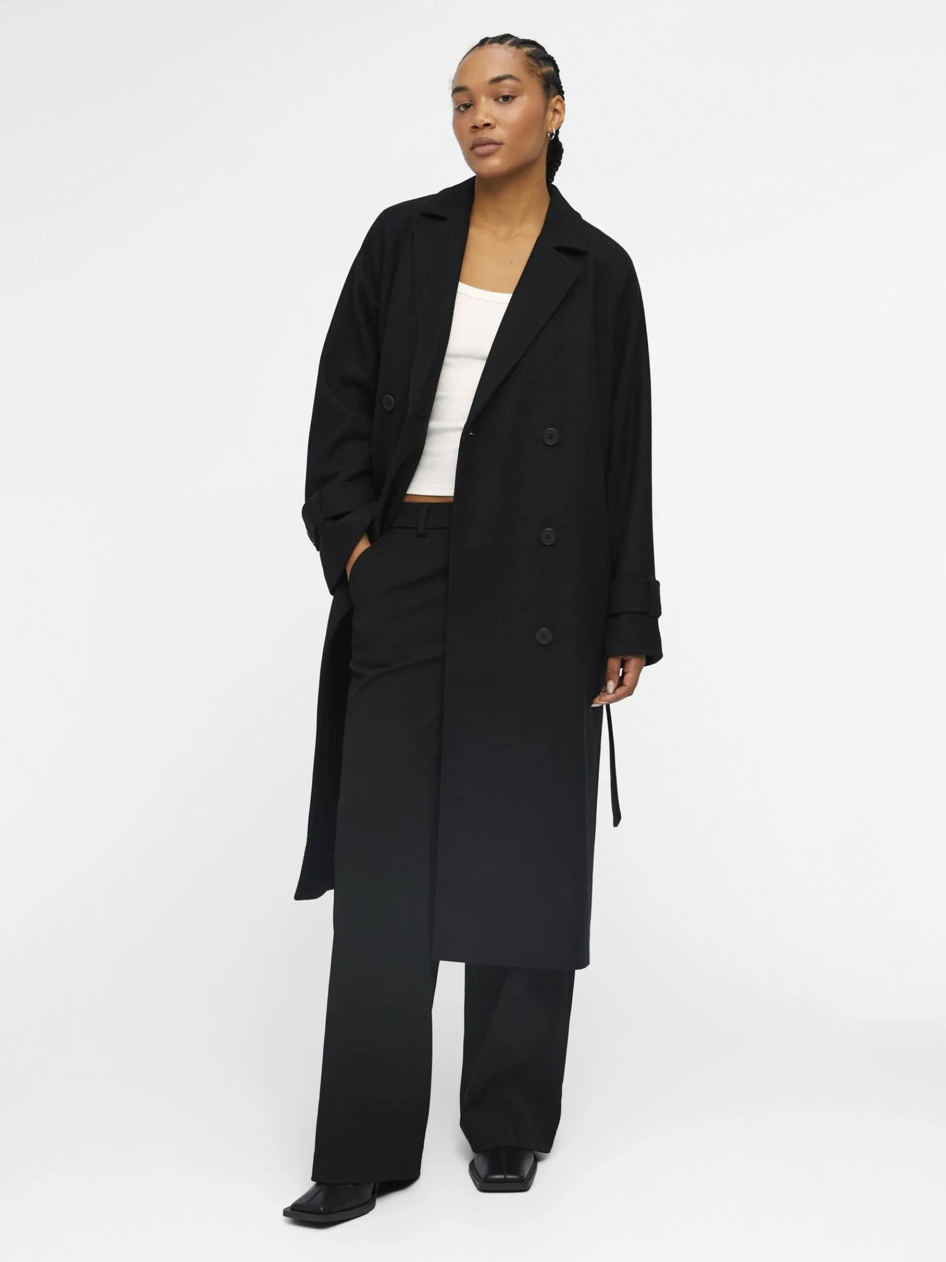 – Revers met inkeping- Dubbele knopenrij- Strikceintuur- Uitlopende mouwen- Bandjes aan de manchetten- Schuine zijzakken- Straight fit