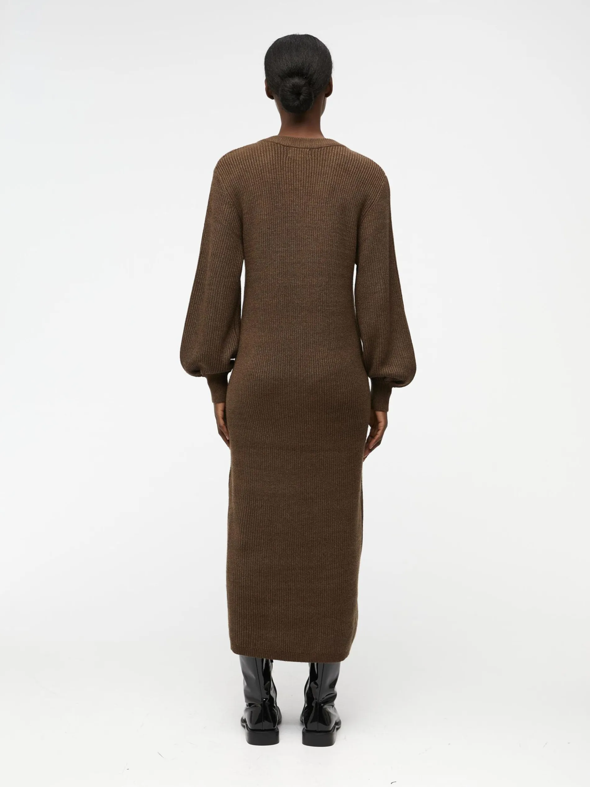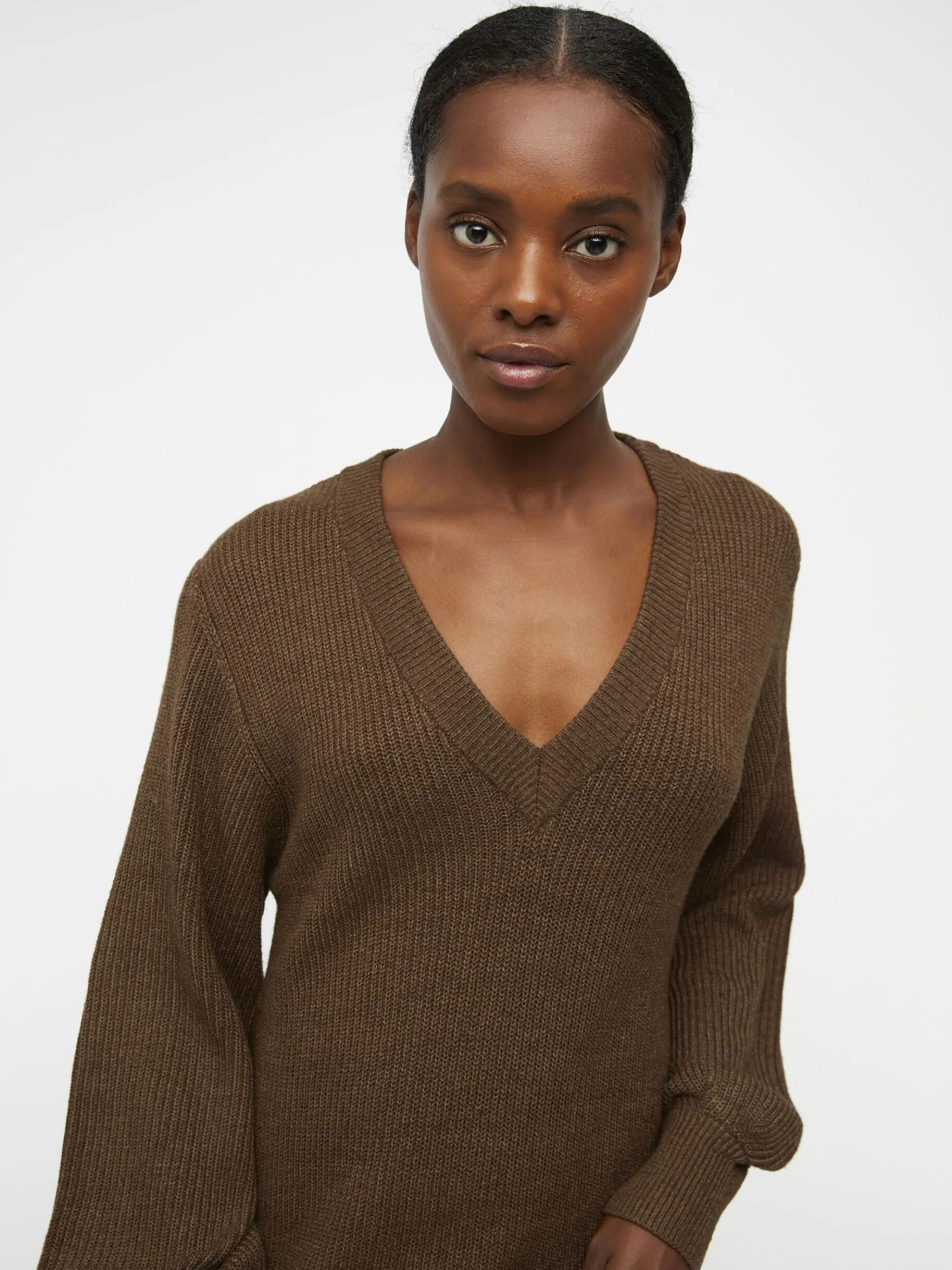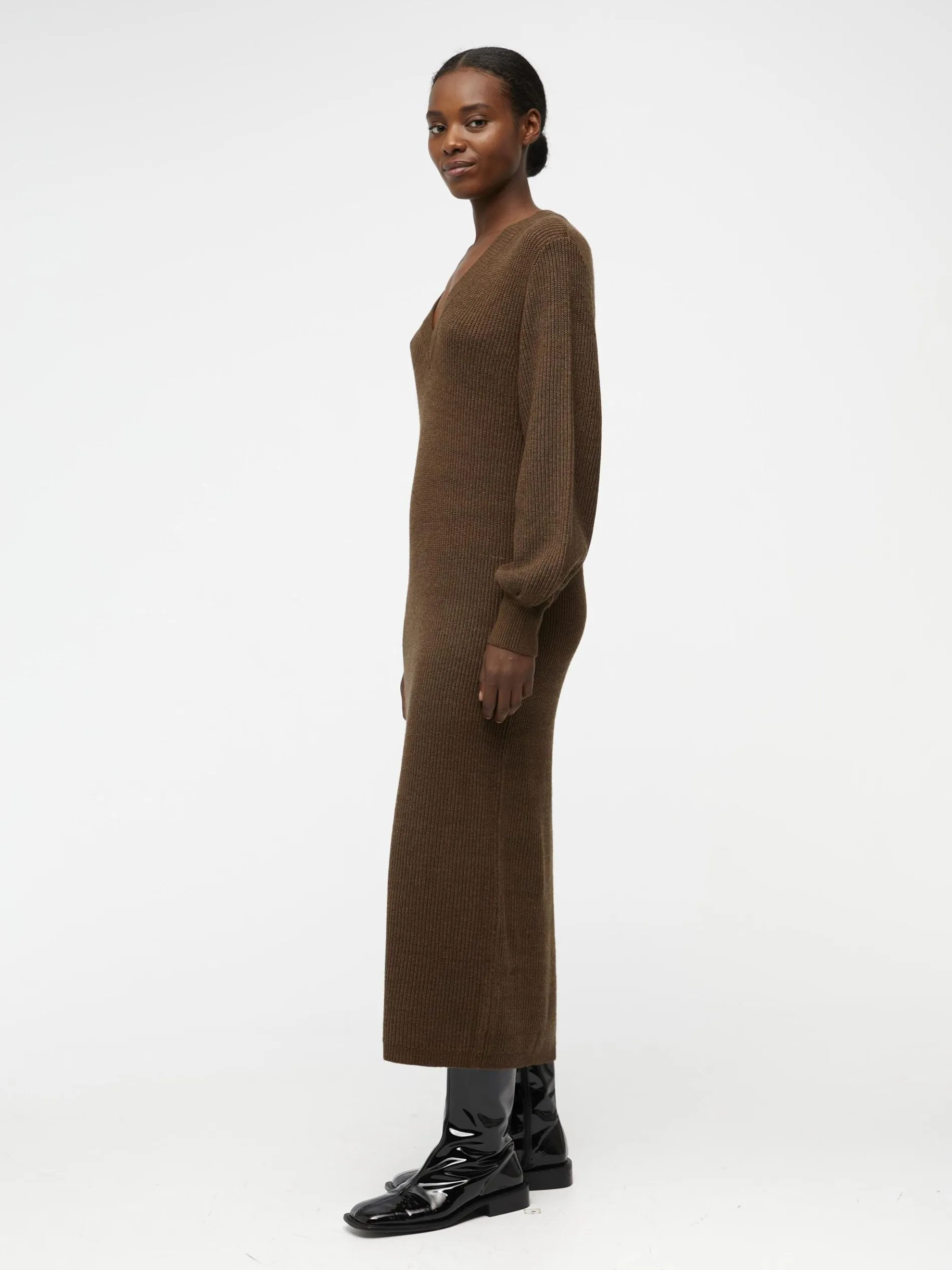 – Zachte, geribde, gebreide jurk- V-hals- Lage schouders- Midi lengte- Regular fit- Model draagt maat 36- Dit model is 178 cm lang- Gemaakt met duurzamere stoffen