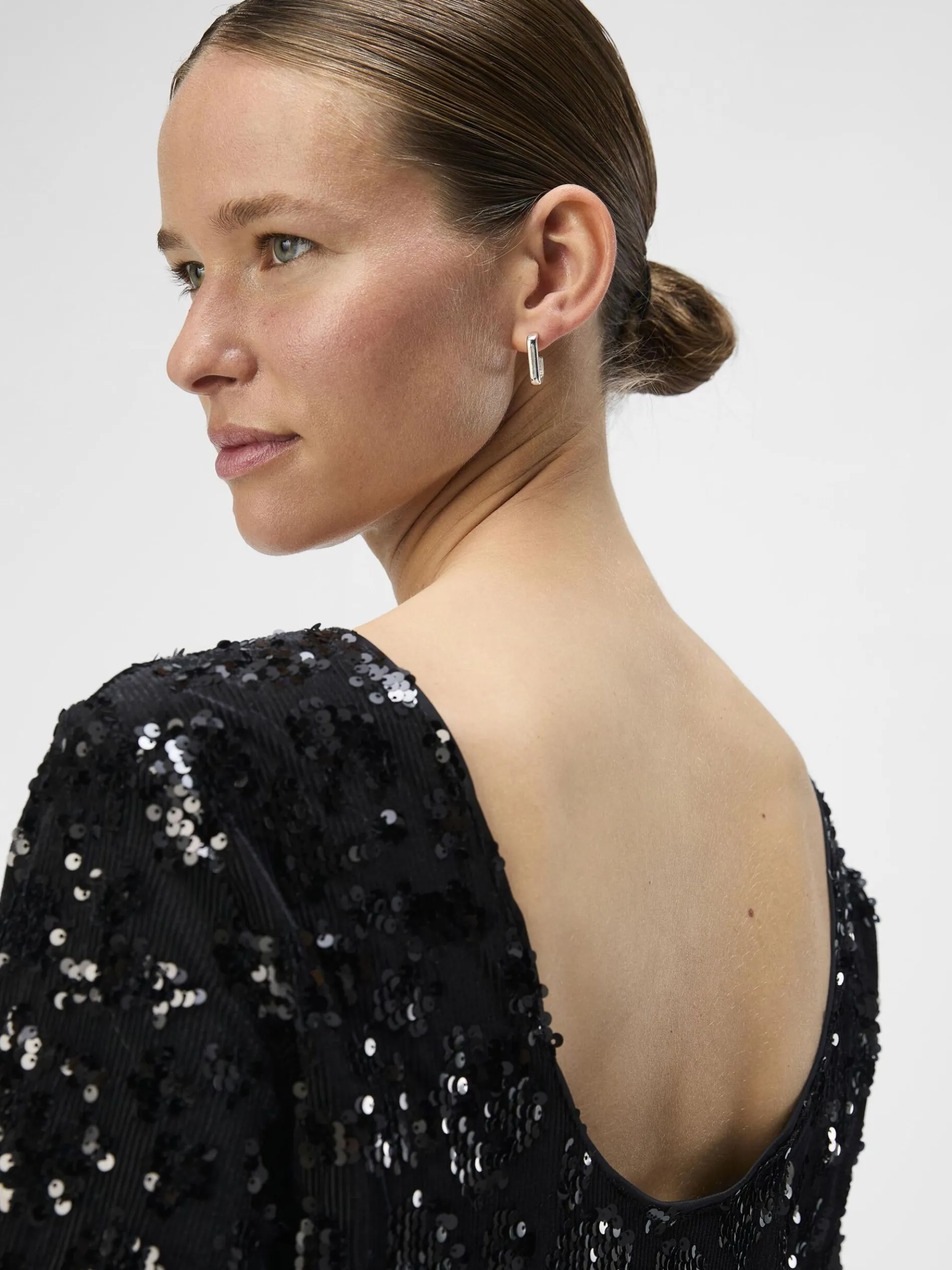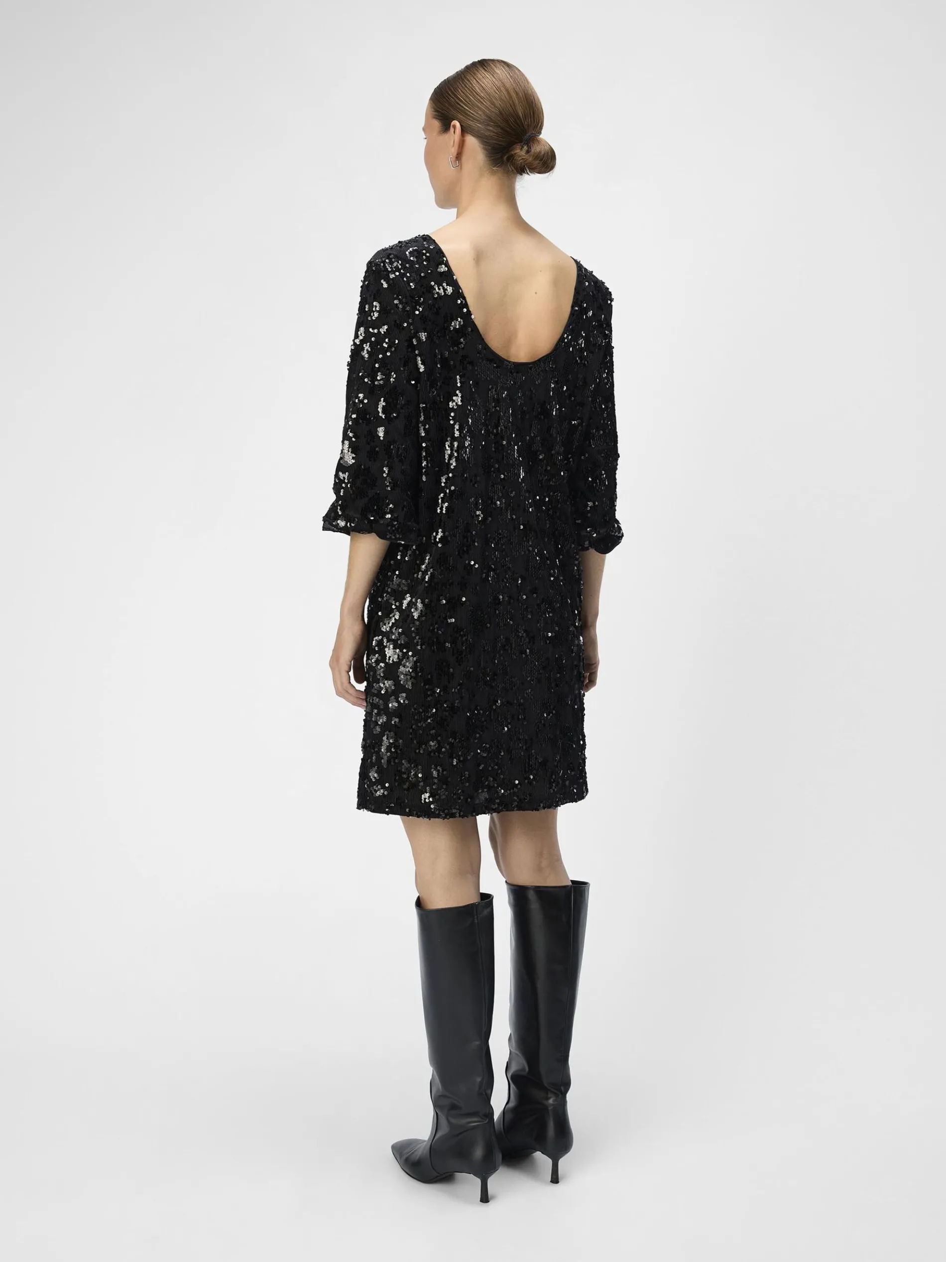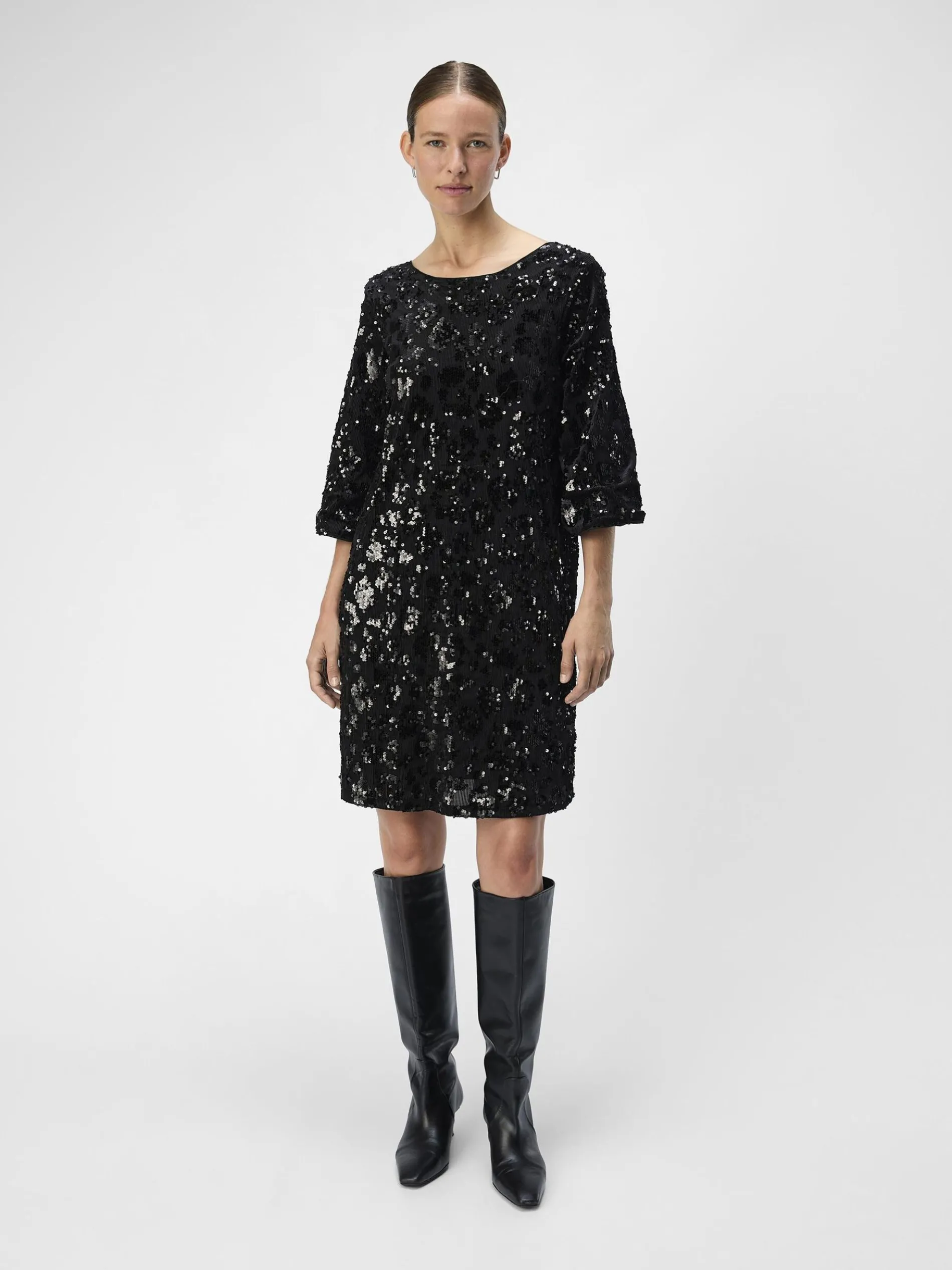– Mini-jurk met pailletten- Ronde hals- 3/4-mouwen- U-vormige uitsnede aan de achterkant- Met voering- Loose fit