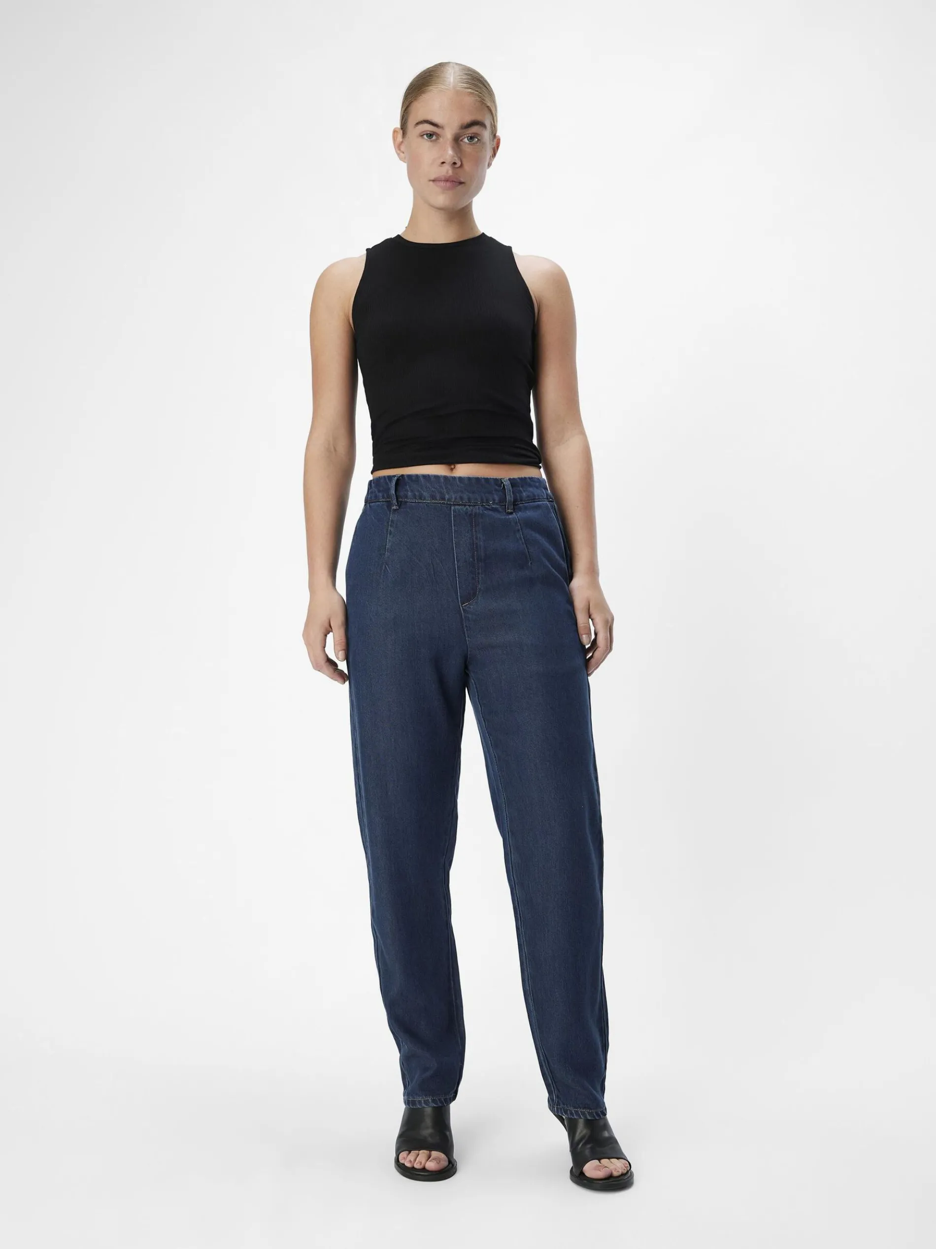 – Loose-fit broek met denim look- Middelhoge elastische taille met riemlussen- Zijzakken- Opgestikte achterzakken- Straight leg fit