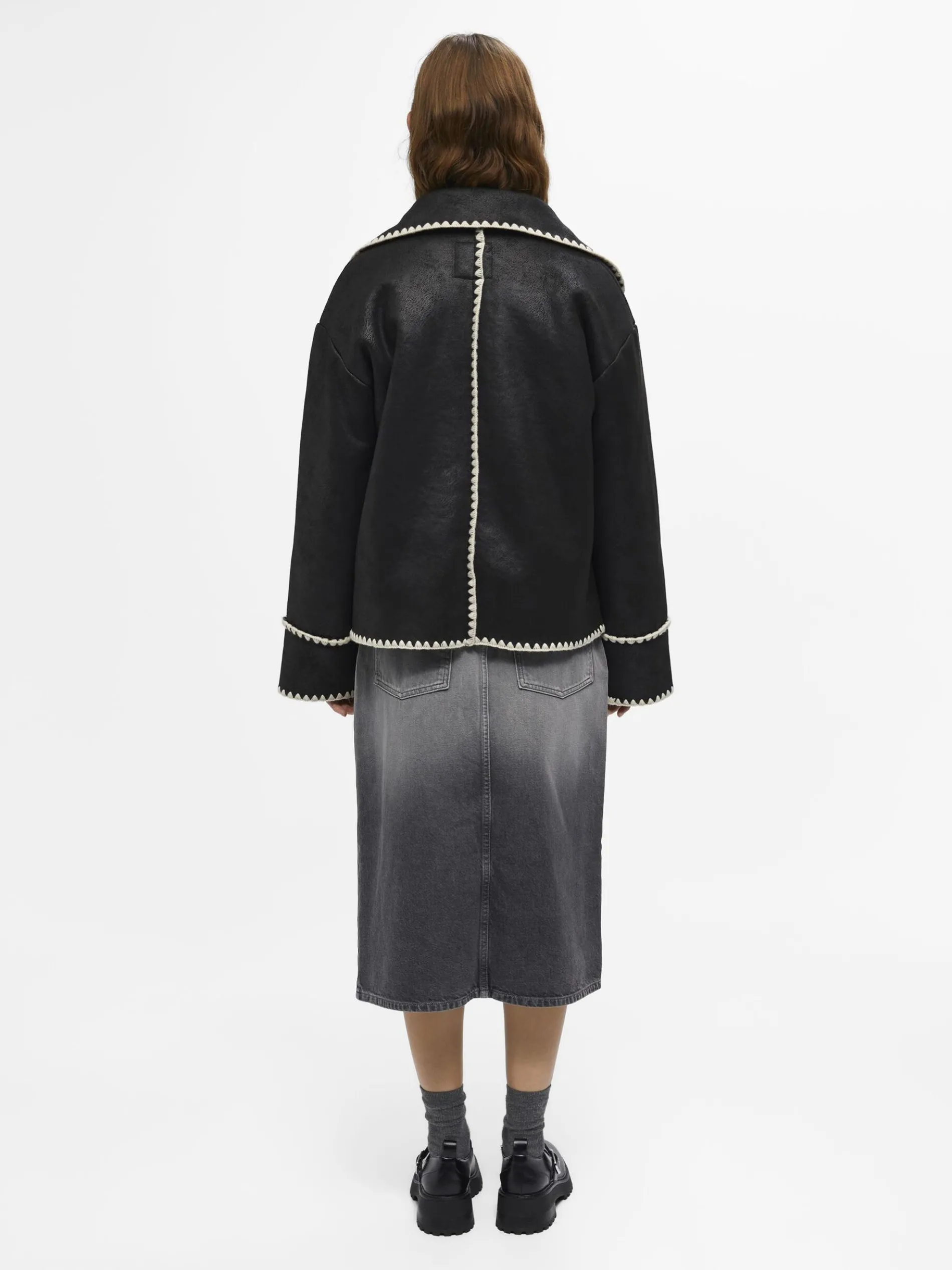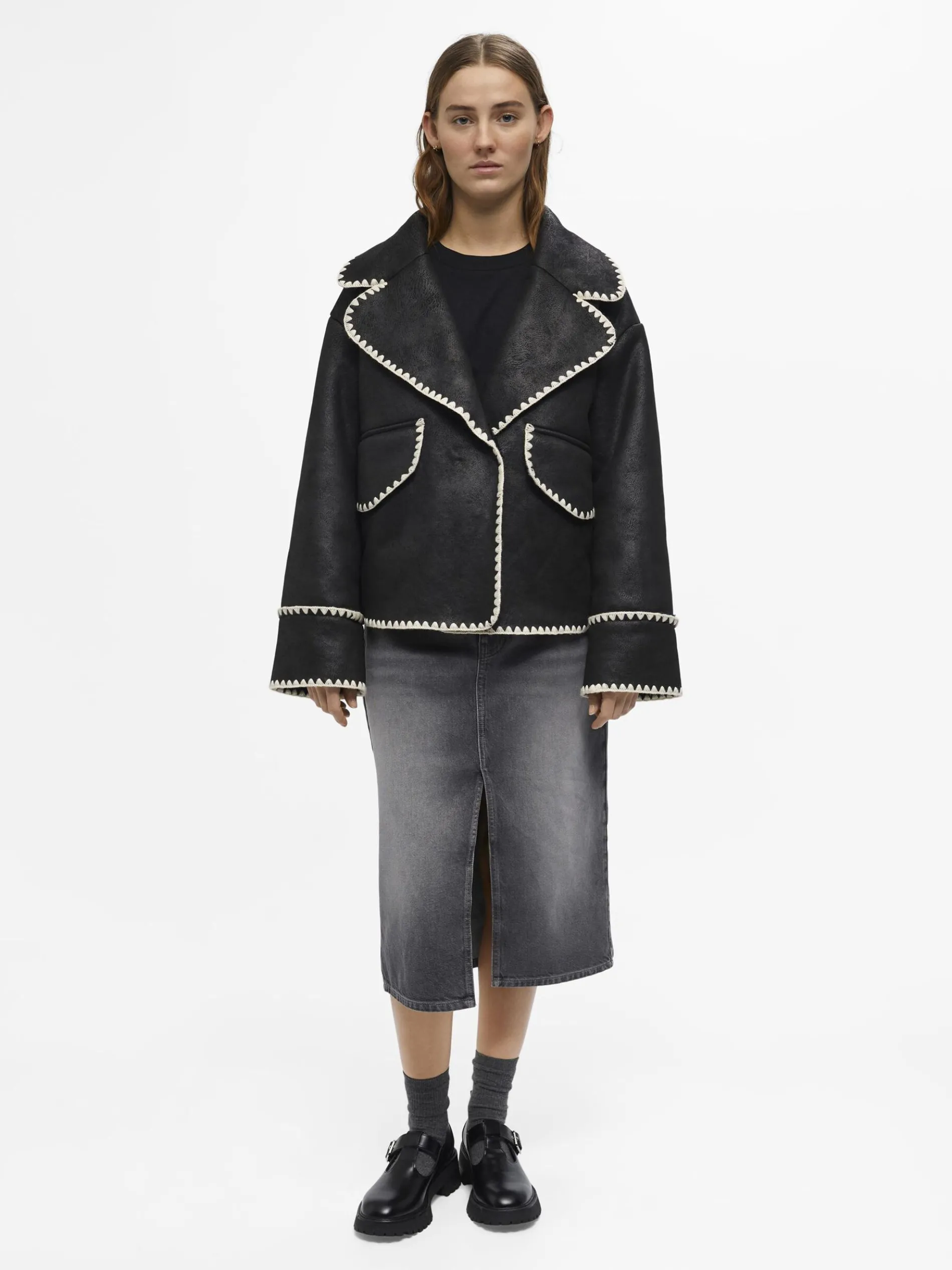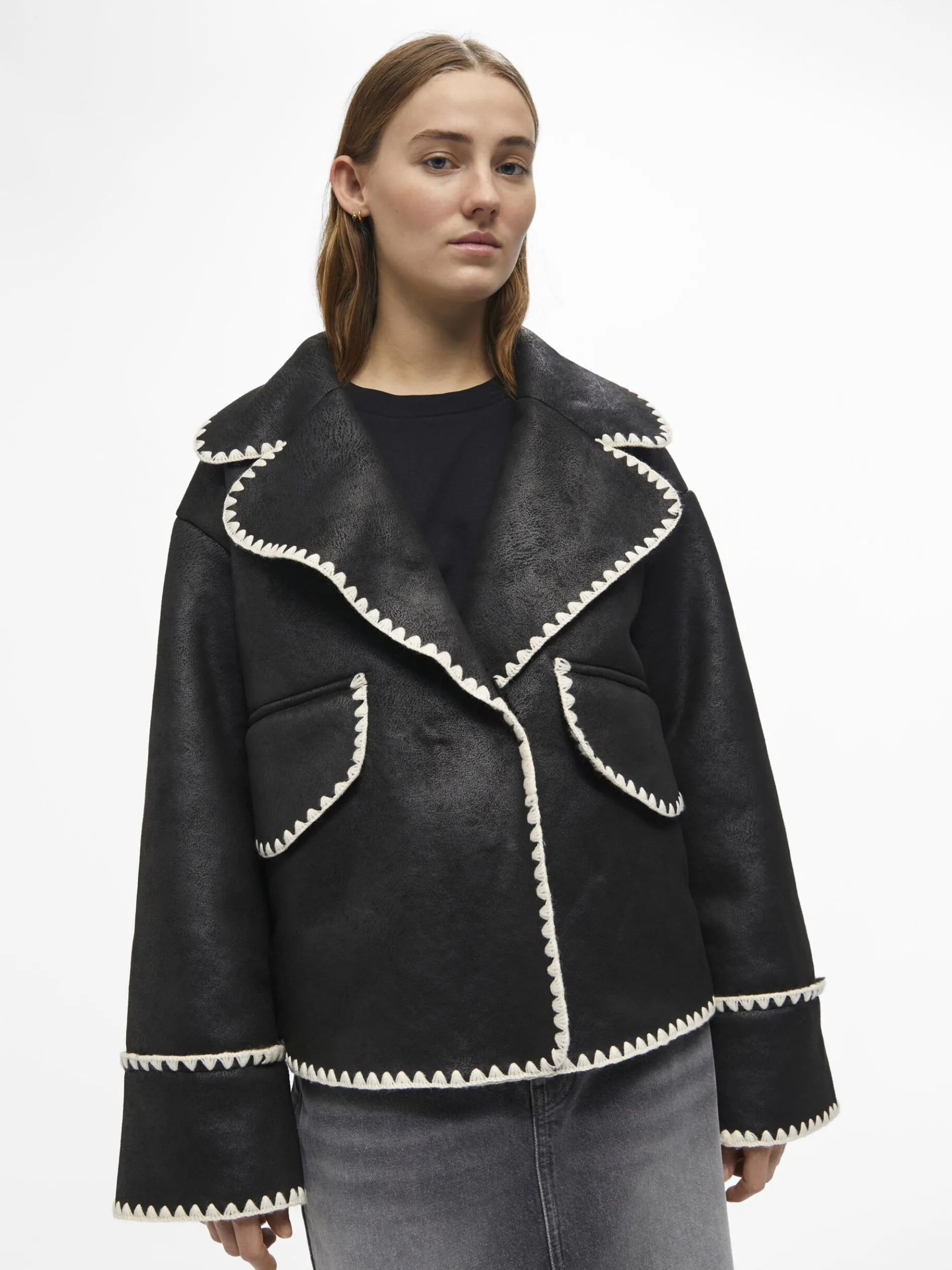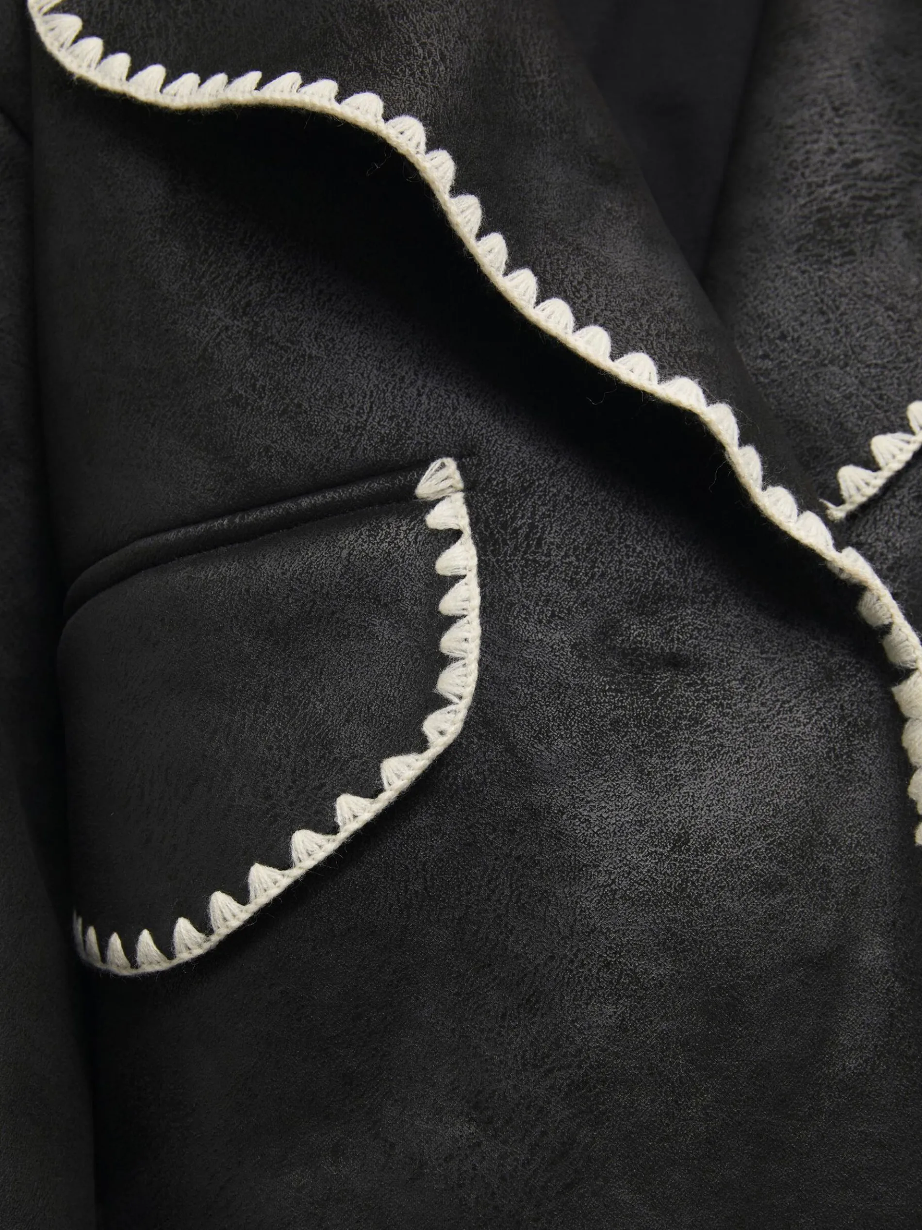 -Suède-look jas- Contrasterende details bij de randen- Oversized revers met inkeping en ronde punten- Lange mouwen met verlaagde schouders- Paspelzakken met klep aan de voorkant- Knoopsluiting aan de voorkant- Relaxed fit- Model draagt maat 36