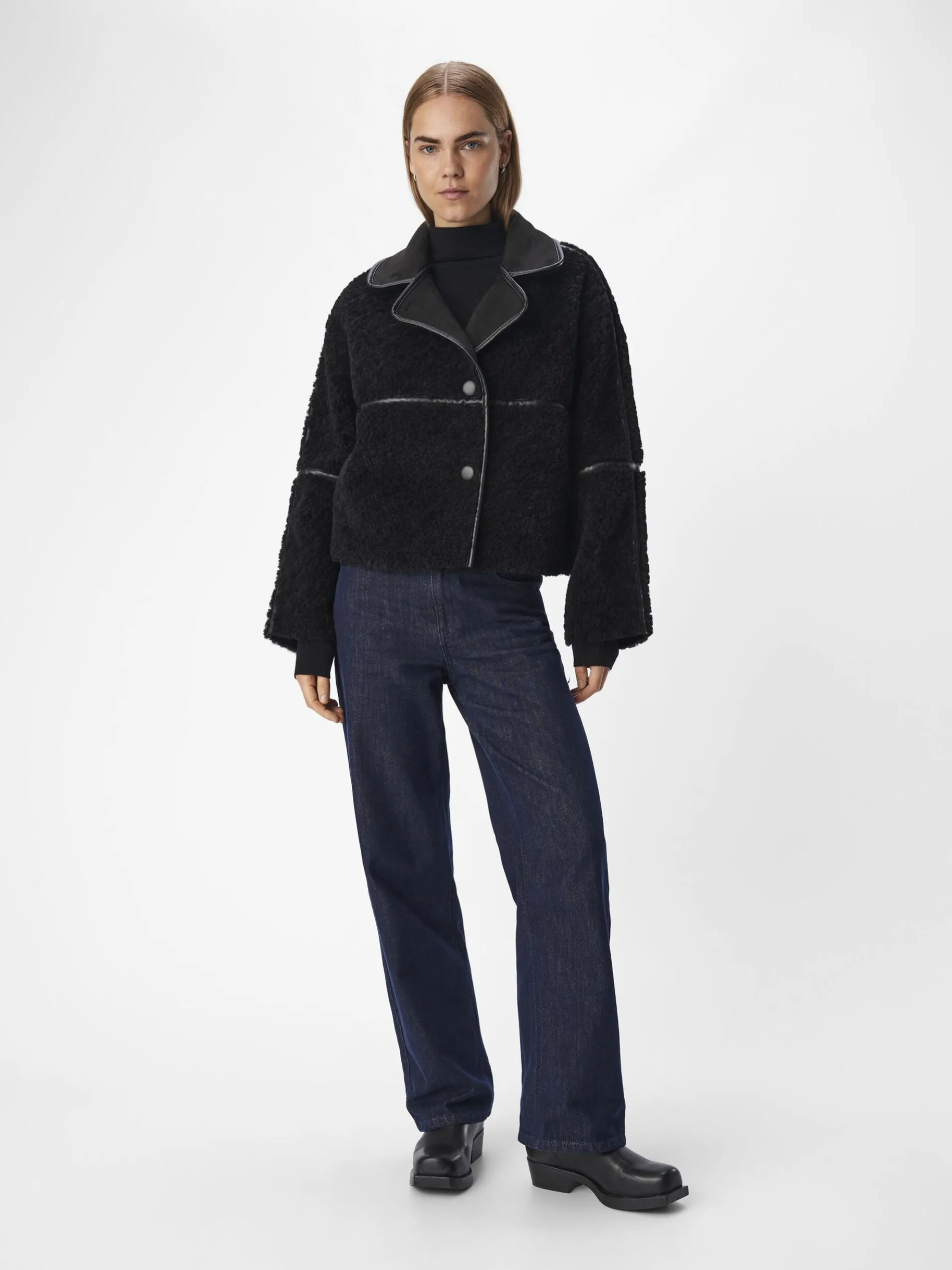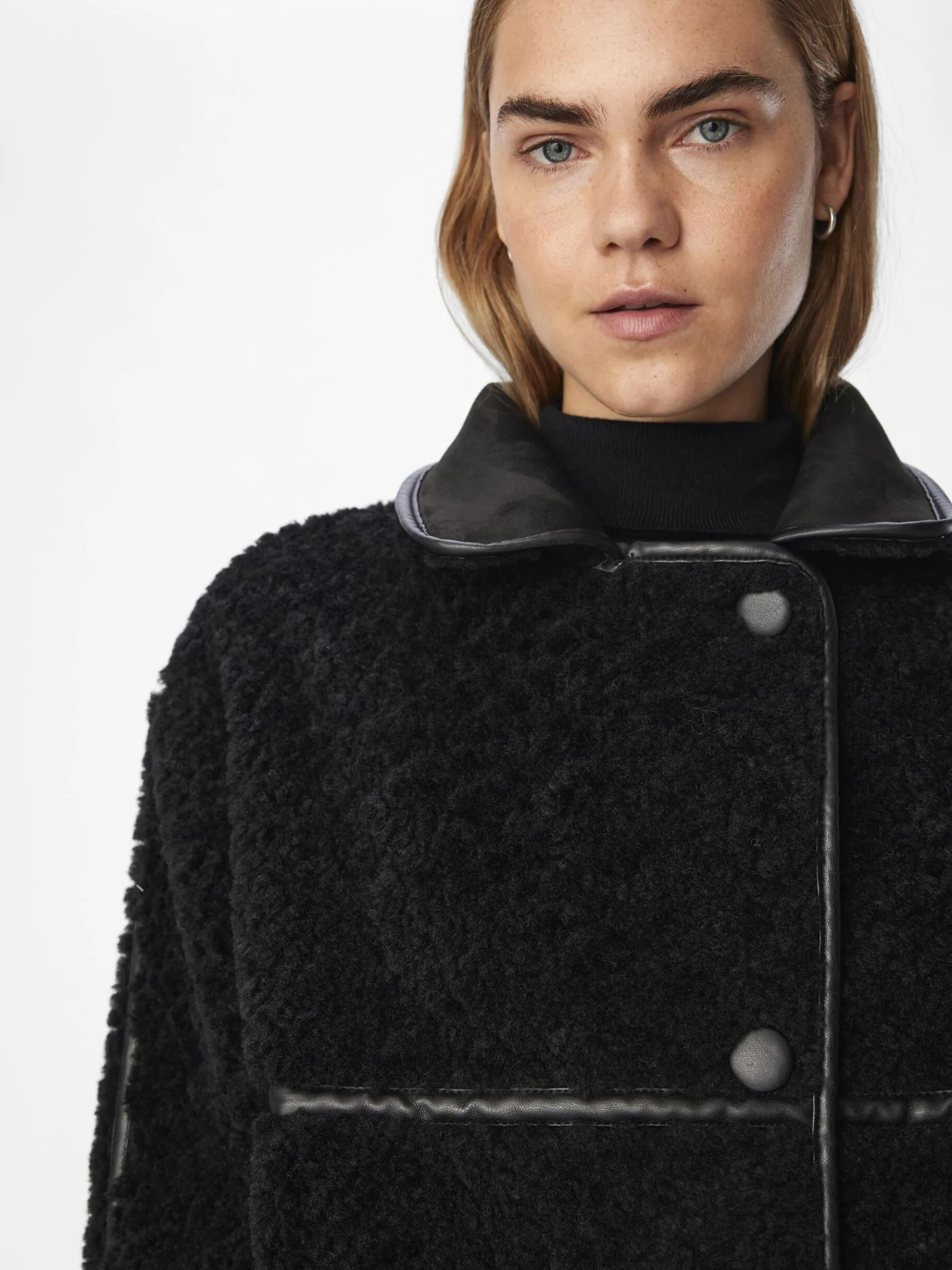 – Kort teddy jack- Oversized kraag- Lage schouders- Lange mouwen- Knoopsluiting aan de voorzijde- Regular fit
