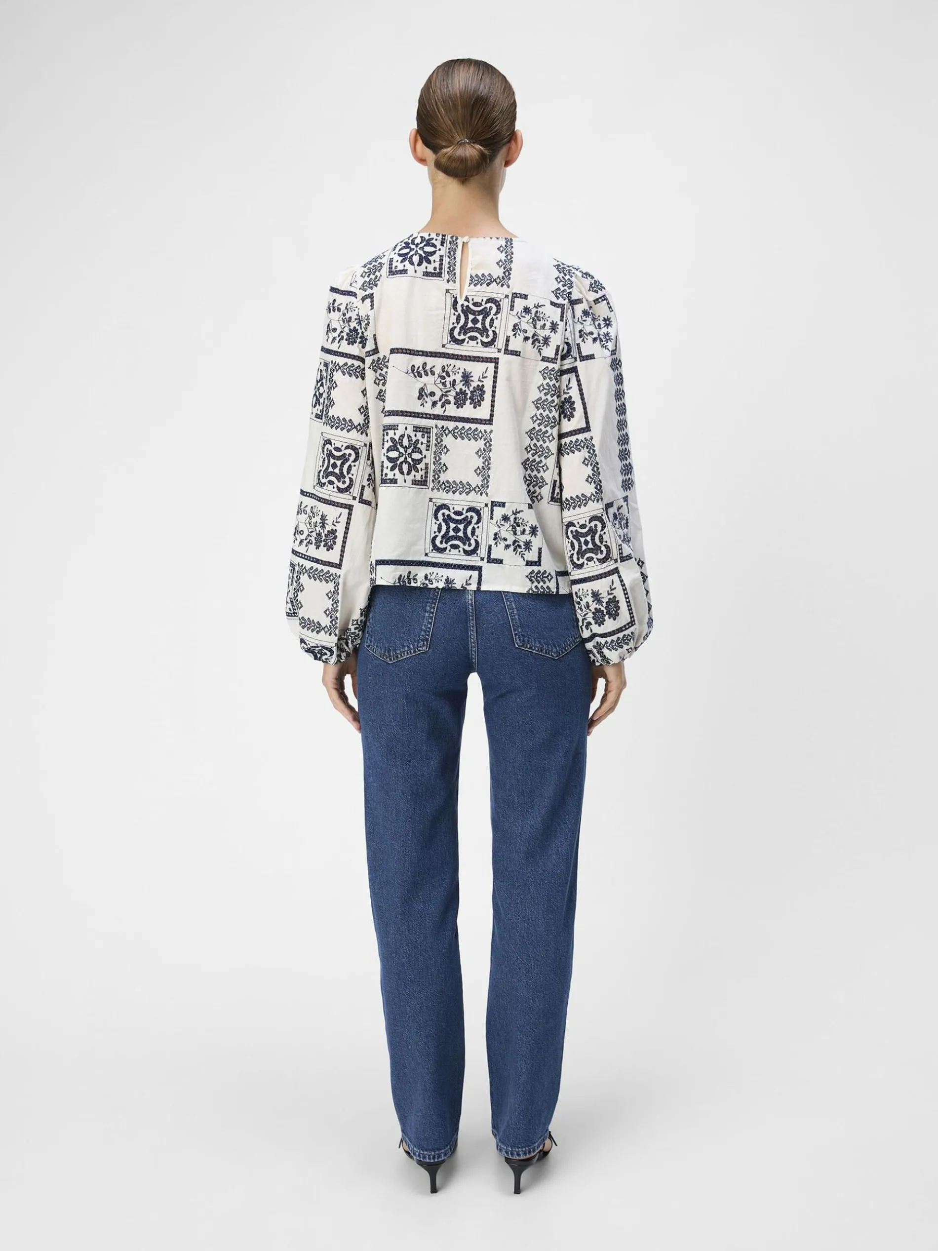 – Top met print en ronde hals- Ballonmouwen- Manchetten met elastiek- Keyholemet knoopsluiting aan de achterkant- Loose fit