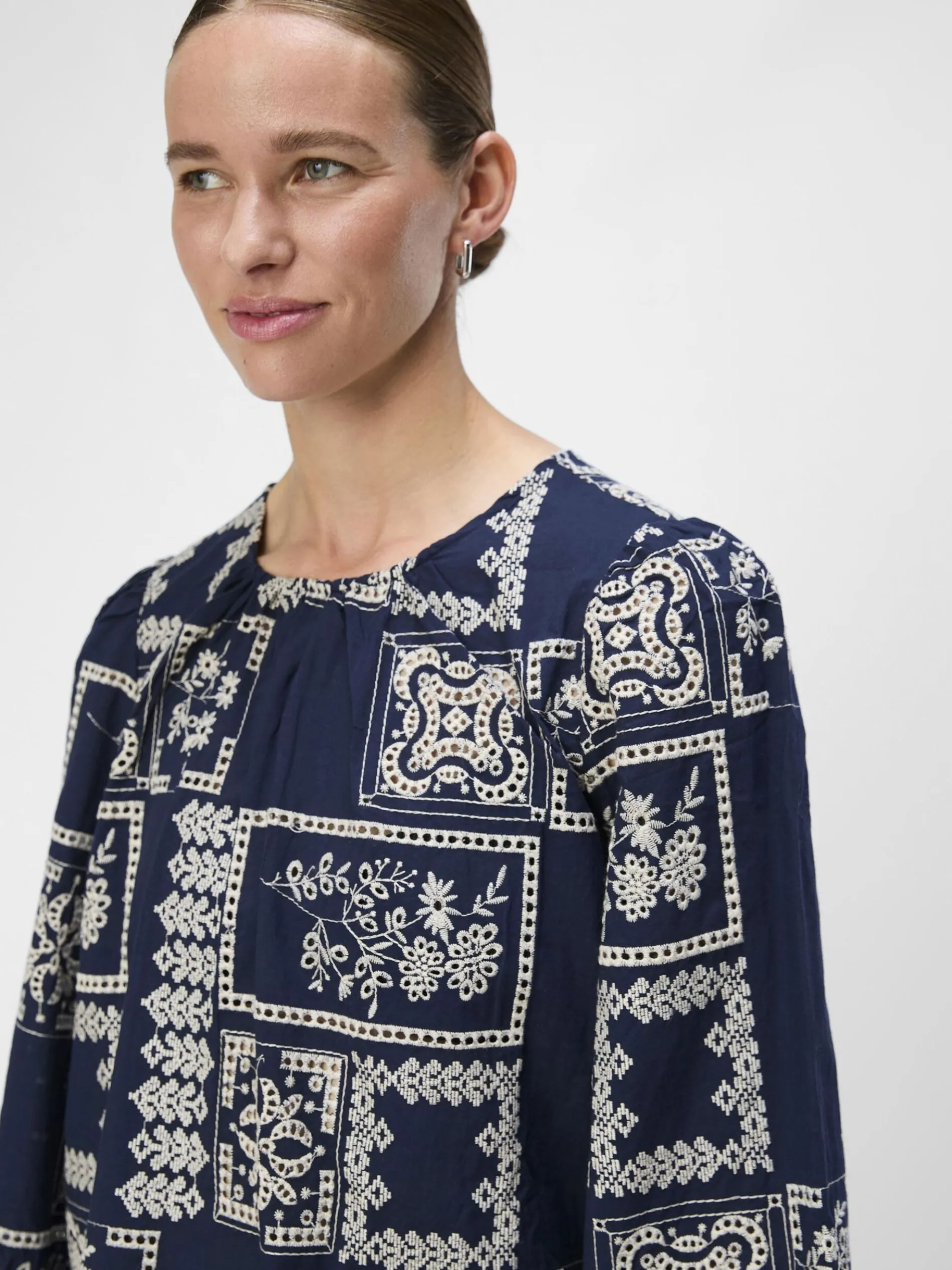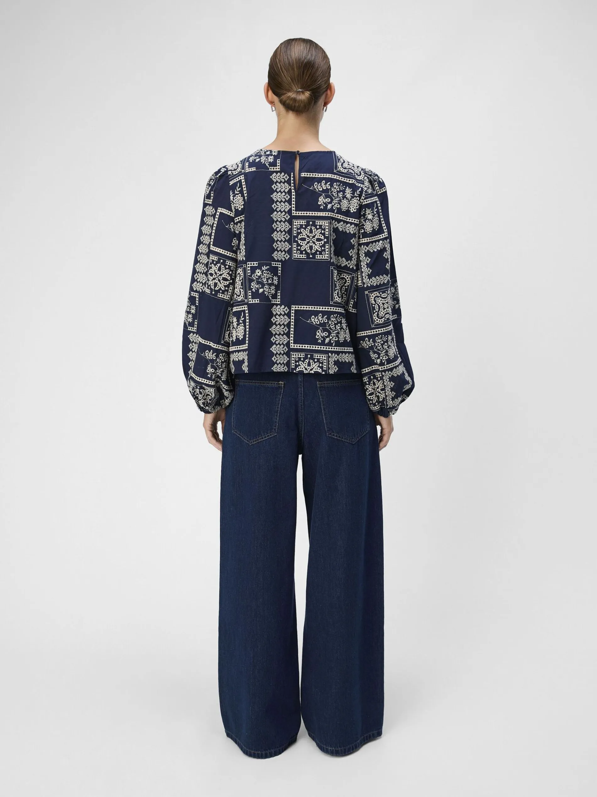 – Top met print en ronde hals- Ballonmouwen- Manchetten met elastiek- Keyholemet knoopsluiting aan de achterkant- Loose fit