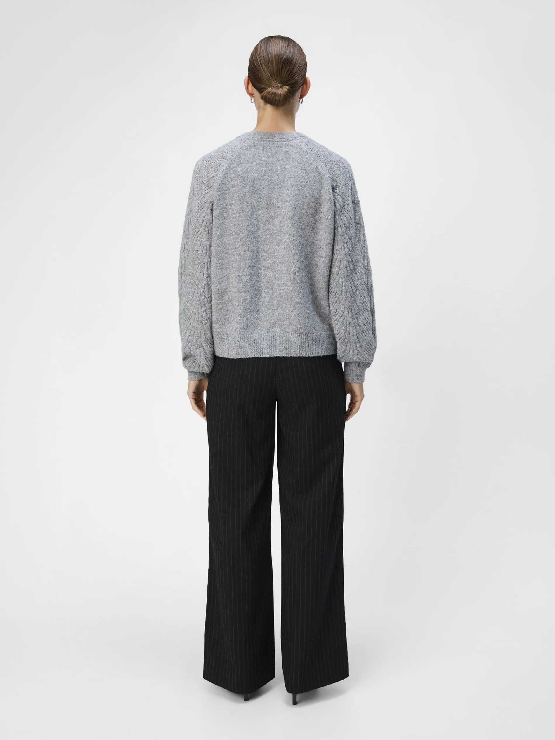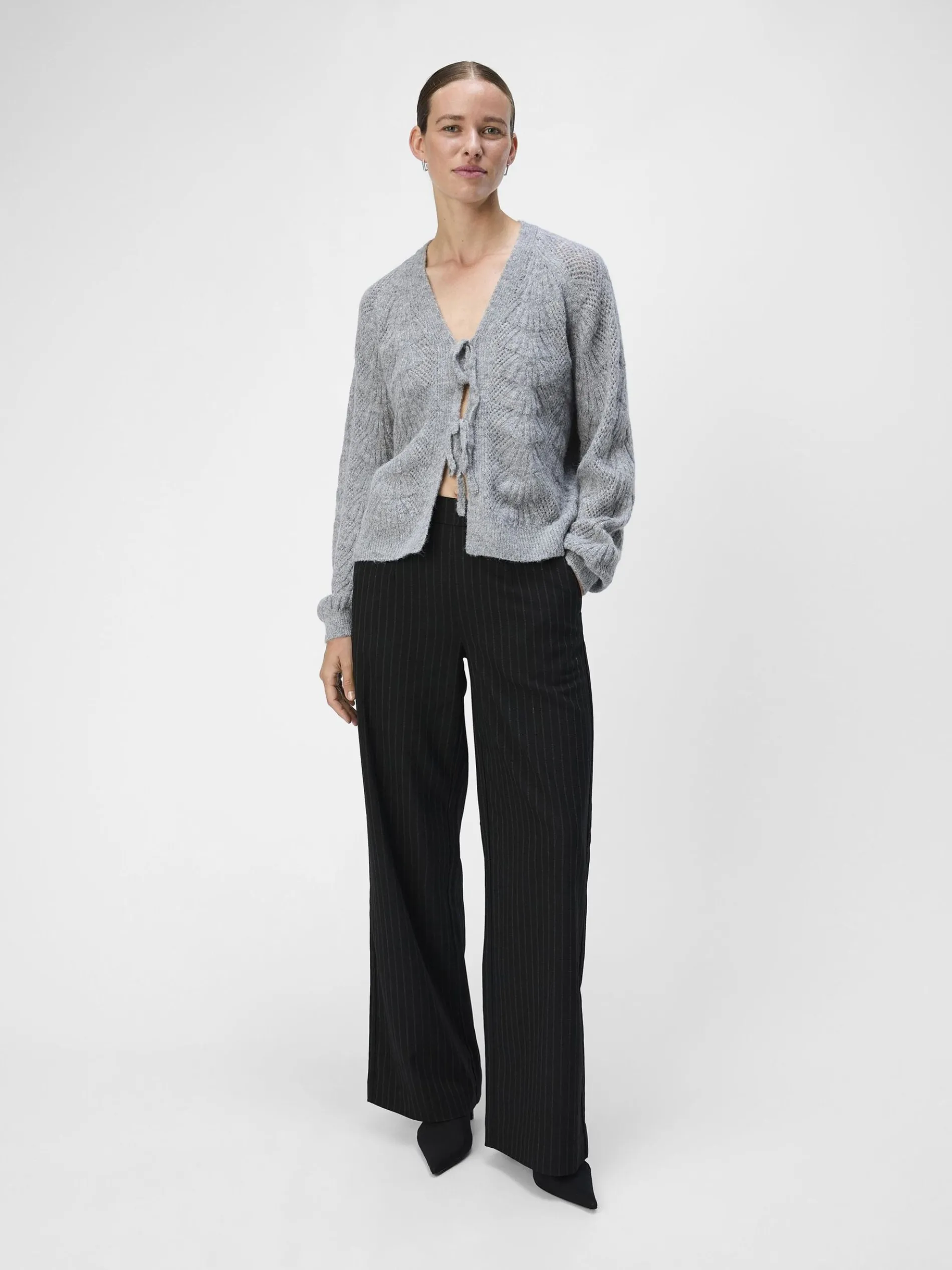 – Gebreid vest met striksluiting aan de voorkant- V-hals- Raglanschouders- Lange volumineuze mouwen- Knit met dessin- Regular fit- Model draagt maat 36